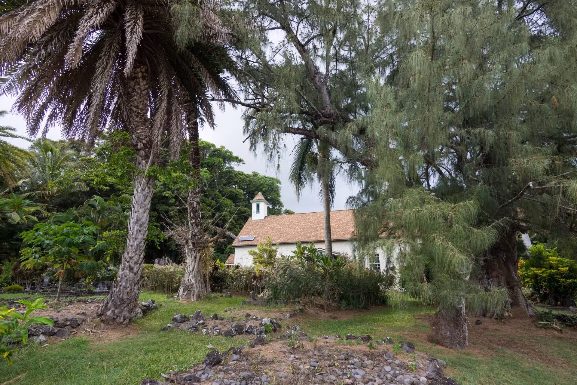 Wir lassen also die sieben gesegneten Schwimmbecken (die gar keine sieben sind und erst recht niemals gesegnet wurden) gleich links liegen. Prompt nimmt auch die Betriebsamkeit auf der Straße ab. Die meisten Touris drehen hier um und fahren über den Hāna Highway zurück zu ihrem Ausgangspunkt, da die Straße hinter Kipahulu zu einer einspurigen, schlaglochübersäten Schotterpiste wird, vor deren Befahrung mit Mietwagen abgeraten wird – vor allem von den Mietwagenfirmen. Wir werden sehen. Bevor es so weit ist, legen wir in Kipahulu noch einen Stopp an der Palapala Ho'omau Church ein, auf deren Friedhof sich das Grab des Luftfahrtpioniers und Schwerenöters Charles Lindbergh befindet, der hier 1974 an Lymphdrüsenkrebs starb. Das Grab ist ähnlich schlicht wie die Kirche, aber es gibt mit Sicherheit schlechtere Orte zum Abliegen der Ewigkeit als das tropische Ambiente von Kipahulu.