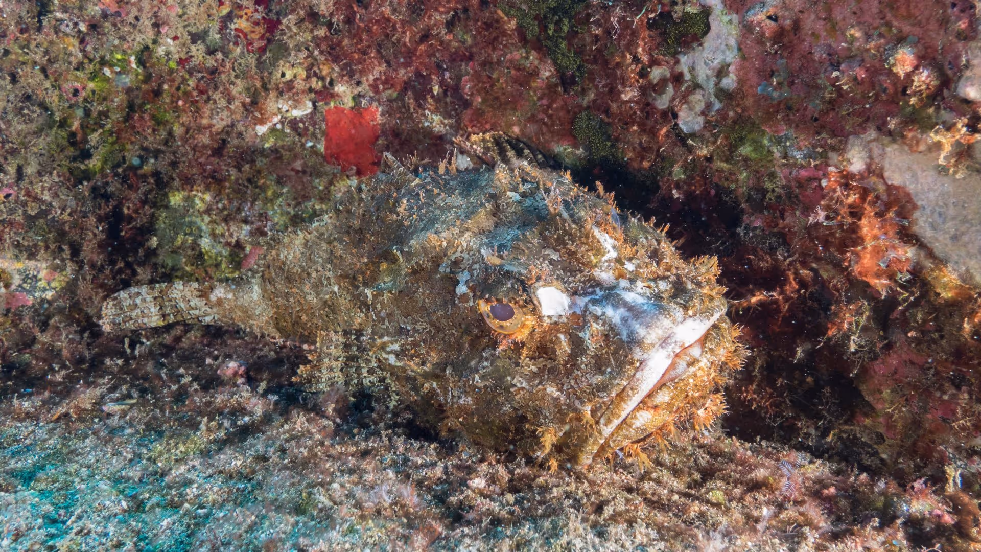 Nach der Schnorchelei geht es zur Red Island, die sich topografisch deutlich von den bisher gesehenen Plätzen unterscheidet. Um eine ausgedehnte Sandfläche zieht sich halbkreisförmig ein flaches Riff aus Vulkangestein, an dem wir entlangtauchen und uns der marinen Kleinlebewesen erfreuen. Nicht spektakulär, aber eine schöne Spielwiese, nicht nur für Fotografen.