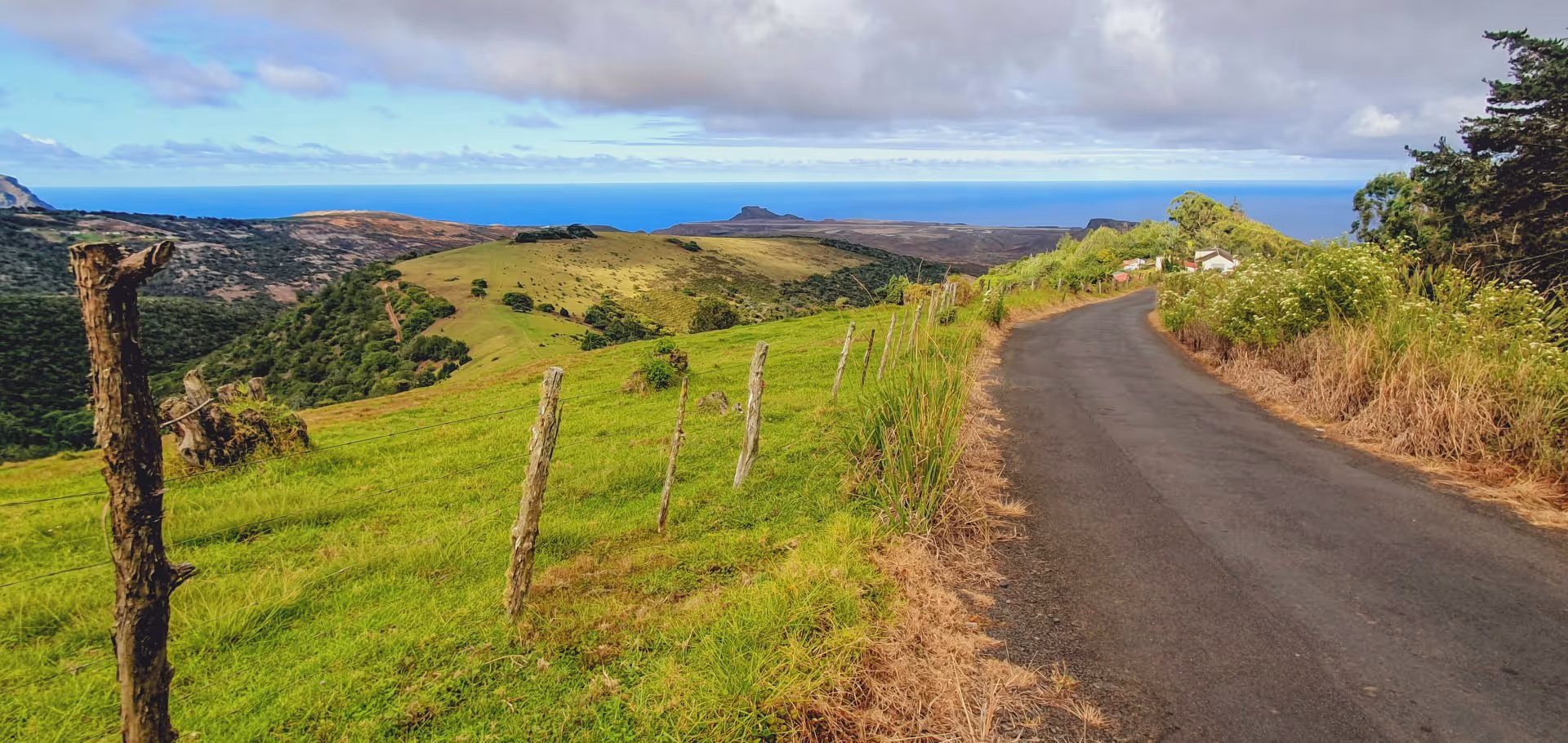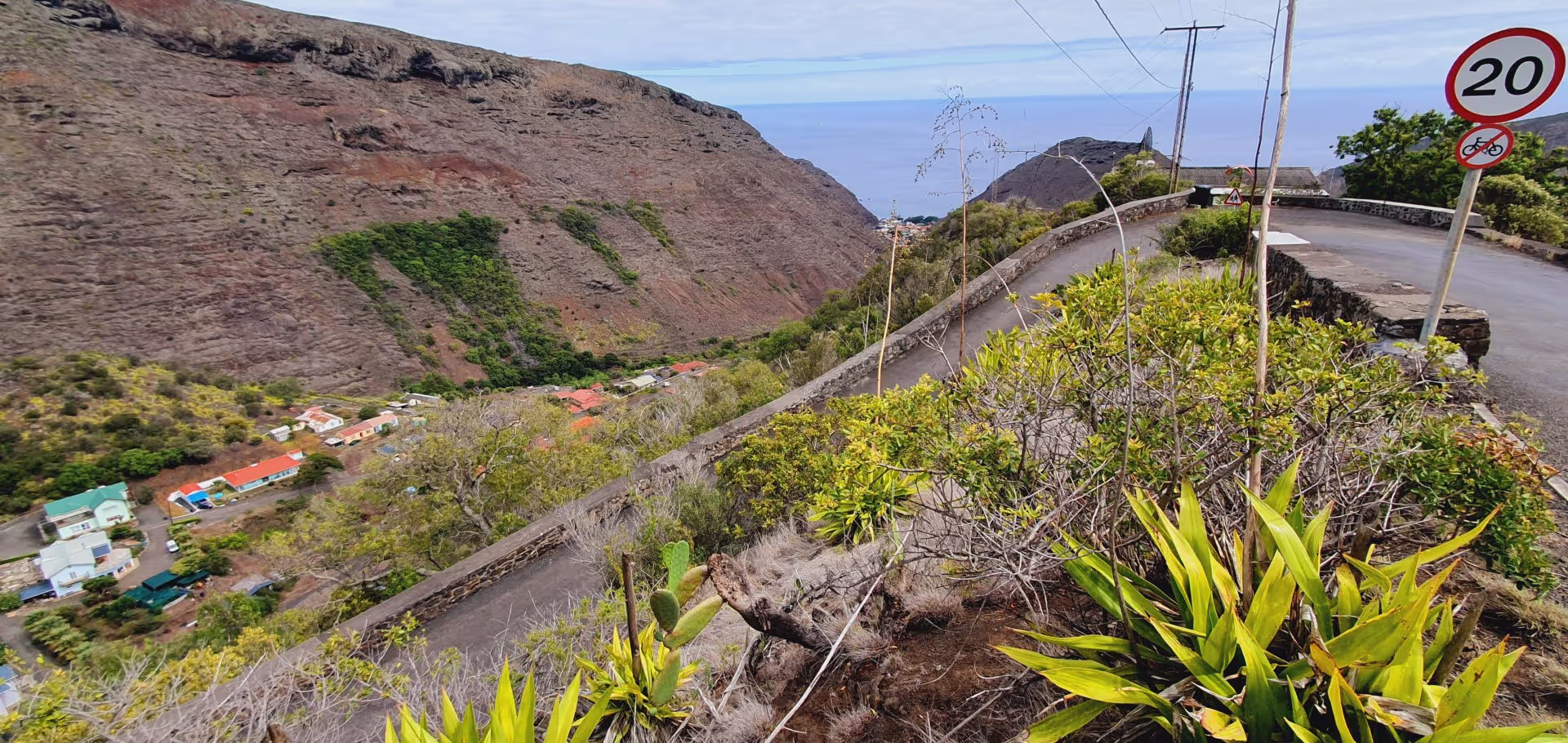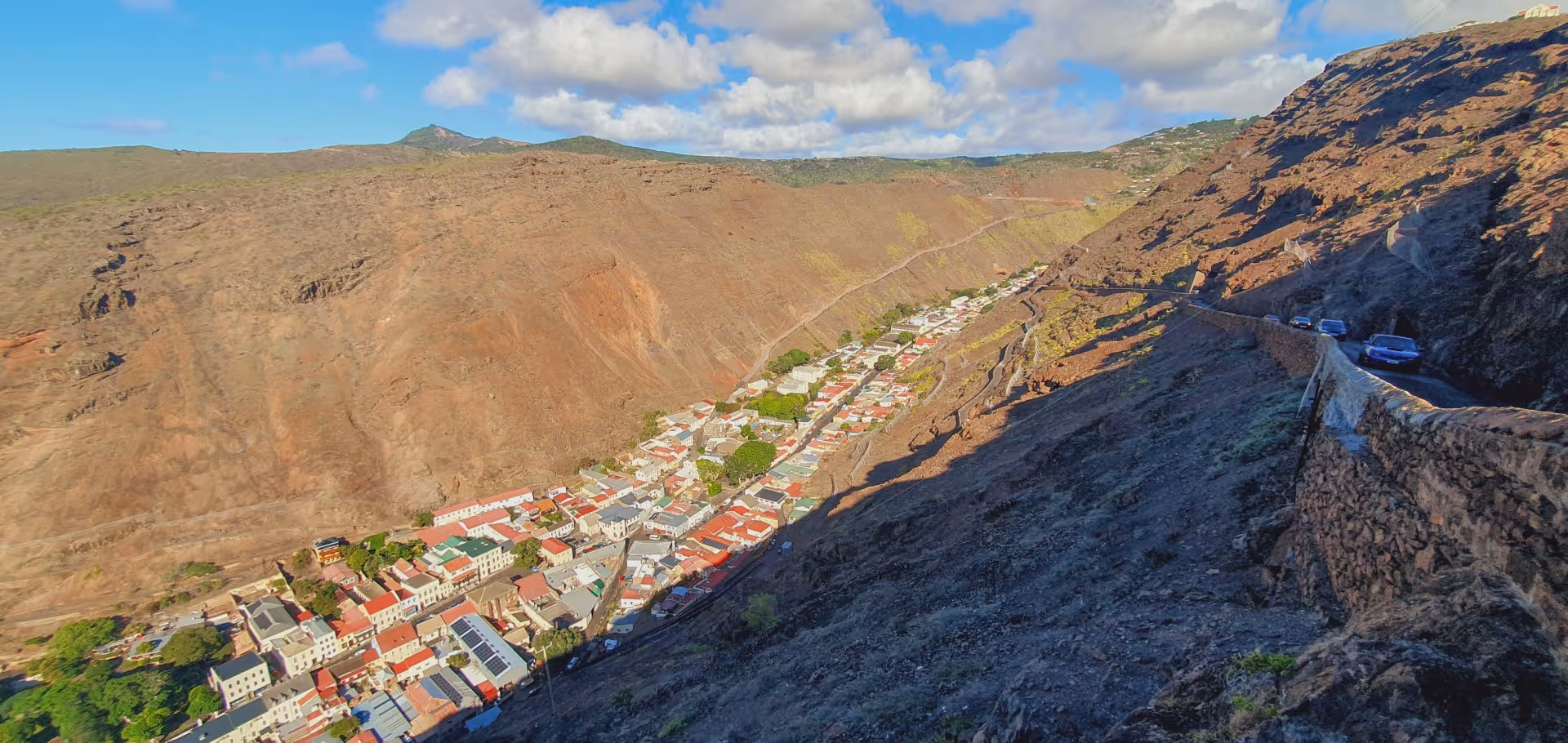 Nach einer zweistündigen Siesta schnappen Silke, Jürgen und ich uns um 15 Uhr unseren Nissan Note und gehen auf Inselerkundung. Das Autofahren auf dem britischen Überseegebiet ist - mal ganz abgesehen vom Linksverkehr - am Anfang etwas gewöhnungsbedürftig: Der Großteil des 138 km langen Straßennetzes (davon 20 km unbefestigt) ist einspurig und es geht eigentlich immer entweder rauf oder runter. Das bergauffahrende Auto hat Vorfahrt vor dem bergab fahrenden, auch wenn das bedeutet, dass dieses beliebig lange bis zur nächsten Ausweichbucht zurücksetzen muss. Die generelle Geschwindigkeitsbegrenzung beträgt 30 mph (ca. 48 km/h), kann aber an bestimmten Stellen auch niedriger sein, ohne dass dies extra gekennzeichnet ist. Schneller geht es sowieso fast nirgends, da der Zustand der Straße und die unübersichtlichen Kurven dies nicht zulassen. Einen ausführlichen Bericht über das Autofahren auf St. Helena kann man hier nachlesen.