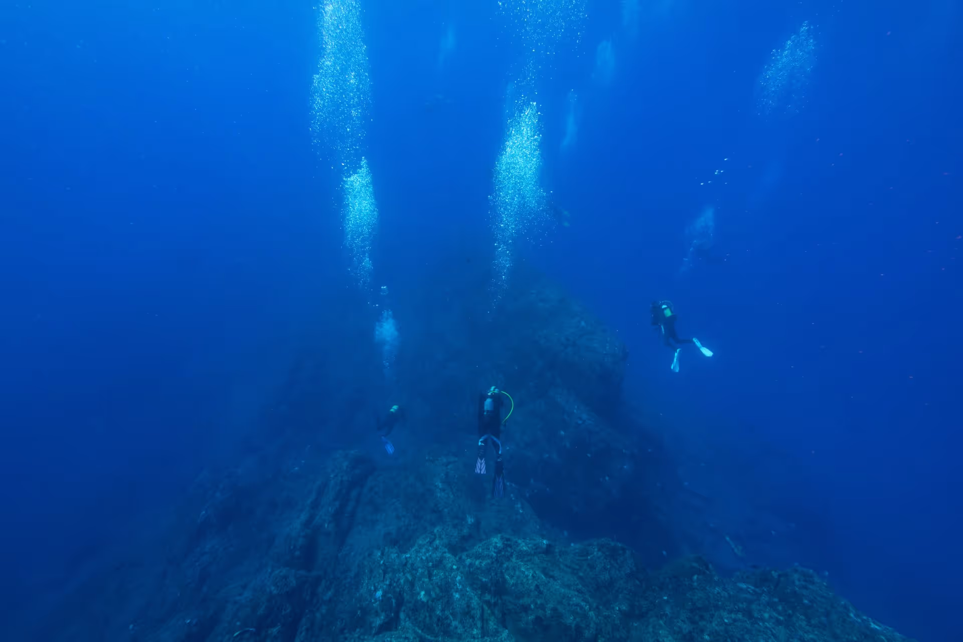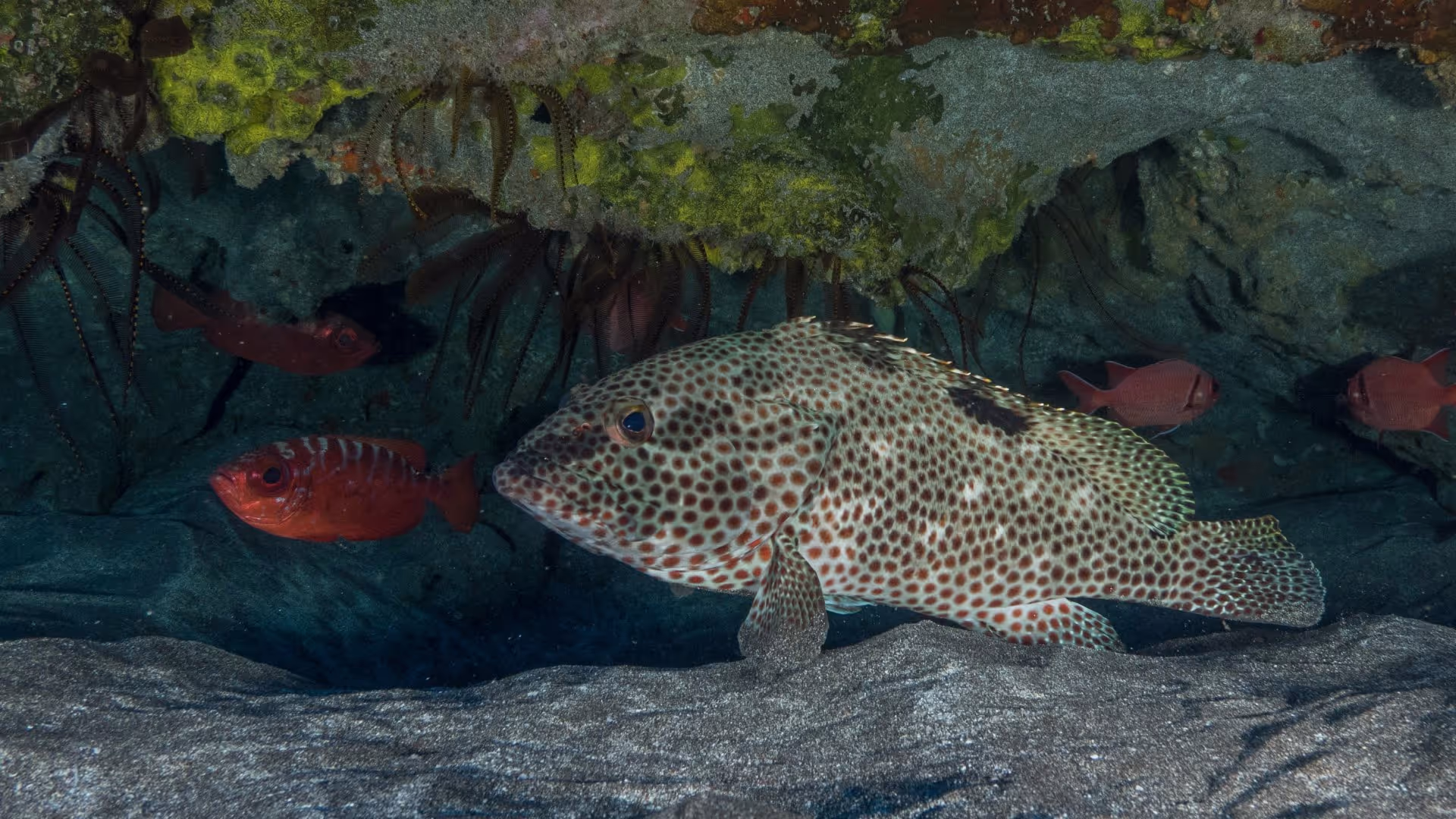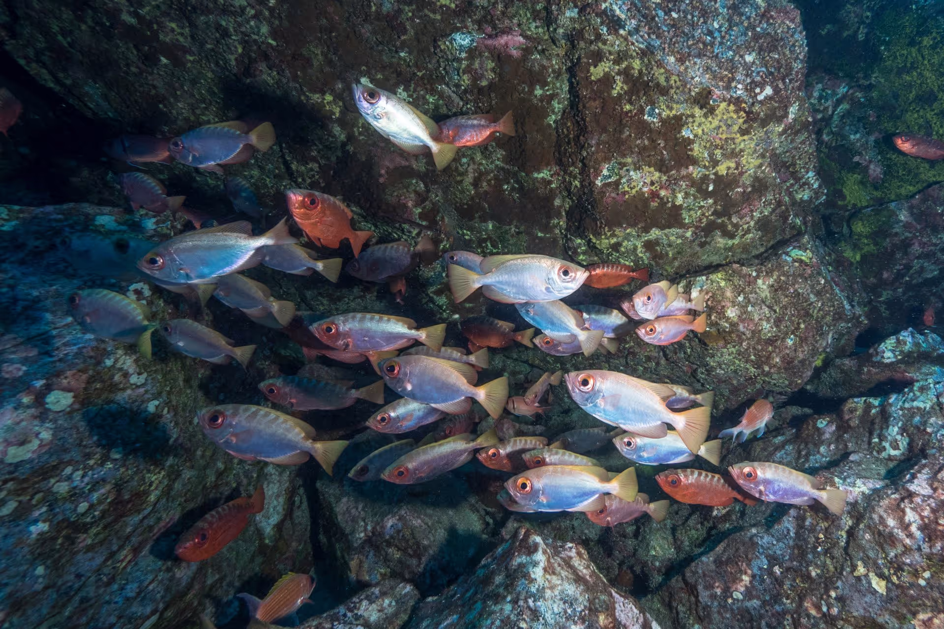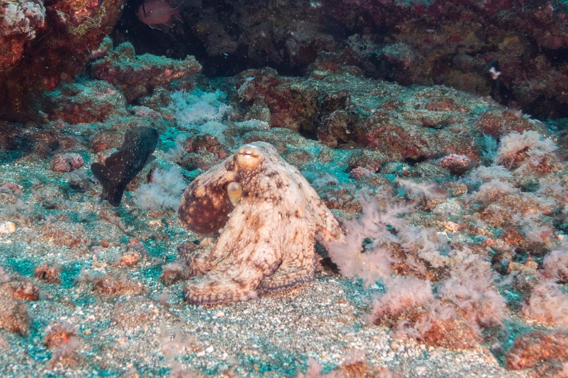 Der erste Platz am dritten Tauchtag heißt Lighter Rock. Der Felsen liegt unter Wasser und ragt nur minimal über die Wasseroberfläche hinaus. Seinen Namen hat er von seiner wesentlich helleren Farbe im Vergleich zum dunklen Vulkangestein der umgebenden Steilküste. Unter Wasser ist der Fels über einen Grat mit Cat Island verbunden, wo es auch einen 15 Meter langen Tunnel zum Durchtauchen gibt, den wir uns naürlich nicht nehmen lassen. Ansonsten gleichen Topografie und Fischleben dem schon Gesehenen. Lediglich eine große Schule Rundmakrelen ist Neuankömmling im Logbuch.