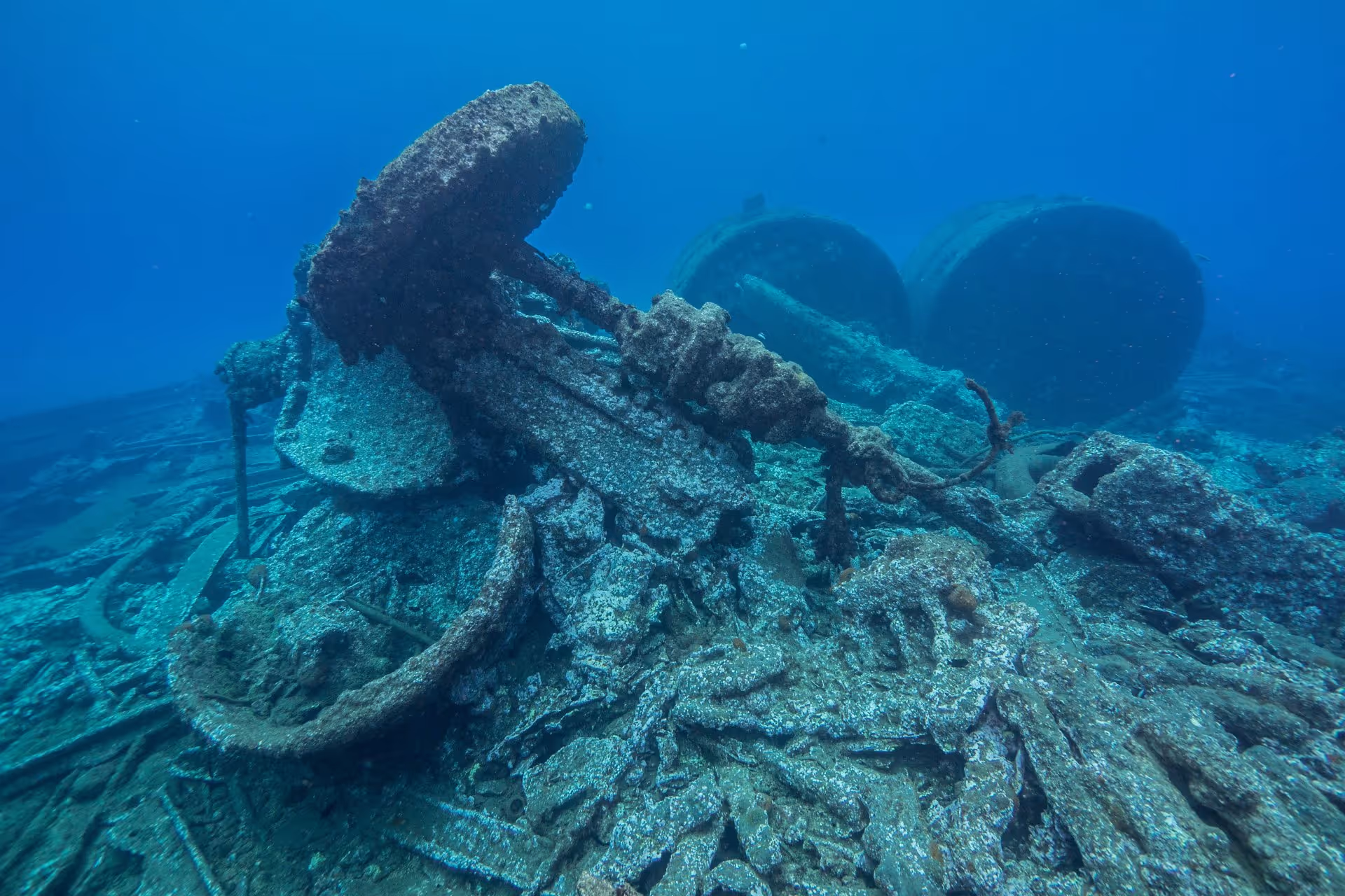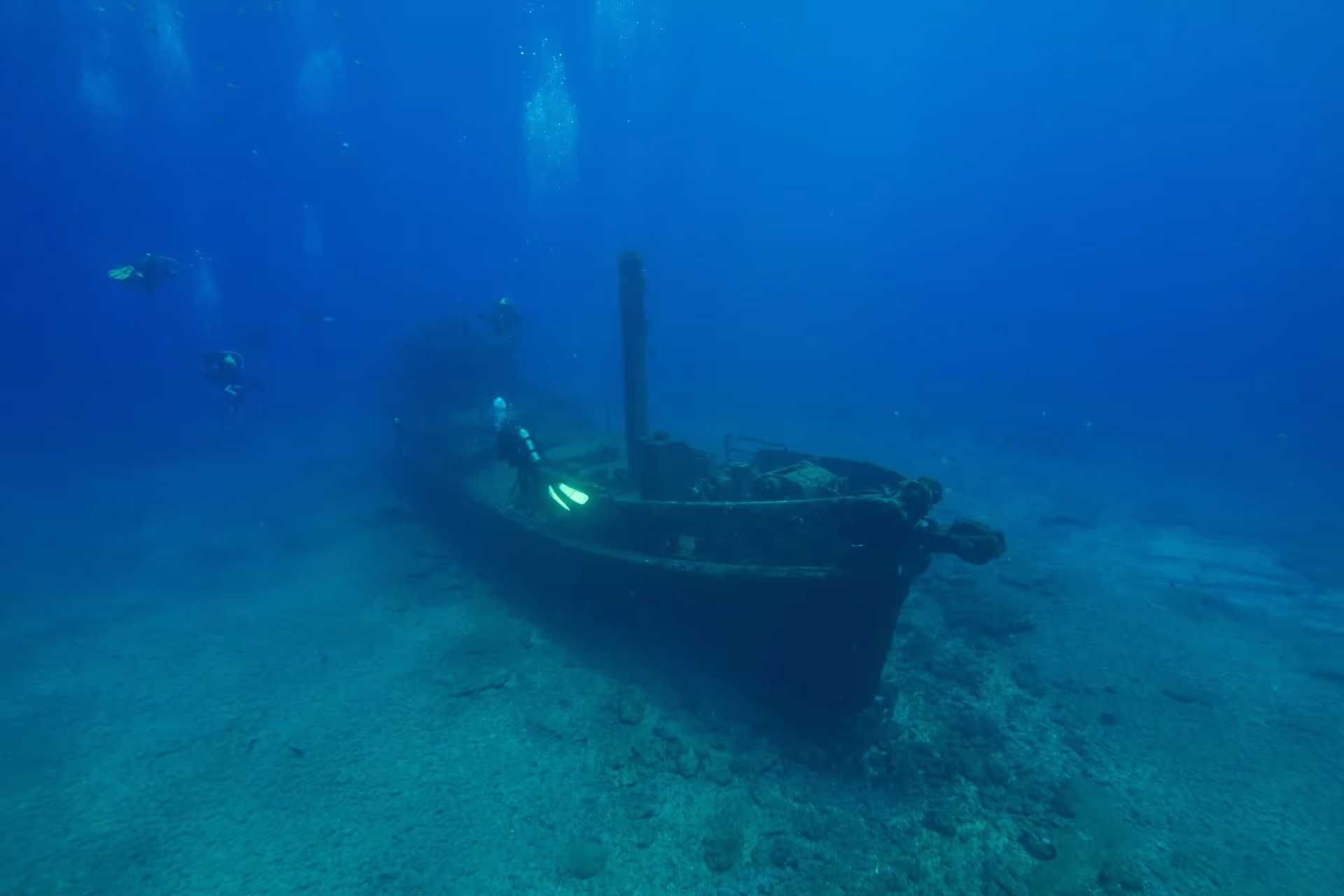 Beim Sprung ins Wasser springt sofort die riesige Meerbarben-Schule ins Auge, die um das Heck streift. Das Wrack ist ein einziger Trümmerhaufen, irgendwo reintauchen geht auch hier nicht. Gut zu sehen sind noch die Dampfkessel, die Überreste einiger Fahrzeuge und ein paar Weinflaschen. Wir überschwimmen die Trümmer zweimal in voller Länge vom Heck zum Bug und wieder zurück. Fischmäßig gibt es keine Überraschungen, aber der Tauchgang diente auch mehr zur Orientierung für den Nachttauchgang heute Abend.
