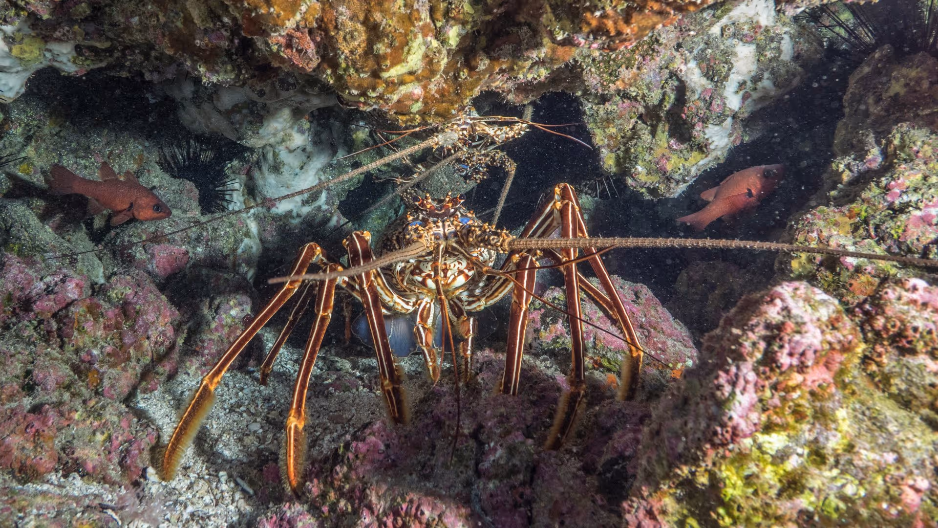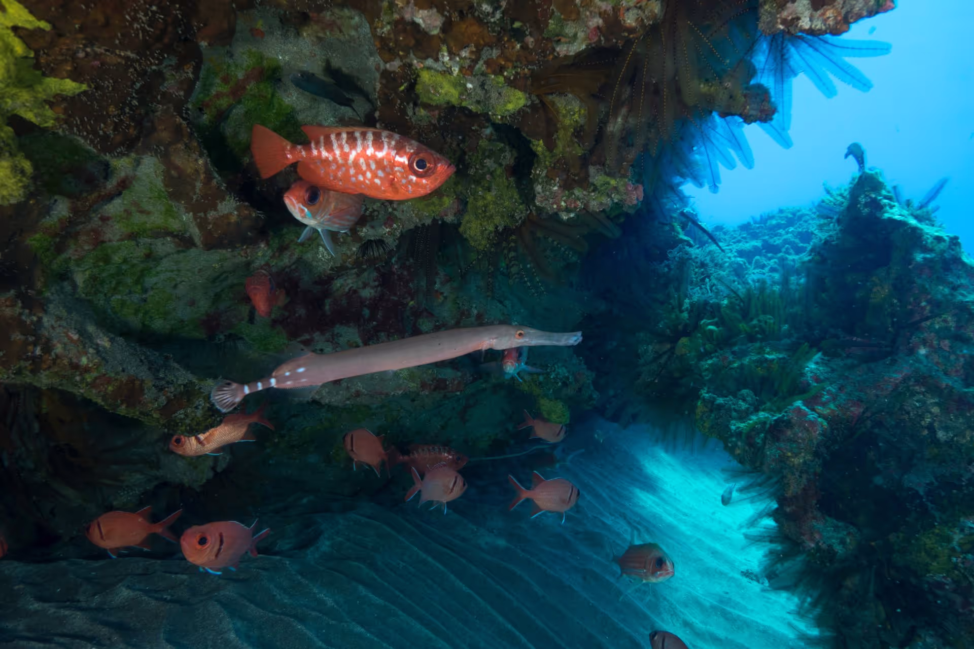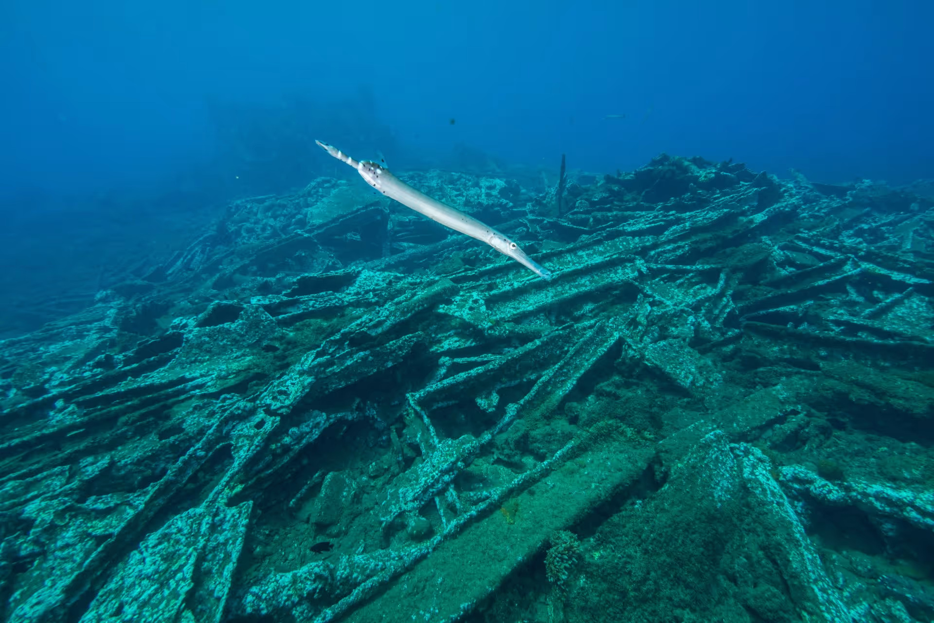 Wie es sich für ein Wrack gehört, wuselt es vor Leben, wobei allerdings nichts dabei ist, was wir nicht auf den ersten drei Tauchgängen schon gesehen haben: Falter- und Soldatenfische in großen Schulen, Langusten, Muränen und natürlich Trompetenfische, die man vor St. Helena an fast allen Tauchplätzen hat. Nach der Erkundung des Wracks wechseln wir zur nahegelegenen Long Ledge und erkunden wie gestern die Tunnel und Spalten im Riff, bevor wir nach einer Stunde zum Wrack zurückkehren und locker austauchen.