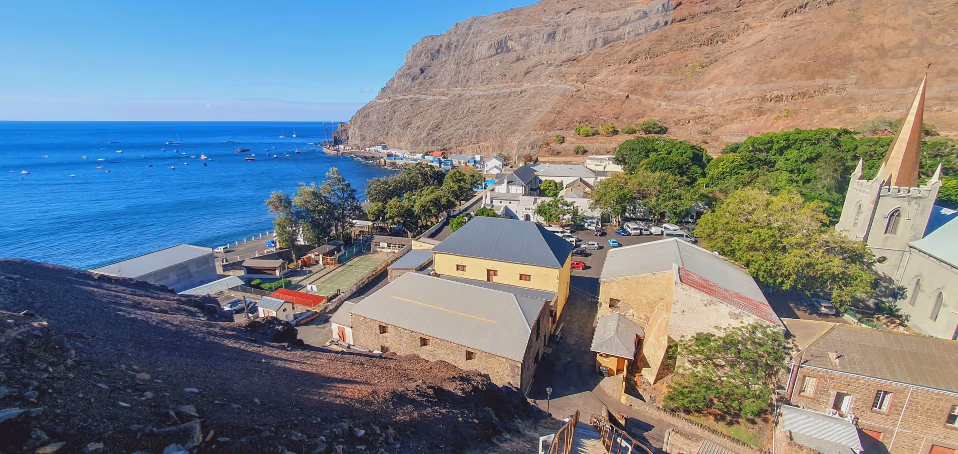 Um trotzdem noch ein wenig Bewegung zu kriegen, versuche ich mich unmittelbar nach der Rückkehr ins Hotel an Jacob's Ladder, die direkt vor der Haustür des Blue Lantern liegt. Hierbei handelt es sich um eine 40 Grad steile Treppe, die in 699 Stufen von Jamestown auf den 180 m höher gelegenen Ladder Hill führt. Ursprünglich befand sich hier eine im Jahr 1829 angelegte, von Maultieren gezogene Schienenseilbahn, die zum Transport von Munition und Vorräten zu den Wehranlagen auf dem Ladder Hill diente. 1871 wurde der Betrieb aufgrund von Termitenschäden an den Schwellen eingestellt. Nach dem Abbau der Seilbahn blieb nur die Treppe übrig, die im Jahr 2022 restauriert wurde und heute neben diesem kleinen, französischen Kaiser die Hauptattraktion St. Helenas ist.