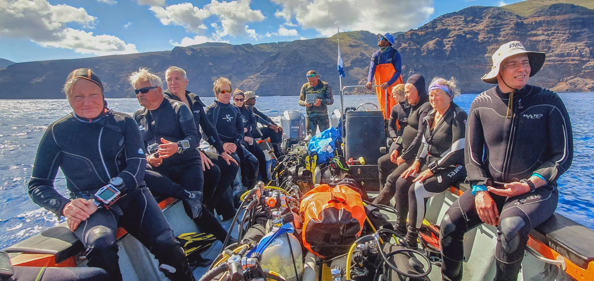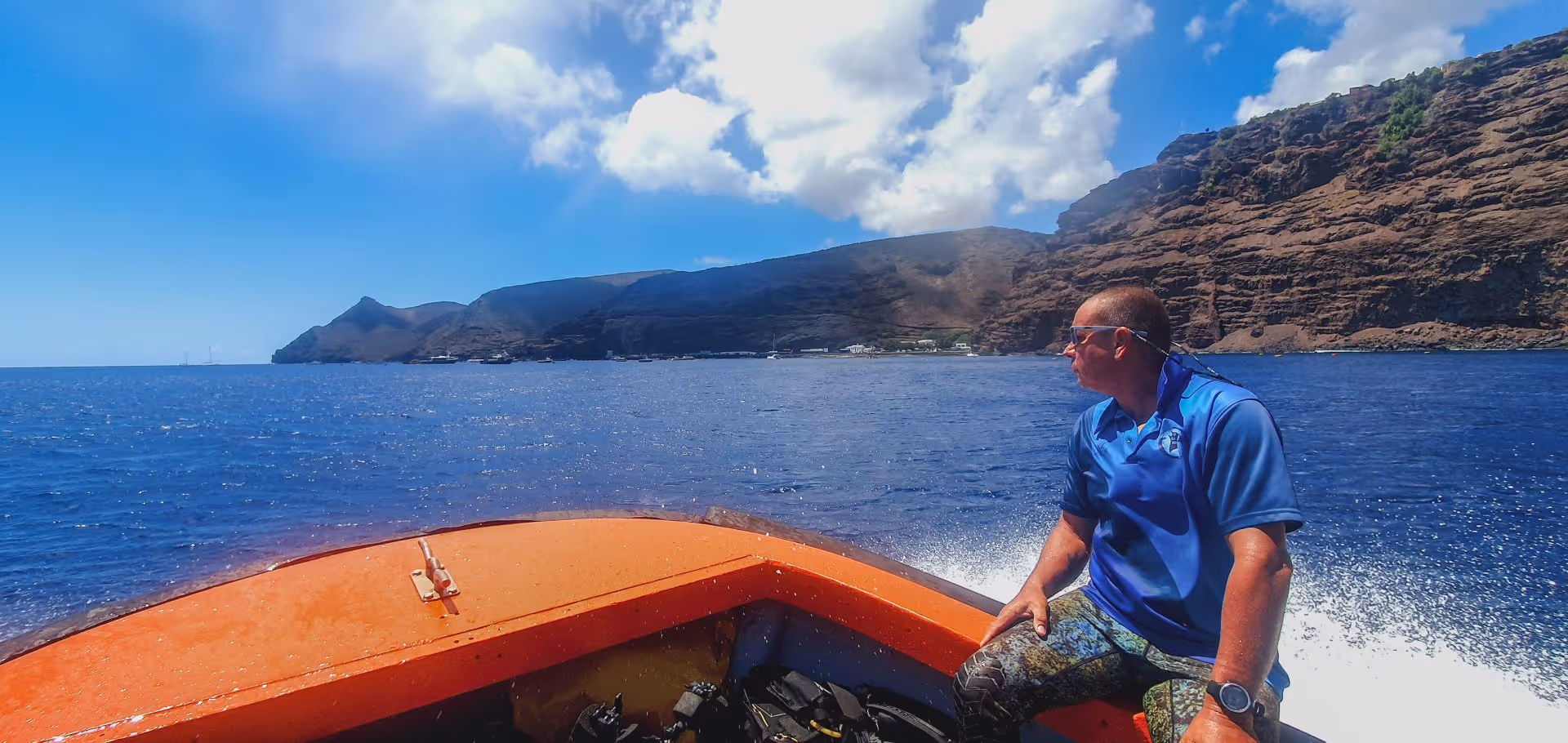 Nachdem sich alle eingerichtet haben, gibt Craig ein ausführliches Tauchbriefing, das sich wie folgt zusammenfassen lässt: Treffpunkt ist morgens um 8:15 Uhr an der Tauchbasis, die sich im Hafen von Jamestown befindet und eigentlich nur eine kleine Lagerhalle ist. Nach dem Anrödeln geht es mit dem Boot raus zu den Tauchplätzen, die sich allesamt entlang der Nordküste St. Helenas befinden, da Wind und Welle auf den anderen Inselseiten fast nie Tauchgänge zulassen. Die maximale Fahrzeit beträgt 25-30 Minuten. Es werden zwei Tauchgänge mit einer Oberflächenpause von einer Stunde durchgeführt. Die maximale Tauchzeit beträgt 60 Minuten, die Maximaltiefe 40 m, wobei sich die meisten Tauchgänge hauptsächlich zwischen 15 und 25 m abspielen werden. In der Regel ist man gegen 12:30 Uhr zurück an der Basis. Am Nachmittag gibt es keinen Tauchbetrieb, sodass man genügend Zeit hat, die Insel über Wasser zu erkunden. Hierzu benötigt man zwingend einen Mietwagen, wovon es nur vier auf der Insel gibt – allesamt zu buchen über Keith oder besser schon bei Buchung der Reise über Waterworld.