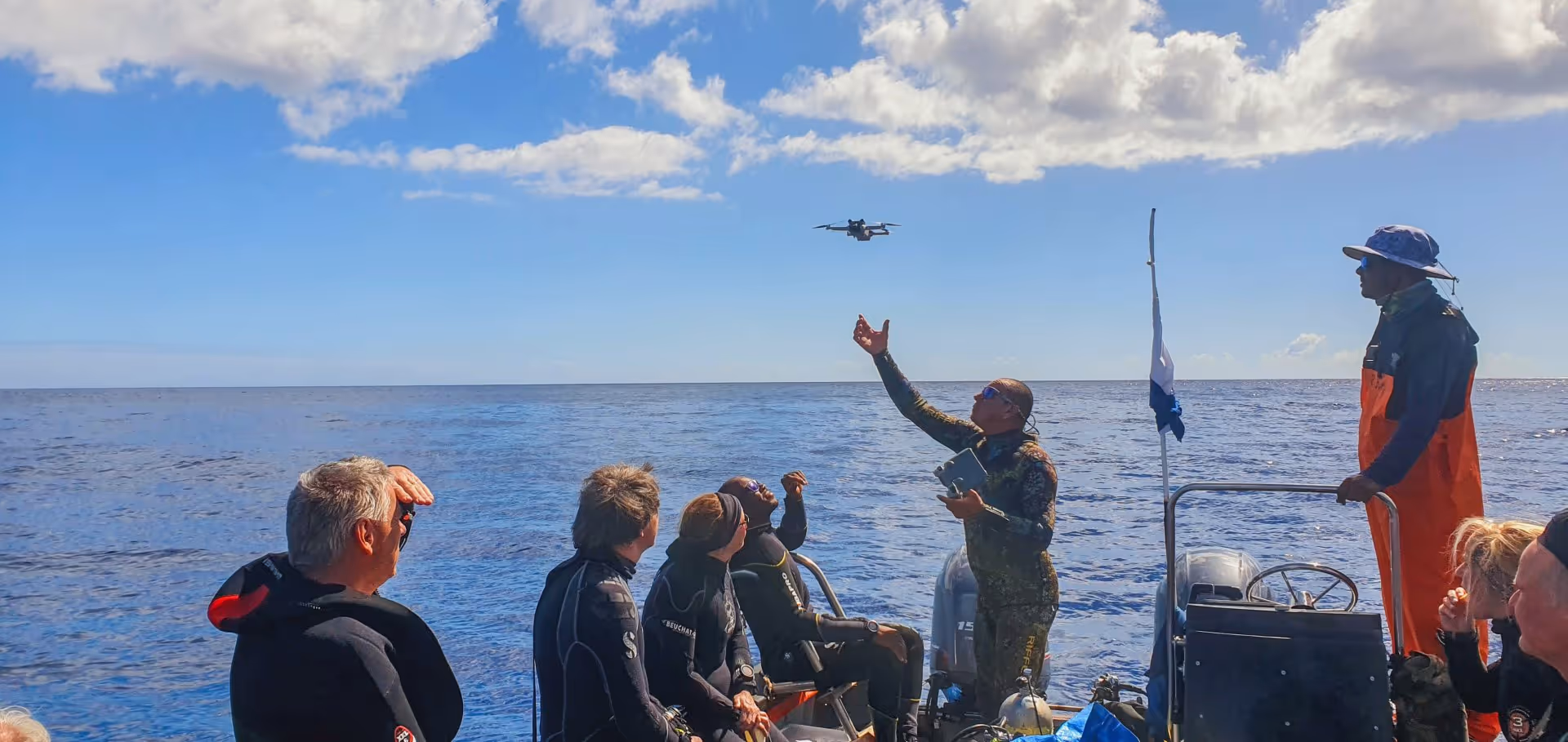 Die Oberflächenpause nutzen wir, um zu unserem nächsten Tauchplatz zu tuckern, wobei uns netterweise eine große Schule Schlankdelfine (200-300 Tiere) Gesellschaft leistet. Dies ist die häufigste Delfin-Art vor Sankt Helena. Die Tiere sind vor allem morgens sehr aktiv und vollführen teils spektakuläre Sprünge, wenn sie in Spiellaune sind.