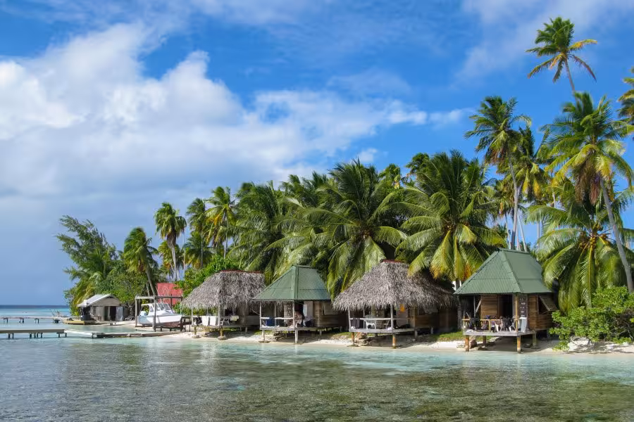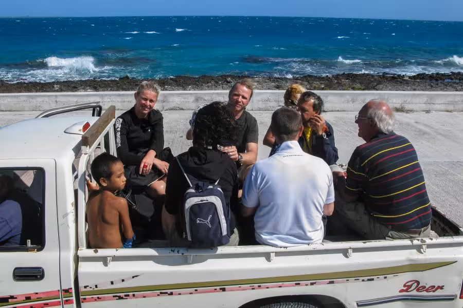 Die Flieger werden immer kleiner. Da der schnellste Weg zwischen zwei Punkten eine Gerade ist, fliegen wir ein Dreieck und legen noch einen Zwischenstopp in Manihi ein, bevor wir Kurs auf Fakarava nehmen. Die Flughafenfeuerwehr wartet schon gespannt, ob dieser Flieger endlich in Flammen aufgeht, aber im Gegensatz zu Supermärkten brennen Flugzeuge nicht so schnell. Annabelle, die Chefin des Tetamanu Village (unsere Heimstatt für die nächsten 5 Tage), wartet schon mit ein paar Helfern auf uns. Während der Flughafen ganz im Norden des zweitgrößten Atolls Polynesiens liegt, befindet sich das Tetamanu Village ganz im Süden, auf einer kleinen, nur per Boot erreichbaren Insel, auf der es nur ein paar Trampelpfade gibt. Nachdem Gepäck und Vieh auf den Pickups verstaut sind, geht es erstmal 20 min südwärts, bis die Straße endet. Dann wird alles auf ein kleines, halboffenes Boot umgeladen, mit dem wir nochmal 2 Stunden durch die Lagune schippern, wobei wir genug Zeit haben, uns bei strahlendem Sonnenschein in Südseestimmung zu bringen. In Tauchstimmung kommen wir gleich mit, denn da es etwas Welle hat, sind wir klatschnass, als wir in Tetamanu ankommen. Das Village ist sehr übersichtlich, ein auf Stelzen erbauter Restaurantbereich, eine kleine Tauchbasis, zwei Strandbungalows links, vier Strandbungalows rechts und ein Bootsanleger, das ist alles. Im glasklaren Flachwasser des Korallenriffs schwimmt schon das Willkommenskomitee herum. Nach dem Begrüßungsumtrunk richten wir uns in unseren Strandbungalows häuslich ein. Die Bungalows sind "very basic", kein Strom (gibt's nur im Restaurantbereich), kein warmes Wasser, die Dusche plätschert etwas spärlich vor sich hin und die Moskitonetze erinnern verdächtig an Scherenschnitte, weswegen wir lieber unsere eigenen aufspannen. Luxus hat man in Tetamanu nicht, man kann sich voll und ganz auf das Wesentliche konzentrieren und das heißt "Tauchen". Direkt um die Ecke, nur 5 Minuten Bootsfahrt entfernt, befindet sich der Kanal, der die Lagune mit dem Pazifik verbindet. Er hört auf den schönen Namen "Tumako Hua", was soviel heißt wie "Sex der Haie". Haie soll es hier genug geben, zwischen 50 und 400 Graue Riffhaie halten sich ständig im Kanal auf, erklärt uns Nicolas, neben Chef Sanny der einzige Tauchguide unter den Village People. Was mit dem Sex ist, ist jedoch unklar, den werden wir wohl eher nicht zu sehen bekommen.
