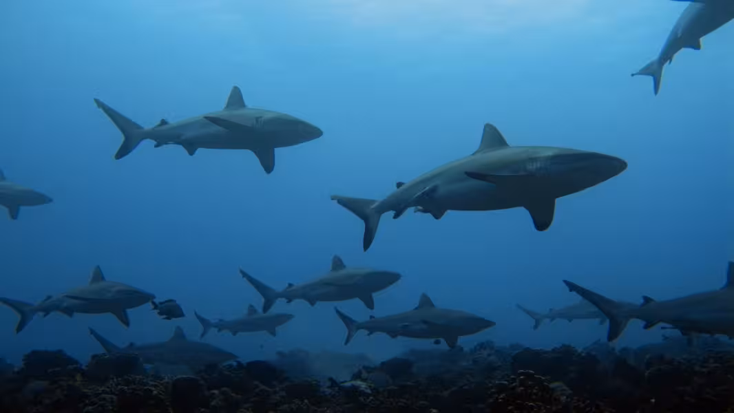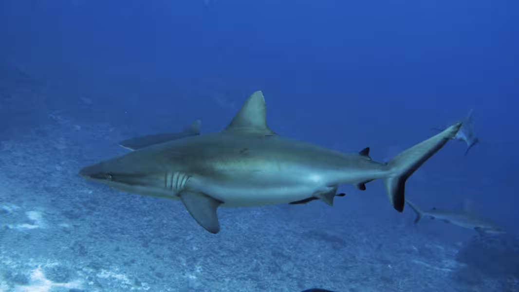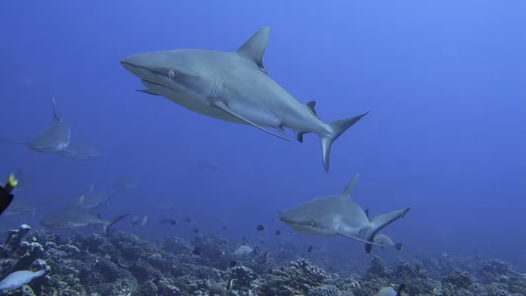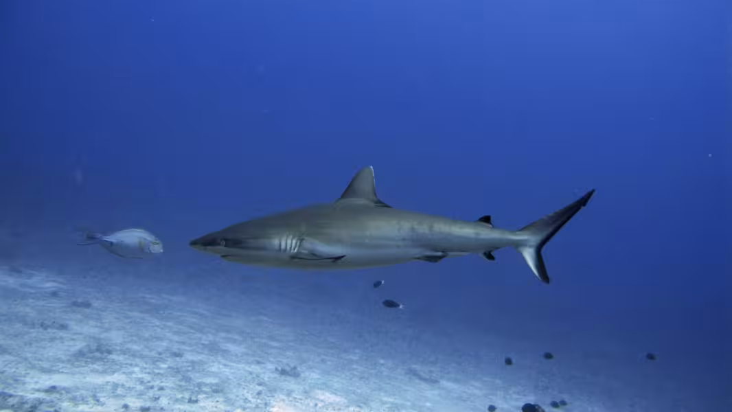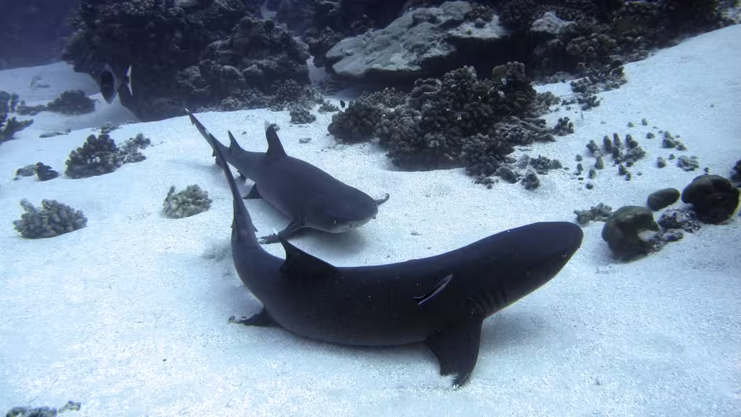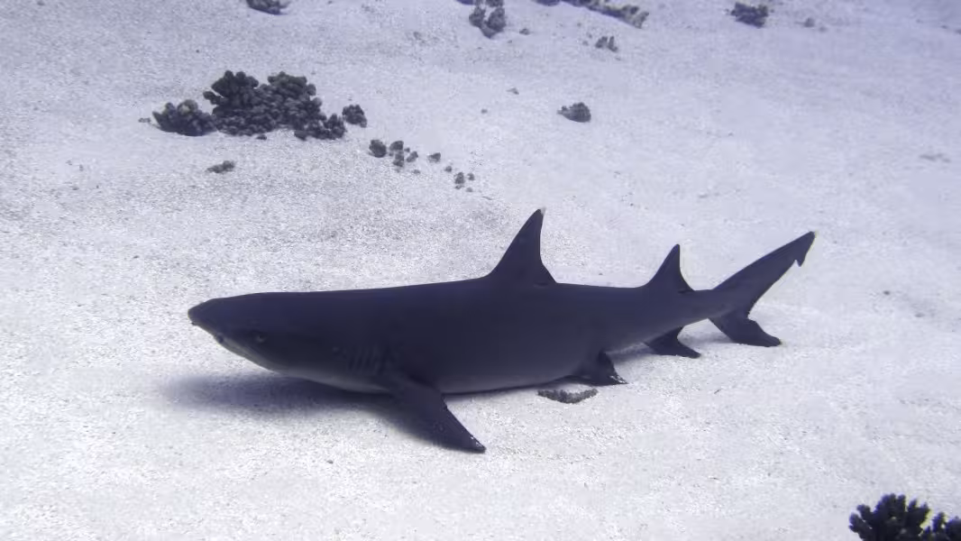 Nach dem Mittagessen ist Wiedergutmachung für den verhauenen Tauchgang angesagt, es geht wieder zu unserem bewährten Korallenrücken, wo wir uns gemütlich auf den Meeresboden legen und die 100 Grauen Riffhaie über uns hinwegziehen lassen. Einige der Haie haben ziemlich lange Nasen und eine kleine schwarze Spitze auf der Rückenflosse. Da haben sich ein paar Schwarzspitzenhaie (die Hochseevariante) unter die vielen Grauen gemischt. Als der Computer so langsam in Richtung 15 Minuten Deko geht, wird es Zeit zum Aufbruch, wir verlassen den Meeresboden und lassen uns mitten durch die Karawane aus Knorpelfischen treiben. Normalerweise mögen sie das nicht so gerne und verdünnisieren sich schnell, weswegen man das möglichst ruhig, mit wenig Atmen und nur dann tun sollte, wenn man sich sicher ist, dass die geneigten Mittaucher einem nicht vor Ärger die Flasche zudrehen, falls die Haie wirklich abhauen. Diesmal hauen sie nicht ab, sodass die Wiedergutmachungsaktion vollständig gelingt.