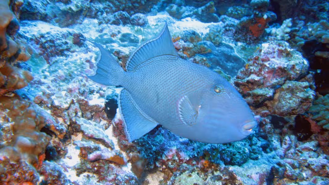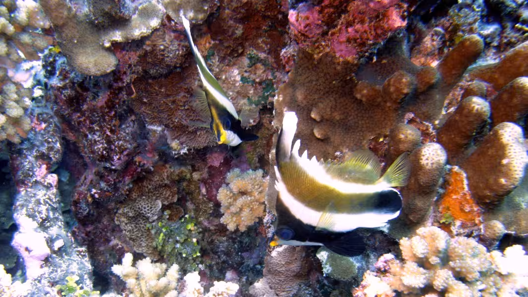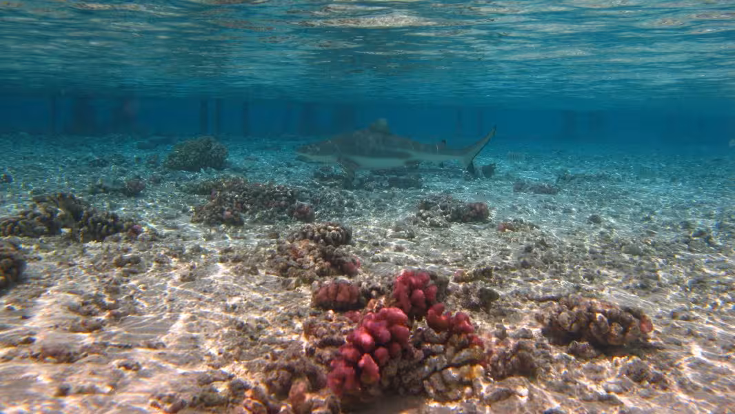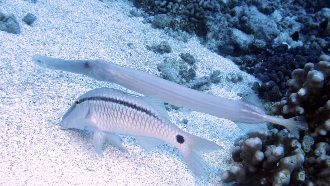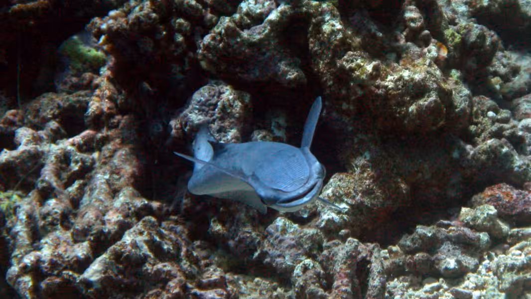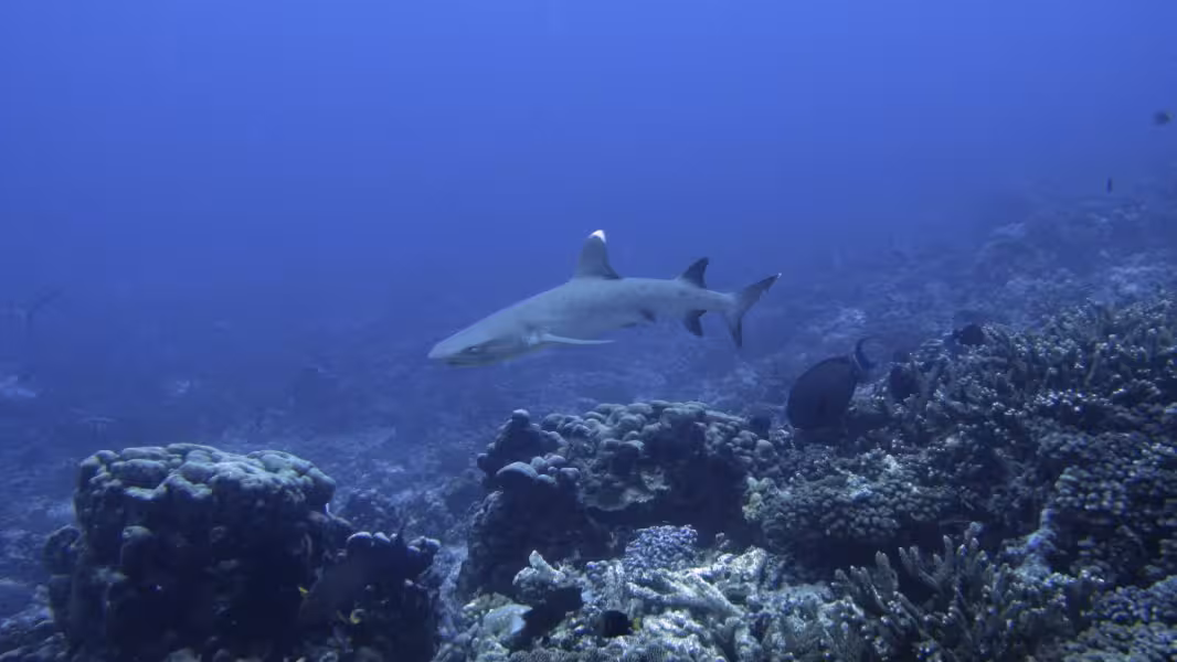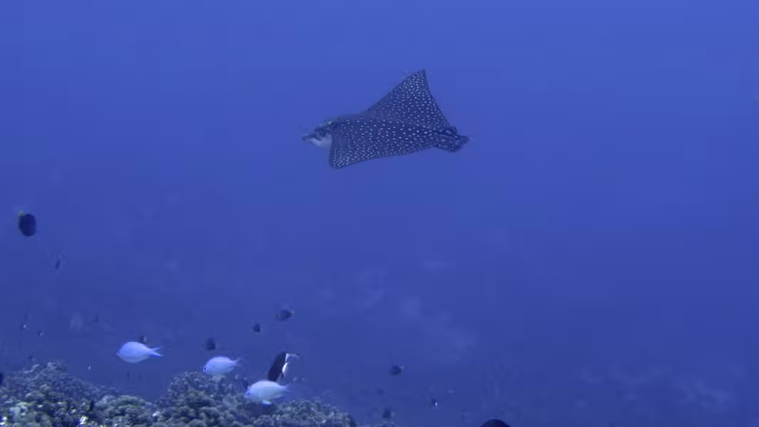 Wir schaffen es, in unser Zeitfenster noch einen dritten Tauchgang zu quetschen, aber da die Strömung schon gegen null geht, sparen wir uns die Bootsfahrt und steigen gleich an der Basis ins Wasser. Bei unserer Runde durch den Kanal lichten wir jeden Fisch ab, der sich nicht rechtzeitig hinter die nächste Koralle retten kann und treffen auch wieder auf viele graue, schwarze und weiße Riffhaie und zu unserer Verzückung auch auf einige Adlerrochen. Einer von ihnen ist schwanzlos, Ursache wird aber wohl weniger ein Gendefekt sein als vielmehr eine Auseinandersetzung mit einem Raubfisch, aus der der Rochen als Verlierer hervorgegangen ist. Na immerhin ist er am Leben geblieben, so gesehen darf er es wohl als Sieg für sich verbuchen. Wir fühlen uns auch als Sieger und lassen den ersten Tauchtag bei einem leckeren Abendessen ausklingen. Die Verpflegung im Tetamanu Village ist wirklich gut, sieht man vielleicht mal vom gewöhnungsbedürftigen Frühstück ab, welches ich ohne mein mitgebrachtes Nutella nur schwer überlebt hätte. Mittags und abends gibt's dafür leckere warme Mahlzeiten mit viel frischem Fisch, Gemüse und Reis. Und natürlich ein bis zwei Hinano dazu.