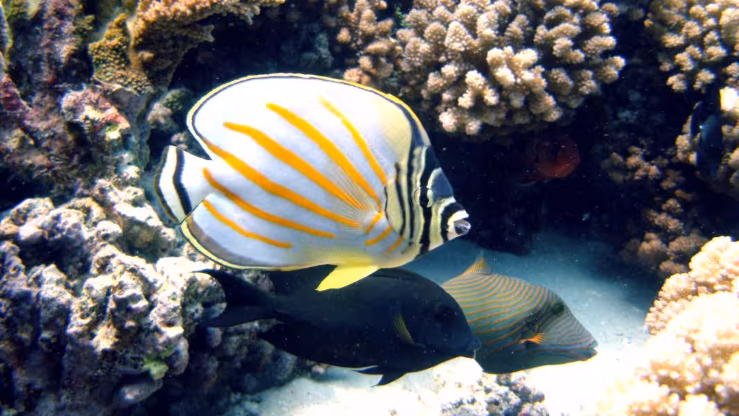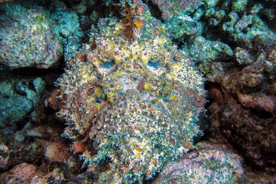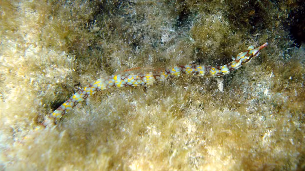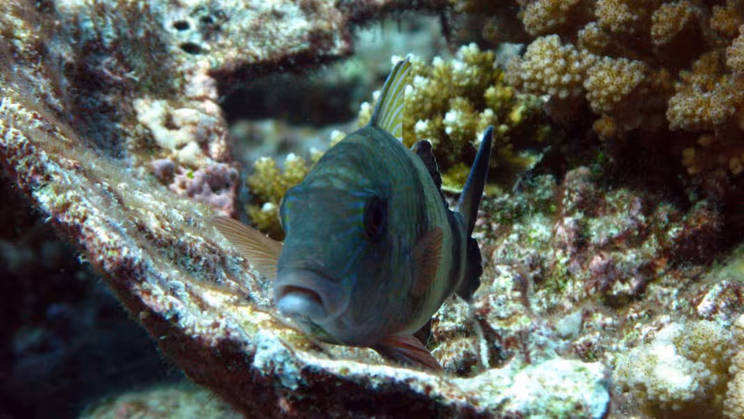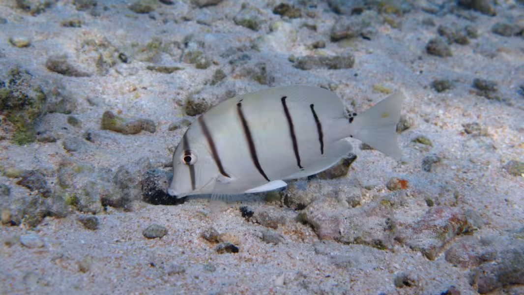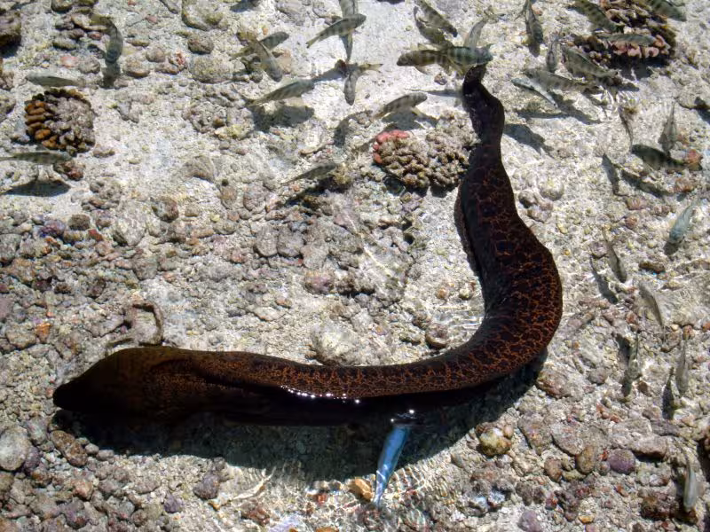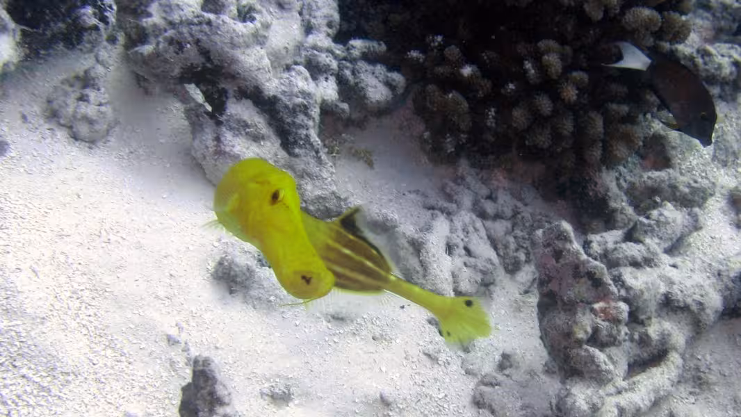 Der nächste Morgen beginnt komisch. Beim Frühstück lautet das Briefing von Nicolas noch, 10 Uhr weit raus ins Blauwasser, Haie gucken. Um 9.00 Uhr heißt es auf einmal, Tauchen schon um 9.30 Uhr. Auch gut, wir sind ja flexibel. Sehr verwundert sind wir jedoch, als Sanny das Boot nur auf die andere Seite des Kanals übersetzen lässt, die eine Minute hätten wir auch locker schwimmen können. Völlig perplex sind wir dann, als der Tauchgang entgegen der Schwimmrichtung von gestern GEGEN die leichte Strömung stattfindet. Warum das, hätte uns das Boot nicht zum Eingang des Kanals bringen können? Zeit zum Fotografieren bleibt kaum, da Sanny heute offenbar einen neuen Rekord im Streckenschwimmen gegen die Strömung aufstellen will. Es ist aber auch nicht wirklich viel zu fotografieren, in diesem Teil des Kanals sind die Haie gerade rar. 25 Minuten lang machen wir das Spiel mit, dann haben wir die Schnauze voll, lassen Guide und zwei Kollegen weiter paddeln, drehen um und lassen uns zu dritt mit der Strömung zurück zur Basis treiben, wo wir keine 5 Minuten später ankommen. Den Rest des Tauchgangs hängen wir unterm Pier ab, wo immerhin wie üblich das ganze Riffgetier rumdöst, bevor wir mit etwas dickem Hals das Wasser verlassen. Der Sinn dieser Aktion erschließt sich uns nicht wirklich, aber jegliche Versuche zu erfahren, was sich Sanny, der auch die restliche halbe Stunde weiter gegen die Strömung gepaddelt ist, dabei wohl gedacht hat, verlaufen erfolglos. Dieser Tauchgang war jedenfalls größtenteils vertane Zeit.