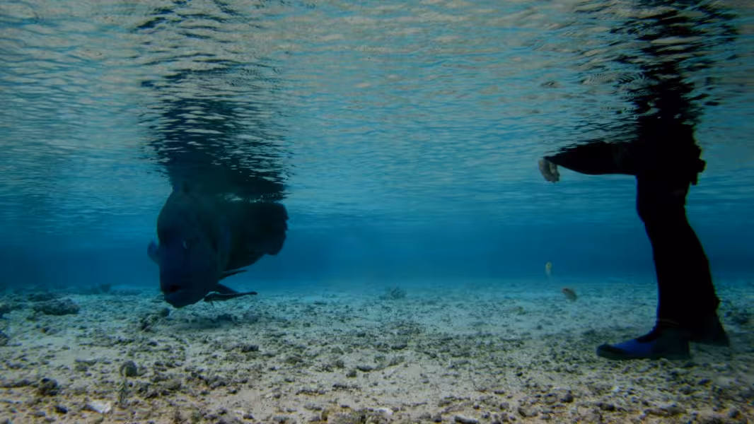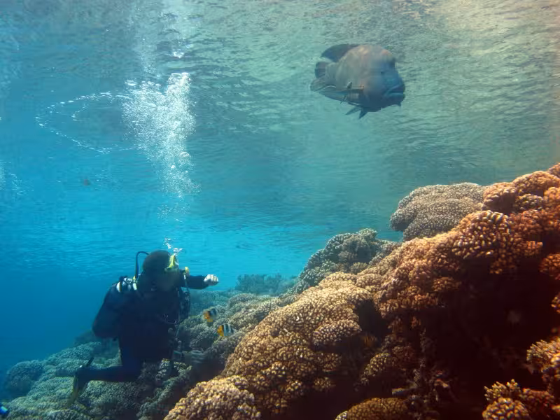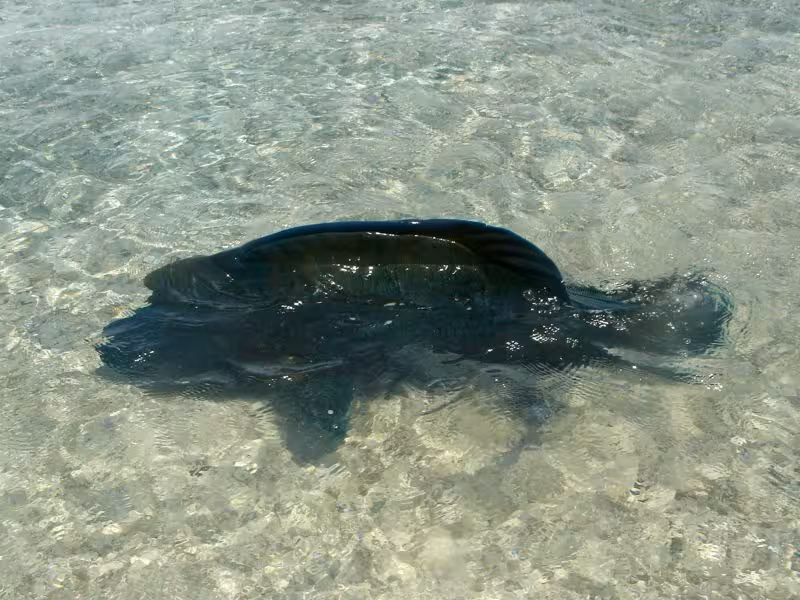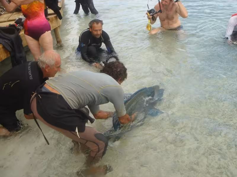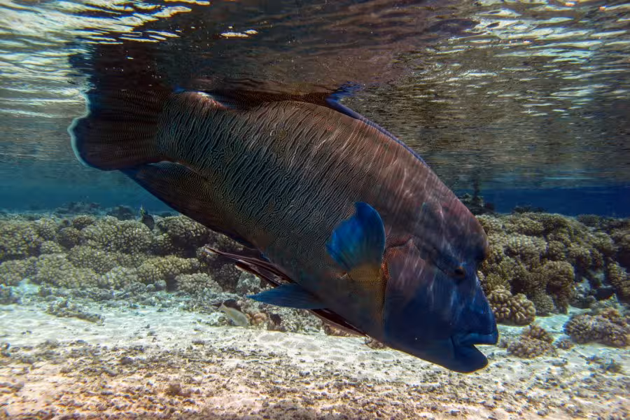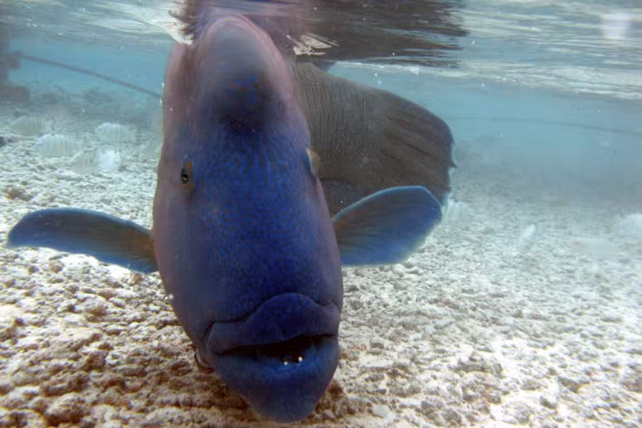 Noch während wir etwas angefressen das Tauchgerödel wegräumen, paddelt ein großer Napoleon ins Flachwasser an den Steg. "Was will der denn hier?", denke ich noch, da kriege ich die Antwort schon präsentiert. Offensichtlich kennt man sich schon, der Nappi holt sich aus Sannys Hand einige Leckereien ab. Noch erstaunter bin ich, als uns der Nappi tatsächlich erlaubt, ihn zu streicheln, erst Streicheldelfine, jetzt Streichelnappis, unglaublich! Allerdings fühlt er sich im Gegensatz zu Bébé fies fischig glitschig an, nicht sehr angenehm.
