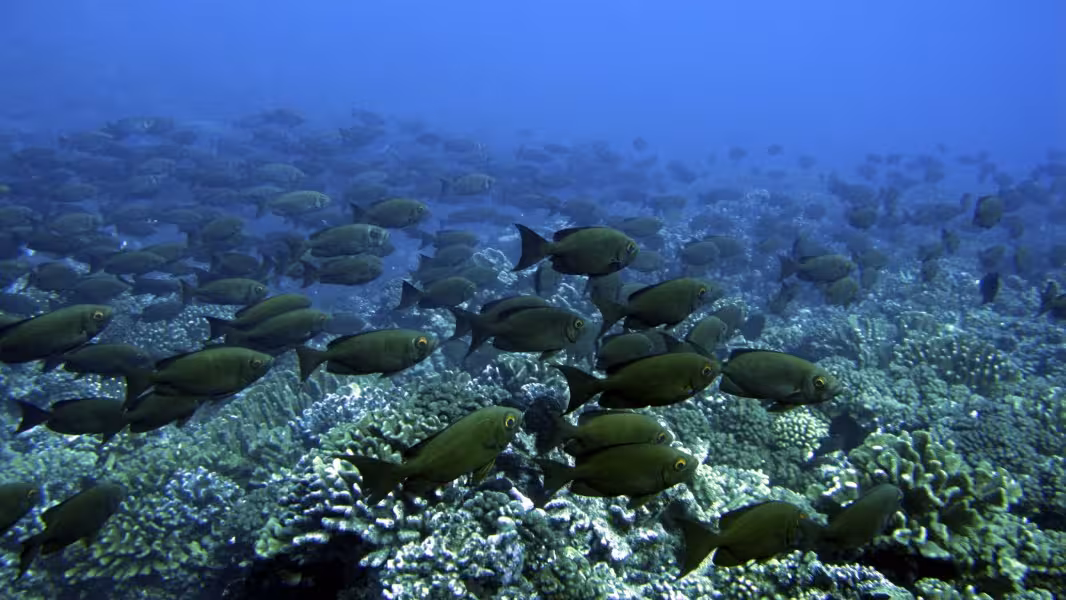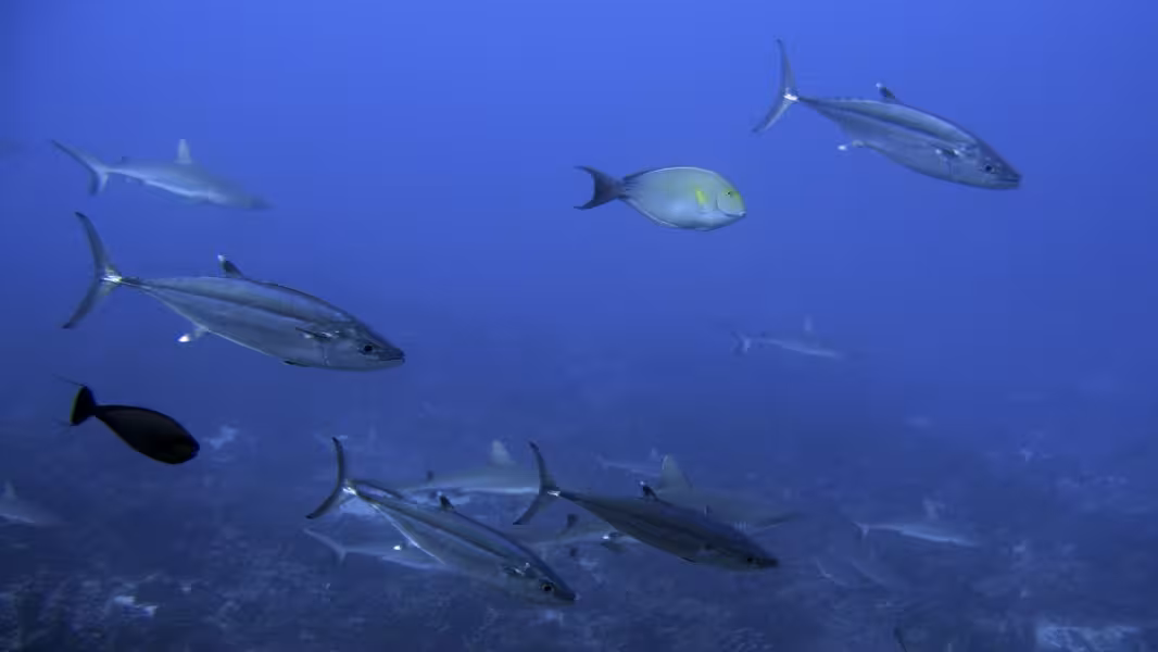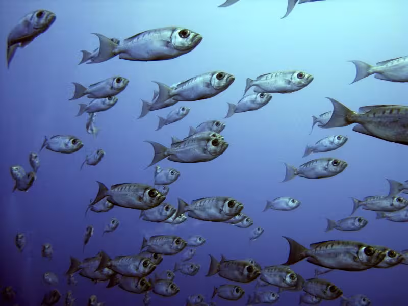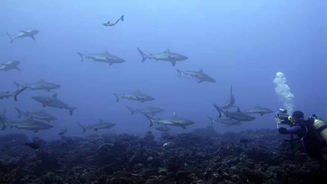 Unseren zweiten Abstieg beginnen wir etwas weiter draußen an der Mündung des Kanals in den Pazifik. Steil fällt der Meeresboden hier auf über 60 m Tiefe ab. Auch hier sind die Wände und der Boden des Kanals von Korallen überwuchert. Uns begegnet eine Gruppe von mehreren Dutzend Grauen Riffhaien, die aber respektvoll auf Abstand bleibt. Kurz darauf beginnt sich der ganze Meeresboden zu bewegen. Nein, kein Erdbeben, vielmehr schwimmt unter uns ein riesiger Schwarm Großaugenbarsche. Bald erreichen wir den uns schon aus dem ersten Tauchgang bekannten Korallenrücken. War vorhin hier schon viel los, so hat inzwischen ein wahres Massenschlafen eingesetzt. Mindestens 100 Graue Riffhaie dösen vor sich hin. Was für ein Anblick, so langsam komt bei mir ein Anflug von Galapagos-Stimmung auf!