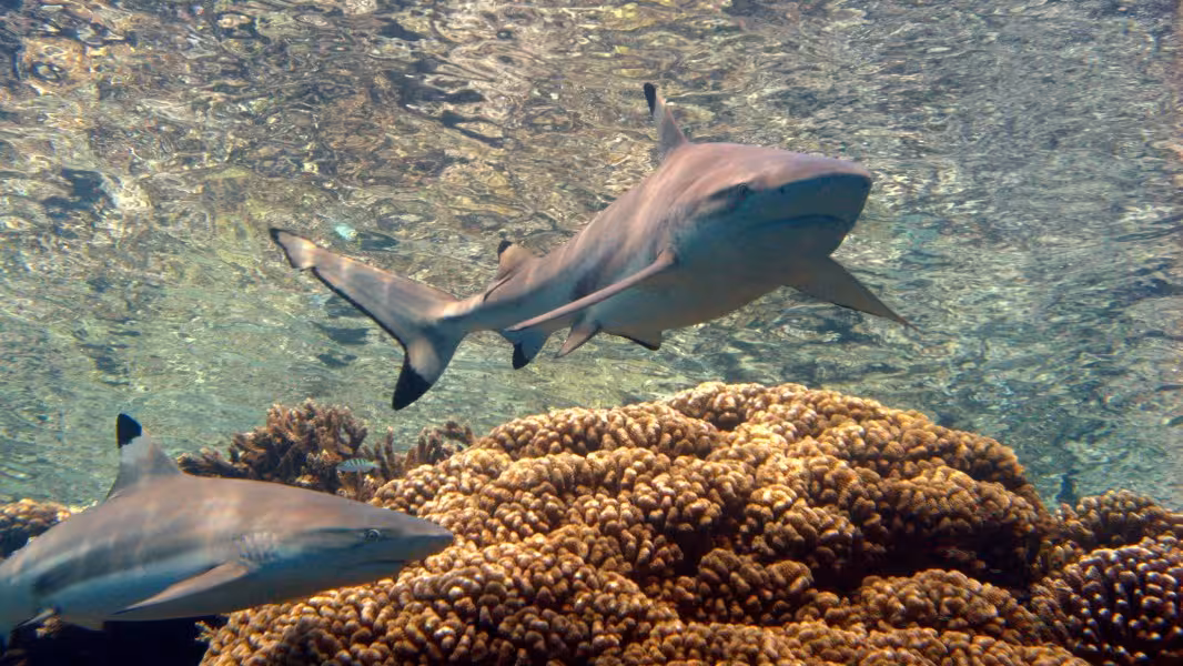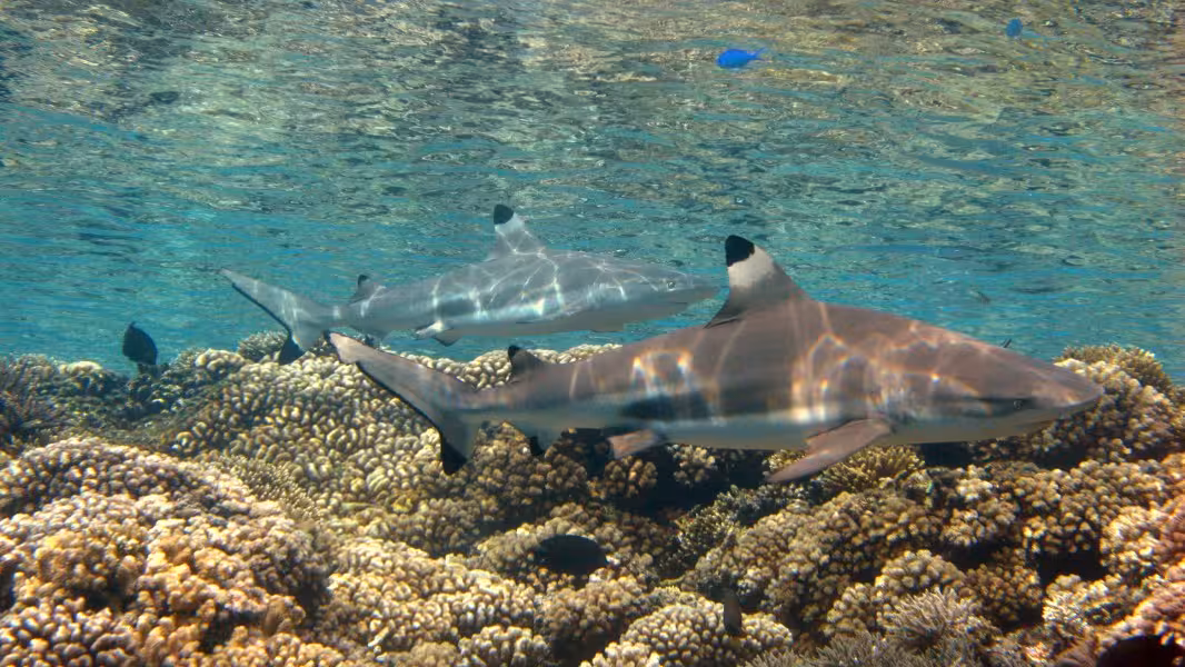 Am nächsten Morgen um 9 Uhr beginnt unsere Erforschung des Kanals. Da Tauchen nur bei einlaufender Strömung möglich ist, haben wir jeden Tag ein Zeitfenster von 6 Stunden, in das wir unsere Tauchgänge quetschen können. Wir starten über einer großen Sandfläche, auf der sich einige Weißspitzenriffhaie von der nächtlichen Jagd ausruhen. An die Sandfläche schließt sich ein Korallenrücken an, über dem ca 30 Graue Riffhaie schwimmen. Eigentlich treiben sie mehr dahin, haben alle Körperfunktionen heruntergefahren und ruhen sich aus. Hierzu schwimmen sie bedächtig bis zum Ende des Korallenrückens, kehren dann um, lassen sich von der Strömung bis zum Anfang des Kanals treiben, um dann wieder eine Kehrtwendung zu machen und erneut den Kanal hinauf zu schwimmen. So geht das den lieben langen Tag lang, wir könnten uns auf den Boden hocken und den ganzen Tauchgang lang schwimmende Haie angucken. Das machen wir jedoch nicht, sondern lassen uns nach einem zehnminütigen Aufenthalt weiter von der leichten Strömung, die mit maximal 2 Knoten deutlich schwächer ausfällt als auf Rangiroa, weiter Richtung Lagune treiben. Auf unserem Weg begegnen wir jeder Menge kleiner und größerer Fischschwärme, wie Stachelmakrelen, Buckel-Schnappern, Blaustreifen-Schnappern, Soldatenfischen, Großaugenbarschen, Doktorfischen und Meerbarben. Die steil abfallenden Wände des Kanals sind über und über mit äußerst gesund aussehenden Steinkorallen und Schwämmen bewachsen. Vereinzelt sieht man auch mal eine Anemone, Weichkorallen sucht man jedoch vergebens. Der Fischvielfalt tut das keinen Abbruch, ich komme mir vor wie in einem Aquarium: Überall wuseln die unterschiedlichsten Arten von Rifffischen um uns rum. Wo man hinschaut, sind Falterfische, Kaiserfische, Drücker, Doktoren, Zacken-, Großaugen- und andere Barsche, und, und, und. Trompetenfische schwimmen gleich in Fünfergruppen durch die Gegend, junge und alte Napoleons begleiten die Taucher und das Fluchtverhalten der Fische, die sich unter den beiden Pieren ein schattiges Plätzchen gesucht haben, ist nicht vorhanden, an Taucher scheinen sie gewöhnt zu sein. Direkt vor der Tauchbasis ist eine Lücke in der Korallenpracht, die wir für den Ausstieg nutzen. Im Flachwasser sind hier Schwarzspitzenriffhaie auf der Jagd nach leckeren Fischköpfen, die den Weg aus der Küche ins Wasser finden. Wir wiederum sind auf der Jagd nach guten Haifotos, aber bei nur 30 cm Wassertiefe muss man aufpassen, dass man sich nicht den Neo durchscheuert. Der erste Tauchgang war auf jeden Fall schon mal ein guter Einstieg, aber an die 400 Haie aus Nicolas Erzählungen mag ich noch nicht so recht glauben.