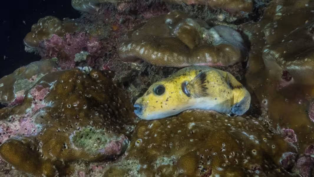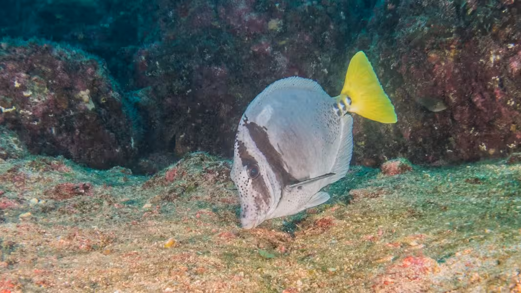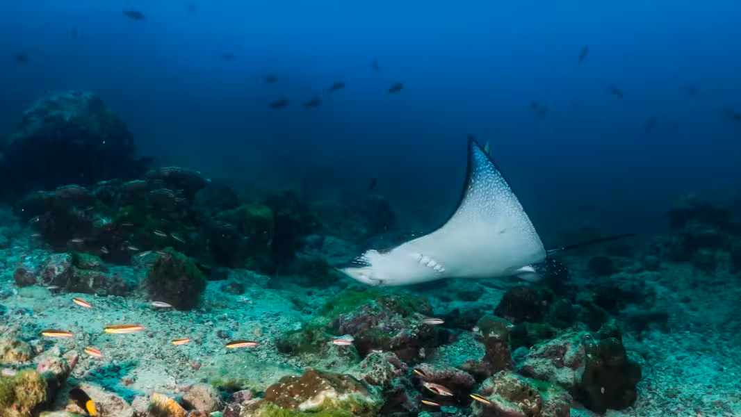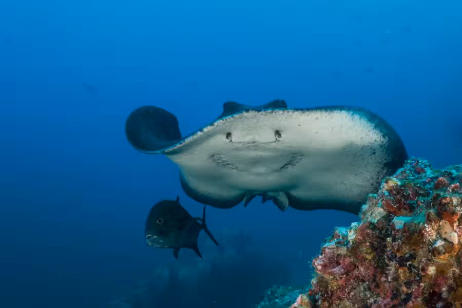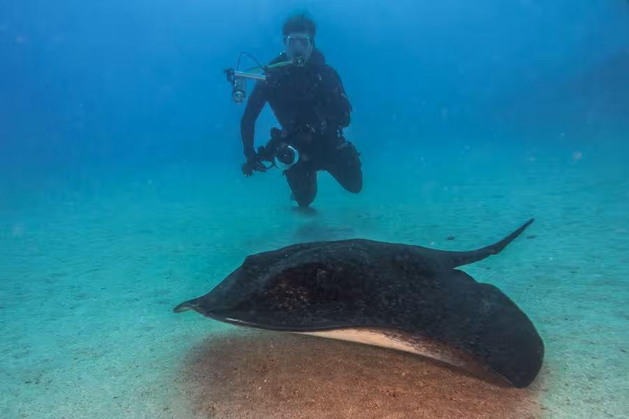 Im Nordwesten von Cocos liegt der Lobster Rock. Ob der Name Programm ist, können wir leider nicht feststellen, da uns das Skiff völlig falsch absetzt und wir 20 Minuten gegen die Strömung über eine Sand- und Geröllwüste dümpeln, bis Juan schließlich ein Einsehen hat und wir umkehren. Während ich mit der Nase im Sand erfolglos nach Rosalippen-Seefledermäusen Ausschau halte, die hier heimisch sein sollen, fliegt über uns ein Manta vorbei, den ich natürlich verpasse. Immerhin hat es jede Menge fette Rochen, nicht weniger fette Muränen und eine Armada von Weißspitzen, dekoriert von einem riesigen Feld aus Sandaalen.