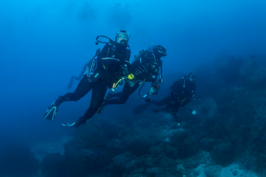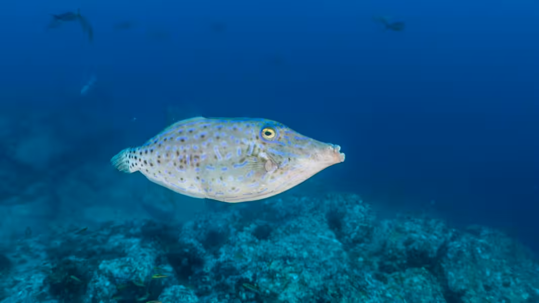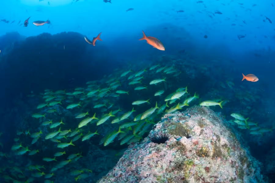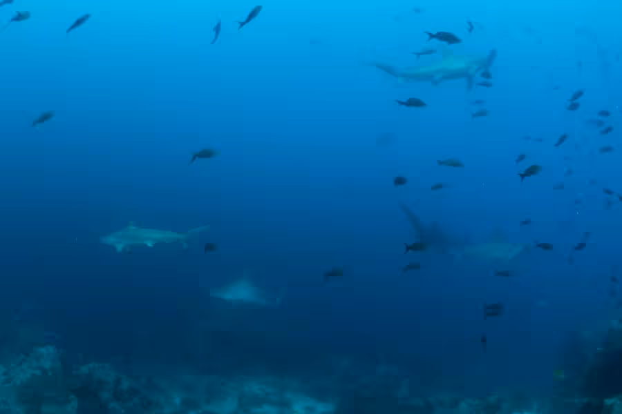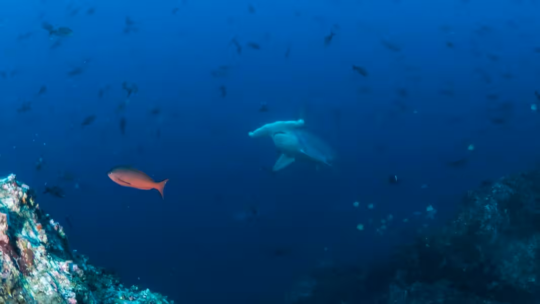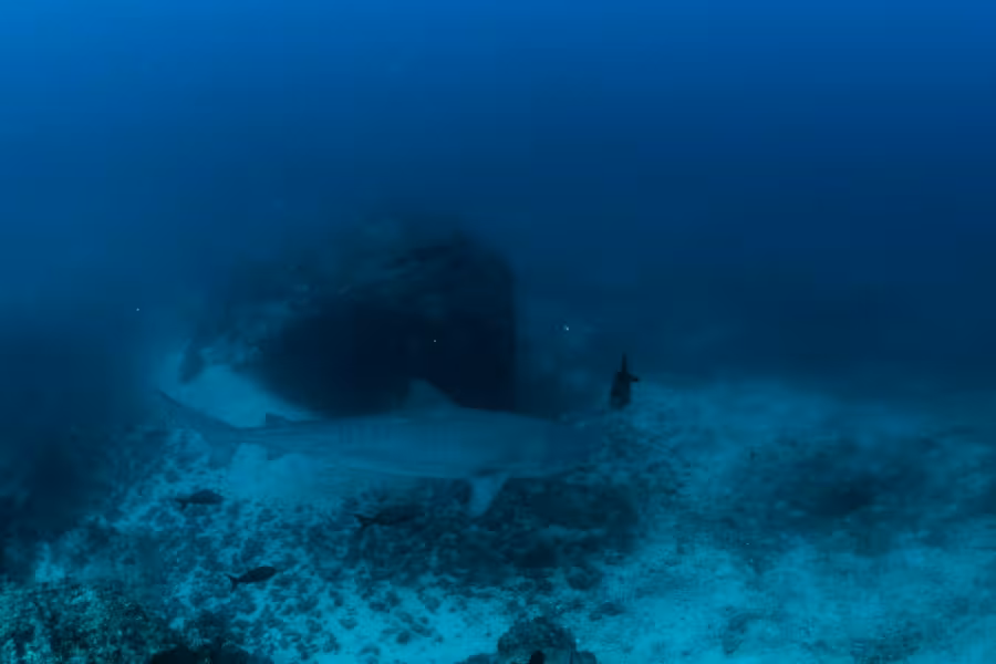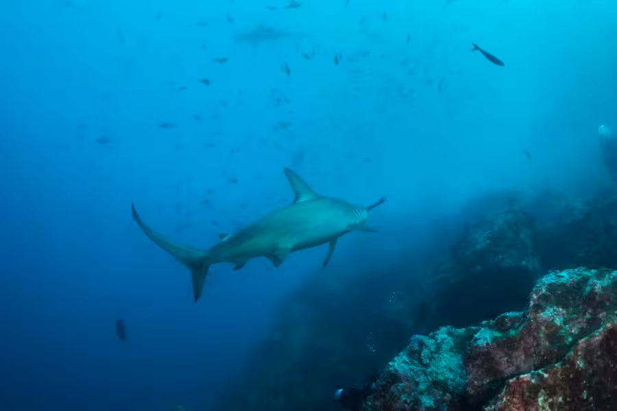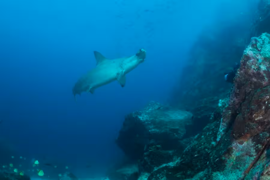 Weiter geht's vor dem Frühstück an Manuelita Deep, wo wir uns wieder wie an Tag 1 in die Felsen hocken und vor uns ein paar vereinzelten Hammerhaien zugucken, während hinter uns eine Schule Meerbarben umherstreift. Im Laufe des Tauchgangs hangeln wir uns langsam gen Süden Richtung Kanal und haben Glück: Zum Abschluss ballern wir nochmal zu zwei Tigerhaien hinunter, bevor uns die Strömung um die Ecke drückt und auf der Ostseite Manuelitas wieder ausspuckt.