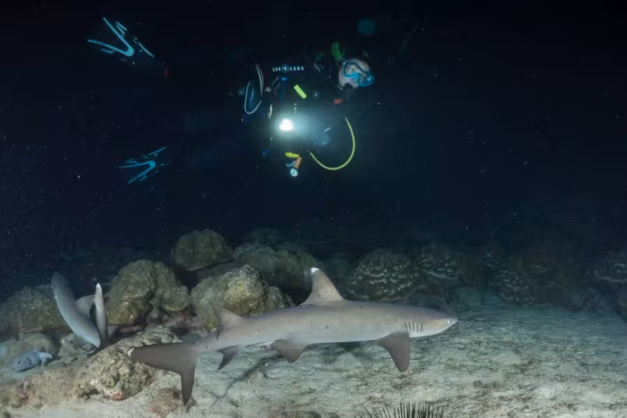 Für den Abend ist der erste Nachttauchgang in der Chatham Bay angesetzt. Highlight ist natürlich die Armada aus Weißspitzenriffhaien, die des Nachts auf Jagd geht und auf alles losgeht, was nicht bei Drei unter den Korallen ist. Ähnliche Bilder kenne ich eigentlich sonst nur noch vom Maaya Thila auf den Malediven. Der Tauchgang rundet einen tollen Tag ab, sieht man mal von dem müden Start am Hummerfelsen ab.