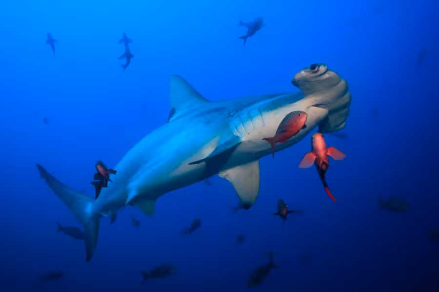 Auch der letzte Tauchgang am Dirty Rock ist super, viele Hammerhaie in Kleingruppen zu 5-6 Tieren tummeln sich an den Putzerstationen. Super Abschluss einer Tauchwoche mit Höhen und Tiefen.