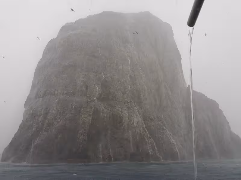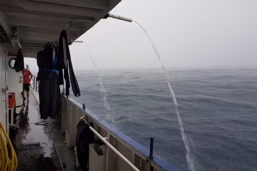 Das einzige besondere Vorkommnis an Tag 9 ist das Unwetter, das über Malpelo hinwegzieht und am Mittag für einen Abbruch des Tauchbetriebs sorgt. Sintflutartiger Regen ergießt sich über uns, wasserfallartig schwappt es die Treppe vom Oberdeck herunter, das sich in einen Swimming Pool verwandelt. Der starke Wind lässt das Wasser waagerecht von der Insel wehen. Die Crew nutzt das reichliche Wasser von oben zum Großreinemachen und rückt Deck und Mobiliar mit dem Schrubber zu Leibe. Da scheint das Feedback bzgl. der Sauberkeit ernst genommen zu werden. Unter Wasser haben wir bei unserem 2. Versuch an La Gringa außer einem Adlerrochen "deep blue sea". Zu La Nevera ist bereits alles gesagt.