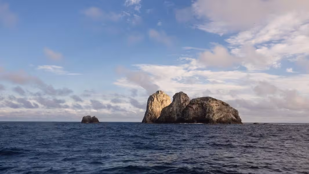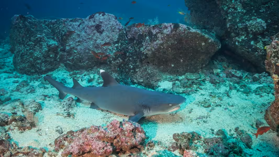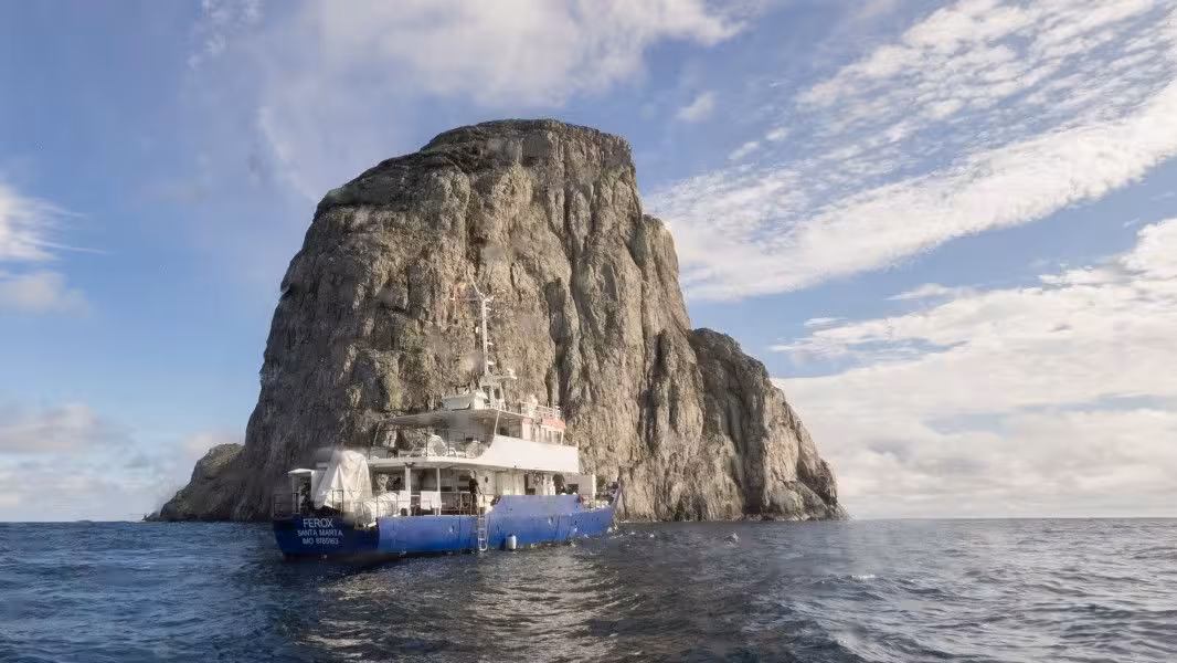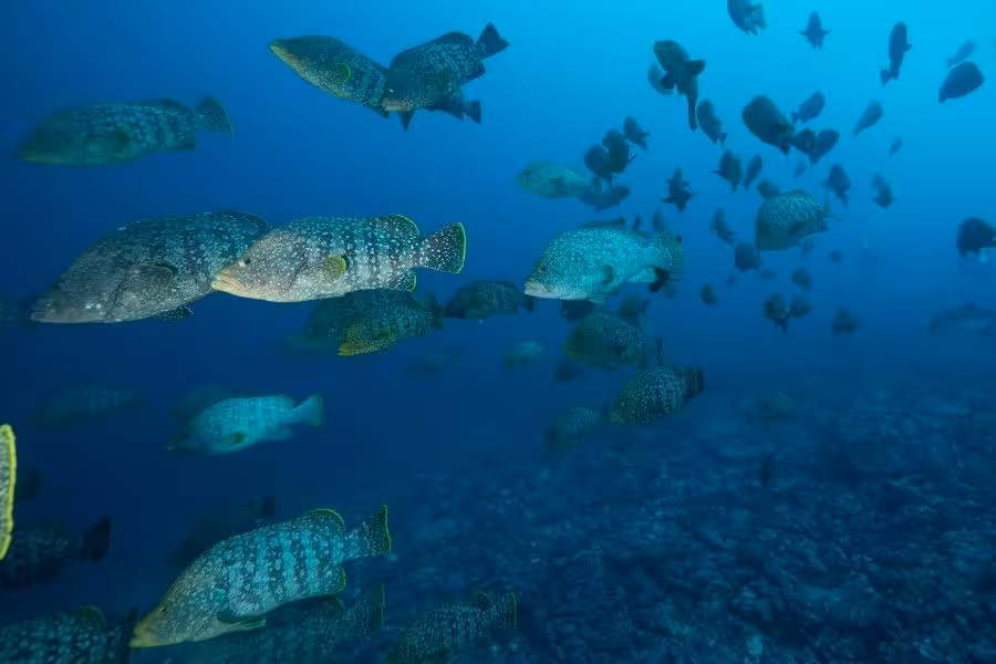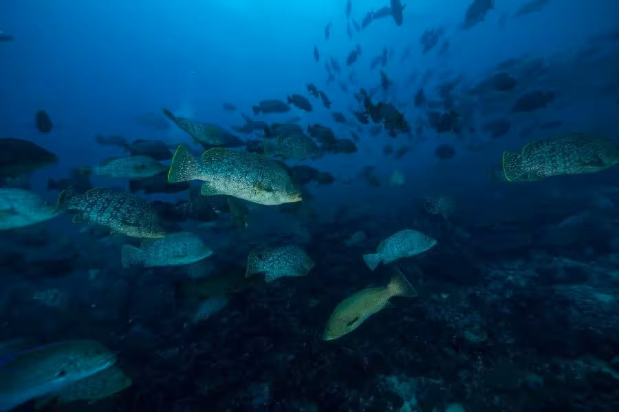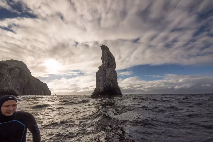 Um 4:30 Uhr in der Früh haben wir unser Ziel erreicht. Malpelo begrüßt uns mit dunklen Regenwolken, die leider für die Jahreszeit typisch sind. 3 Stunden später springen wir zum Check-Tauchgang ins Wasser und wie nicht anders zu erwarten war, bedeutet das Altair de Virginia (aka El Arrecife), der wahrscheinlich einfachste der ca. 20 Tauchplätze rund um die Insel. Der Auftakt ist allerdings etwas dünn, nur ganz wenige Hammerhaie lassen sich blicken. Der riesige Schwarm Jordan-Schnapper, der noch letzten Oktober hier stand, ist in alle Winde verstreut und von den Pelikan-Barrakudas ist überhaupt nichts zu sehen. Das Positivste ist die Wassertemperatur von 26 Grad. Frieren muss man in den kommenden 10 Tagen nicht.