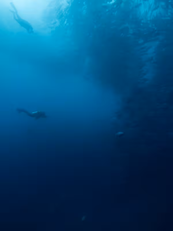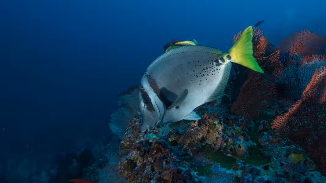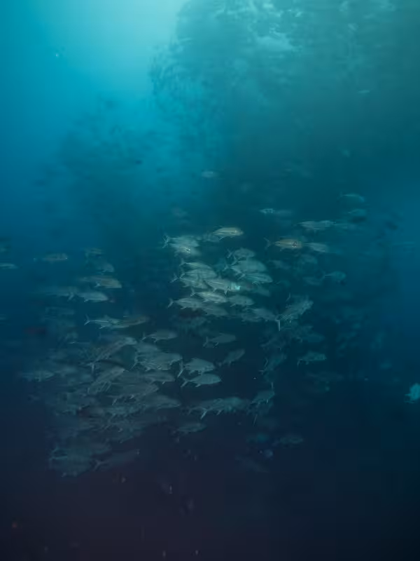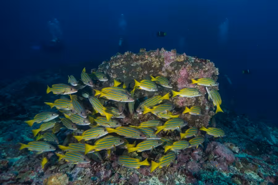Eher mittelmäßig ist auch der Tagesabschluss an D'Artagnan: Auf die Putzerfischarmada und die Großaugenmakrelen ist Verlass, auch wenn der Schwarm heute nicht so dicht steht, wie vorgestern. Wir schwimmen rüber zu Porthos, dem mittleren der drei Musketiere und schaukeln uns mit der Dünung durch die Kathedrale. Am Eingang steht heute eine große Schule Blau-Gold-Schnapper, in der Kathedrale selbst ist aber nicht so arg viel los. Nach dem Ausgang dümpeln wir noch etwas durchs Blau aber kein Fisch weit und breit lässt sich mehr blicken, noch nicht mal ein Walhai!