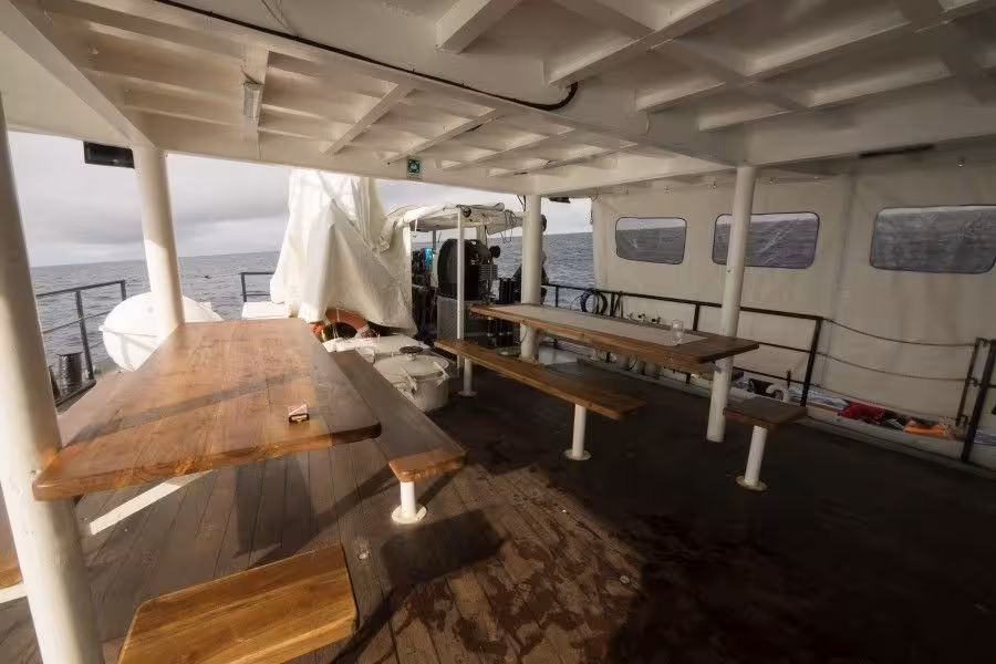 2)Update September 2019: Bei einem weiteren Umbau ist die Bar auf dem Oberdeck einem kleinen Salon gewichen, der auch für Briefings genutzt wird, sodass man sich nun auch "indoor" aufhalten kann.