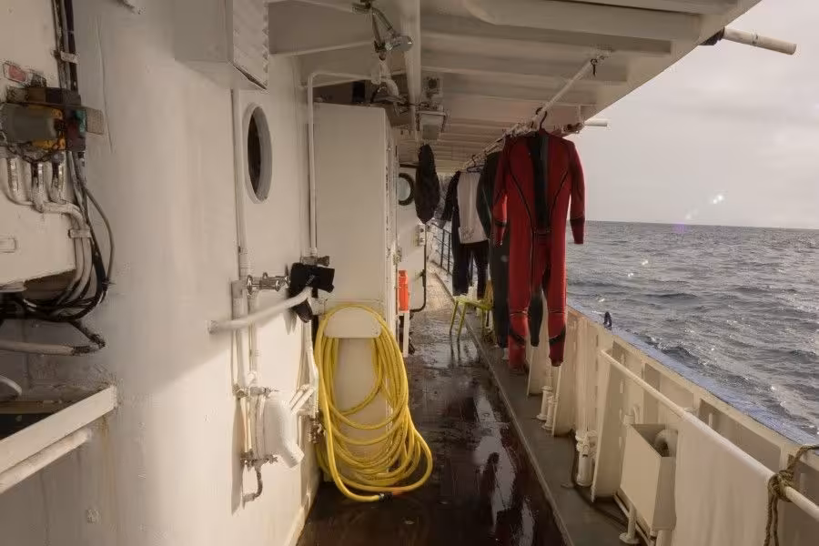 Die Langeweile der Überfahrt wird nur von 4 Mahlzeiten, einem Sicherheitsdrill, der aus dem Anlegen der Schwimmwesten besteht, und dem allgemeinen Tauchbriefing unterbrochen. Wie man es schon gewohnt ist, wird es vor Malpelo 3 Tauchgänge pro Tag geben, um 7:30 Uhr, 10:45 Uhr und 15 Uhr. Seitdem die "Maria Patricia" im August 2016 fünf Taucher vor Malpelo verloren hat, müssen alle Taucher um 16:30 Uhr aus dem Wasser sein. Die 12 Gäste werden in 2 Gruppen aufgeteilt, die mit den beiden Skiffs an die Tauchplätze gefahren werden. Die Ausrüstung verbleibt die gesamte Zeit auf den Skiffs, man muss sich nur um Maske und Kamera kümmern.