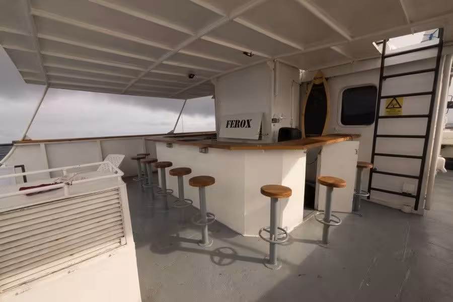 Was das Schiff angeht, vermisst man auf der "Ferox" doch einigen Komfort, den man auf der "Yemaya" hatte. Einen Salon gibt es nicht; wenn man zusammensitzen will, kann man sich auch bei Wind und Wetter nur im Freien aufhalten. Dort, wo bei reinrassigen Tauchbooten das Tauchdeck ist, befindet sich auf der "Ferox" der Essbereich mit zwei Holztischen und vier Bänken. In einer Ecke steht der Kameratisch, der ausreichend Platz für das Foto-Equipment bietet, sofern nicht alle 12 Gäste mit fetten Kameras erscheinen. Direkt neben den Esstischen steht der Kompressor, der nach den Tauchgängen zum Flaschenfüllen angeworfen wird, sodass es auf dem Hauptdeck sehr laut wird.1) Zum Frühstück klettert man daher mit der Kaffeetasse in der Hand über eine steile Treppe aufs Sonnendeck, wo es neben ausreichend Liegestühlen auch eine Bar gibt2). Bei dem ständigen Wellengang, den man vor Malpelo hat, muss man hier gut auf Teller, Besteck und Gläser aufpassen, damit sie nicht bei der nächsten Welle am Boden liegen. In den Zimmern vermisst man insb. im Bad Haken und Ablagemöglichkeiten. Es wäre sehr leicht, hier mit wenig Aufwand Abhilfe zu schaffen. Ansonsten ist das Platzangebot in den Zimmern aber gut. Auch stehen reichlich Steckdosen nach deutschem (!) Standard zur Verfügung. Was an den beiden Doppelkabinen vorne im Bug ziemlich nervt, ist der Lärmpegel: Jede kleine Welle, die gegen den Rumpf schwappt, wird von selbigem so sehr verstärkt, dass man denkt, neben dem Ohr spielt eine Kindergeburtstagsrunde Topfschlagen. Auch ohne laufende Maschinen ist so an eine entspannte Nachtruhe kaum zu denken. Ohrenstöpsel oder lärmdämmende Kopfhörer nicht vergessen! Das gilt wie gesagt nur für die beiden Kabinen vorne im Bug, in den anderen ist es laut Aussage der Mitreisenden deutlich leiser.
