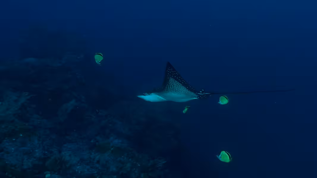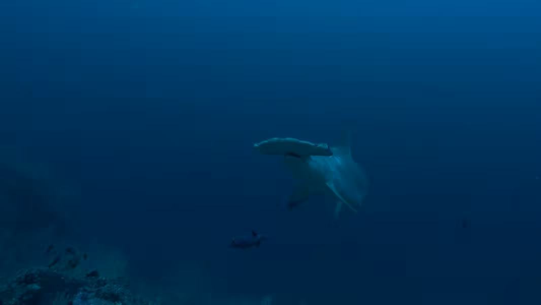 Den Tagesabschluss macht La Pared del Naufrago an der Nordwestseite Malpelos. Zu Beginn gibt es die üblichen Hammerhaie, allerdings in überschaubarer Stückzahl. Beim Paddeln gegen die leichte Strömung entlang der Steilwand Richtung Cara del Fantasma werden wir in wenigen Metern Entfernung von einem Walhai überholt. Es bleibt nur ein kurzes Vergnügen, mit wenigen Flossenschlägen ist das ca. 7 m große Tier im Blau des Ostpazifiks verschwunden. Dennoch ist der größte Fisch des Planeten natürlich ein schöner Abschluss eines vielversprechenden ersten Tauchtages.