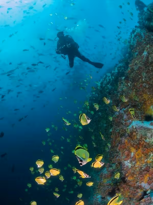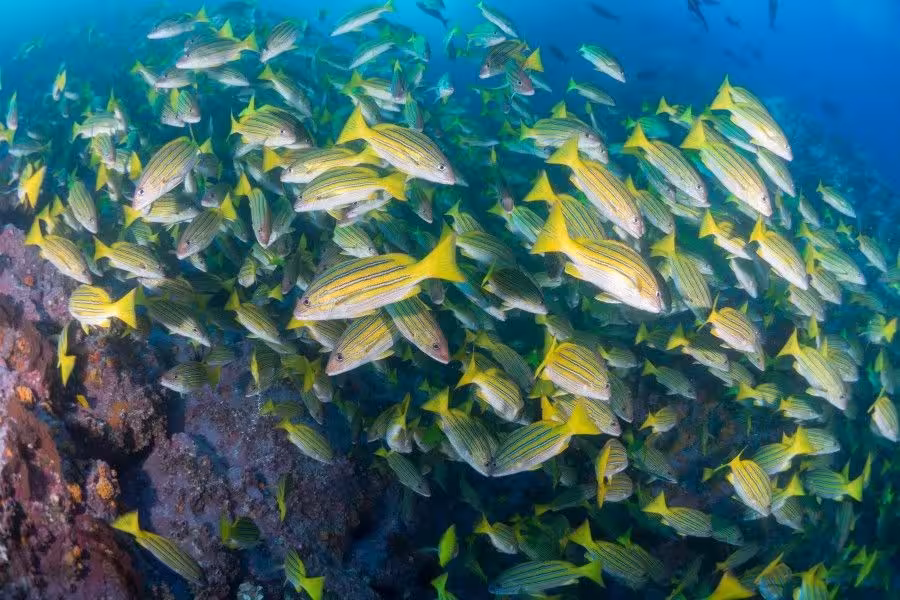 Zum Start in den Tag begleitet uns zum ersten Mal Haibert, der Park Ranger der Naturschutzbehörde. Eigentlich ist er auf der Insel stationiert, hält sich aber überwiegend auf dem gerade vor Anker liegenden Tauchboot auf. Wahrscheinlich wird es auf Dauer auf dem kahlen Felsen doch ziemlich langweilig und das ständige "Rauf auf die Insel" und "Runter von der Insel" über die schwankende Strickleiter dürfte auch maximal lästig sein. Die letzten Tage hat Haibert die Annehmlichkeiten des Luxus-Katamarans genossen. Nun muss er sich mit dem Standard auf der "Ferox" begnügen, denn der Katamaran segelt heute ab. Bei unserem ersten Abstieg an La Pared del Naufrago sammelt Haibert gleich mal viele Meter herumliegende Angelleinen ein – und bei uns damit ordentlich Pluspunkte. Leider verpasst er dadurch das Walhai-Riesenbaby, das heute mit einem Affenzahn über uns hinwegfegt — kein Tag ohne Walhai. Weiteres Highlight ist die riesige Schule Jordan-Schnapper, die wir eigentlich an Tag 1 am Altar erwartet hatten und für ein ausführliches Video- und Fotoshooting nutzen.