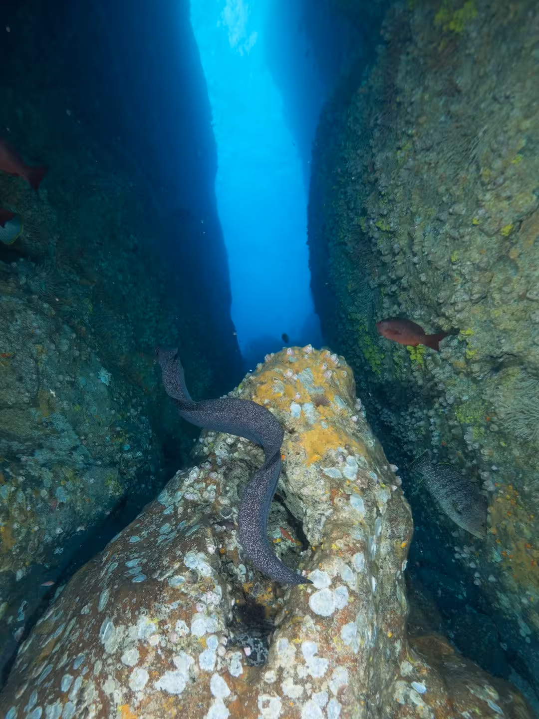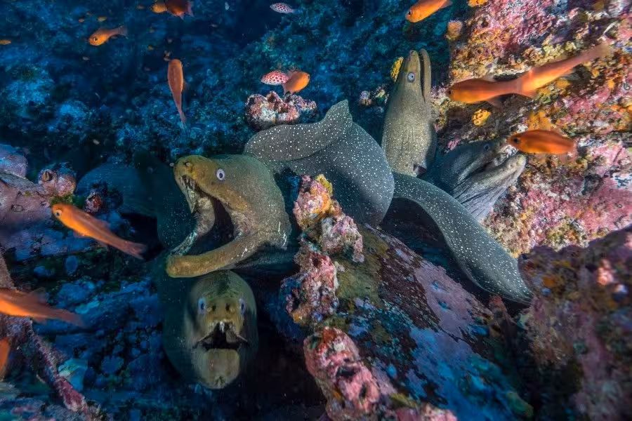 Der Sturm hat sich gelegt, die Sonne lacht endlich mal über Malpelo. Wegen des gestrigen Kurzprogramms gibt es heute einen straffen Plan mit 4 Tauchgängen. Das geht nur mit einer Ausnahmegenehmigung von Haibert, da wir es nicht schaffen werden, bis 16:30 Uhr aus dem Wasser zu sein. Wir starten an der Ferreteria, dem südlichsten Platz Malpelos. Der Unterwasserberg, der bis auf 20 m unter die Oberfläche kommt, wartet oft mit starker Strömung und entsprechend viel Großfisch auf. Die Strömung ist da, der Großfisch nicht. So bleibt es beim Ablichten der Muränennester, in denen sich ein halbes Dutzend und mehr der Aale umeinander schlängeln. Immerhin werden wir beim Driften durchs Blauwasser etwas abgetrieben, sodass wir direkt mal das AIS testen können. Funktioniert, sowohl auf dem Skiff als auch auf der Ferox wird akustischer Alarm ausgelöst, sodass wir nur ein paar Minuten ausharren müssen, bis das Skiff zur Stelle ist. La Nevera ist heute nur 20 min lang gut, danach wird es ruhig an den Putzerstationen. Dafür stehen an D'Artagnan die Großaugenmakrelen so dicht zusammen, dass man die riesige Wolke aus Fischleibern kaum von den Inseln auseinanderhalten kann, zwischen denen sie stehen. Gigantisch! Zum Tagesabschluss versenken wir uns an Cara del Fantasma zum ersten und einzigen Mal unterhalb von 40 m auf der Suche nach dem Ferox. Dies ist der Platz, an dem Michael in all den Jahren, in denen er schon nach Malpelo kommt, seine einzige Sichtung hatte. So viel Glück haben wir heute aber nicht.