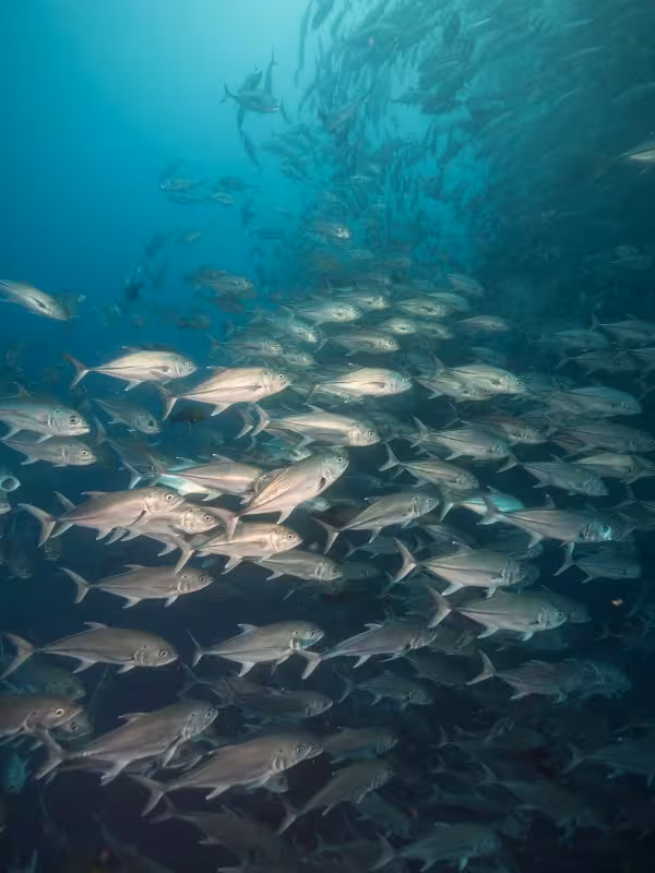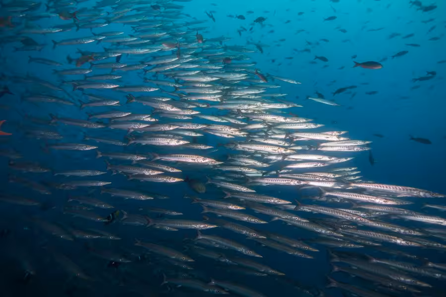 Die hoffen wir am nächsten Morgen bei unserer ersten Ausfahrt in den tiefen Süden zu finden. Wir springen an La Gringa und bestaunen 15 min lang das Tiefgrau des Ostpazifiks. Wir paddeln rüber zu El Bajon, einem Platz, der in der Vergangenheit oft sehr gut für Galapagoshai- und Hammerhai-Sichtungen war. Heute herrscht auch hier gähnende Leere. Die Strömung treibt uns nach Westen gen David. Auf einmal sind wir umringt von einer Gruppe Gelbflossenthune und im Schlepptau haben sie die bisher so schmerzlich vermissten 98 Freunde: Eine Seidenhaischule aus 100-200 Tieren prüft einige Minuten gründlich, wer sich da in ihrem Revier aufhält. Na endlich! Das sind die Szenen, auf die wir so sehr gehofft haben. Total begeistert tauchen wir mit dem letzten Rest Luft in der Flasche auf.