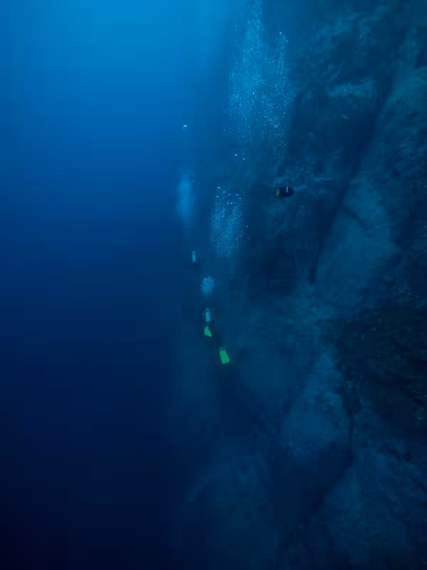 Für einen letzten Ferox-Versuch geht es am Morgen am Bajo Monstruo abwärts. Ein riesiger, ca. 2 m langer Schatten, der sich bei der diesigen Sicht nur schemenhaft gegen das trübe Wasser absetzt, erregt kurzfristig unsere Aufmerksamkeit, aber es wird wohl "nur" ein Trümmer-Thun gewesen sein. An La Nevera holen wir uns unsere tägliche Hammerhairation. Beim Safety Stop sehen wie am Ende sogar mal eine größere Schule, aber wegen der heute schlechten Sicht hat es mehr was von "Shades of Grey" als von einer echten Sichtung. Um mal was anderes zu machen, springen wir für den 3. Tauchgang an Mirador, dem westlichsten Zipfel Malpelos. An der Steilwand entlang heißt es Streckentauchen (eigentlich eine Disziplin, die ich hasse) zur French Cave und weiter zu El Freezer. Schön ist der Platz im Wesentlichen wegen seiner Topografie. Weniger schön ist, dass Haibert wieder Dutzende Meter Angelleinen einsammeln muss (weitere Pluspunkte für ihn). Trotzdem hat er noch Muße, ins Blauwasser zu gucken und auf irgendwas zu zeigen, woraufhin alle auf Verdacht losspurten. Ich erreiche den großen Walhai leider nicht mehr. Vielleicht sollte Haibert auf Guide umsatteln, der gute Mann ist echt fit. Zu unserem großen Entzücken schwimmt uns 5 min später ein weiterer, deutlich kleinerer Walhai von der Wasseroberfläche entgegen, der sich in puncto Schwimmgeschwindigkeit auch etwas kooperativer zeigt. So kooperativ, dass er beim Safety Stop nochmal vobeischaut. 3 Walhaisichtungen in den letzten 10 min eines Tauchgangs hat man auch nicht alle Tage.