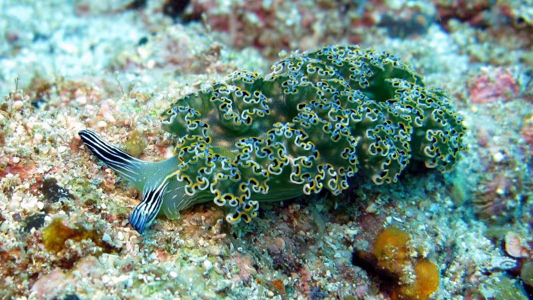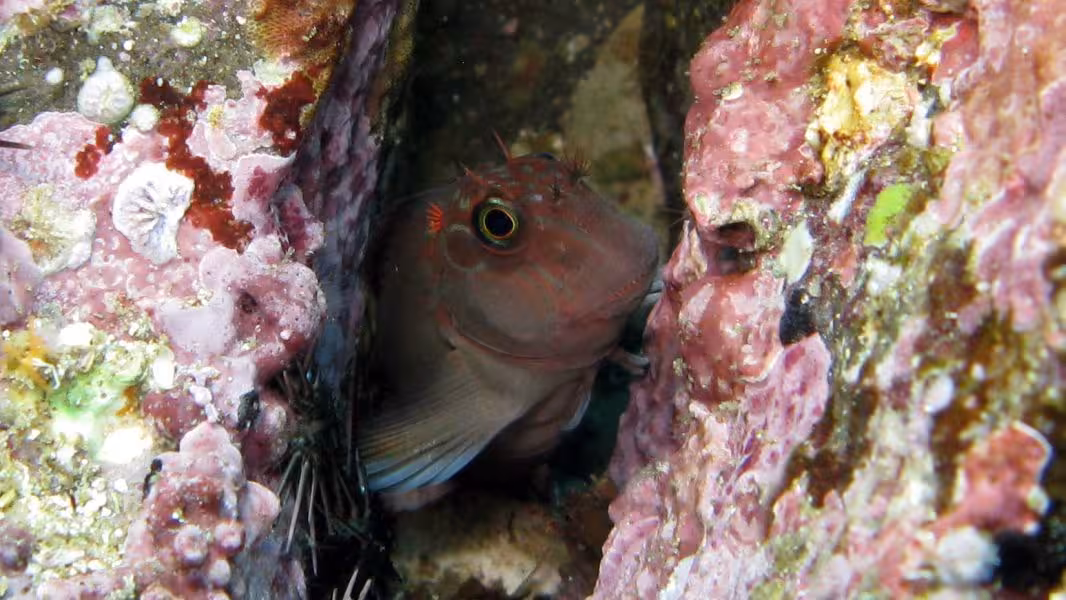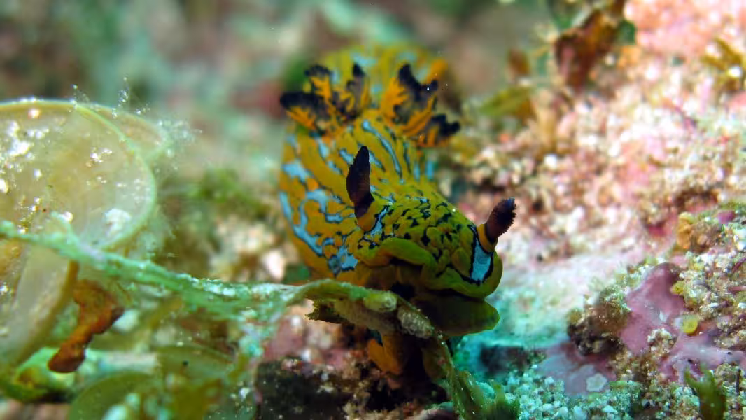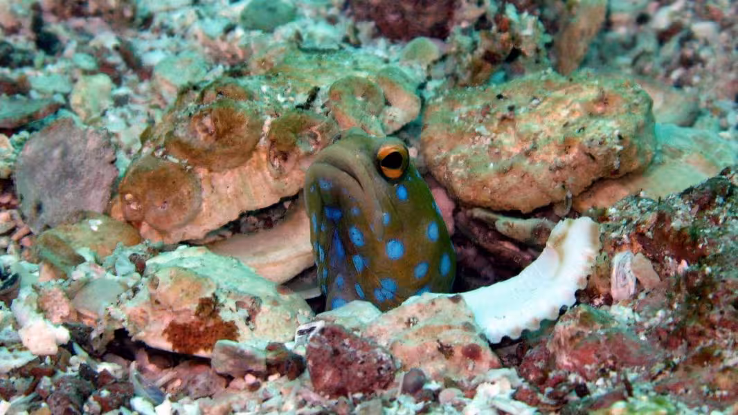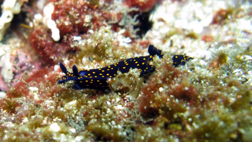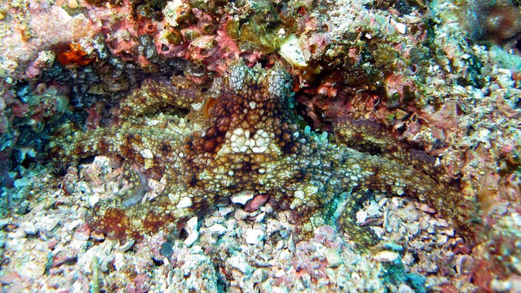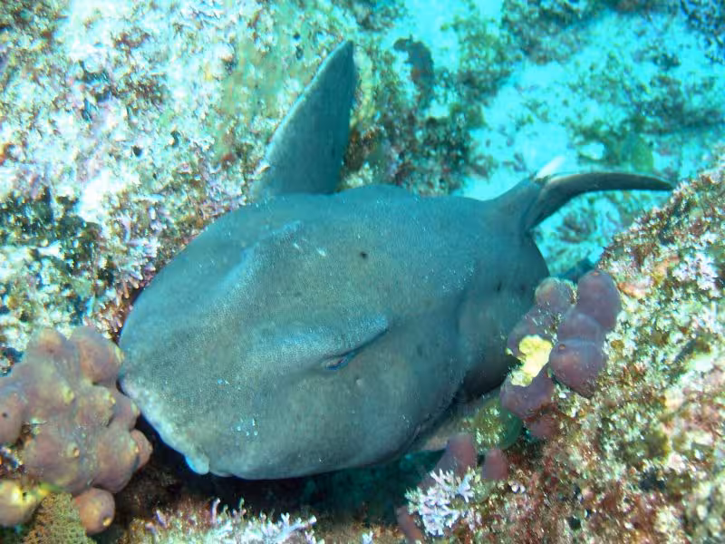 Die halbe Nacht hindurch fahren wir, bevor wir La Reina, unseren 2. Tauchplatz erreichen. Die kleine Insel beherbergt eine Kolonie Kalifornische Seelöwen, die wir hoffen, bei unseren 2 Tauchgängen hier unter Wasser zu treffen. Ein kleiner Canyon auf der Nordseite lädt zu einer Erkundungstour ein und prompt kommen uns auch einige Löwen entgegen. Sie sind aber im Wesentlichen mit sich selbst beschäftigt und nicht dazu aufgelegt, mit den Tauchern zu spielen. Die Fischwelt an La Reina ist relativ unspektakulär: Perlhuhn-Kugelfische, Riesen-Büschelbarsche und Panama-Blennys hocken überall auf den Felsen, dazu die schon genannten Mexikanischen Schweinslippfische, deren weitere Erwähnung ich mir im Folgenden spare. Aufpassen muss man auf die allgegenwärtigen Drachenköpfe, die manchmal schwer gegen die Felsen auszumachen sind. Als Schmankerl hat es noch Dutzende Nacktschnecken, hübsch gemusterte Rundrochen und einen Mexikanischen Stierkopfhai.