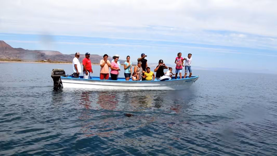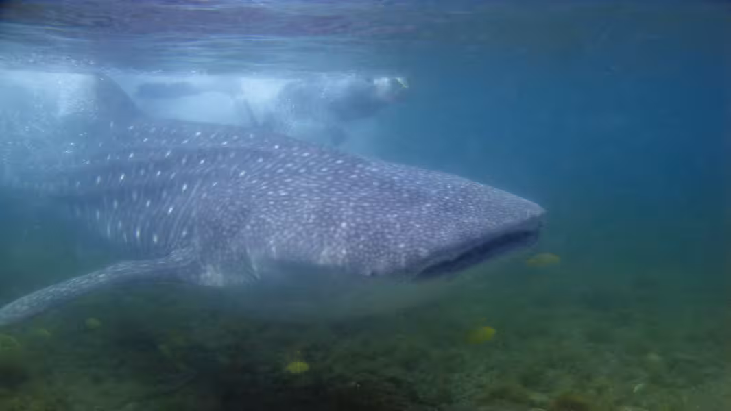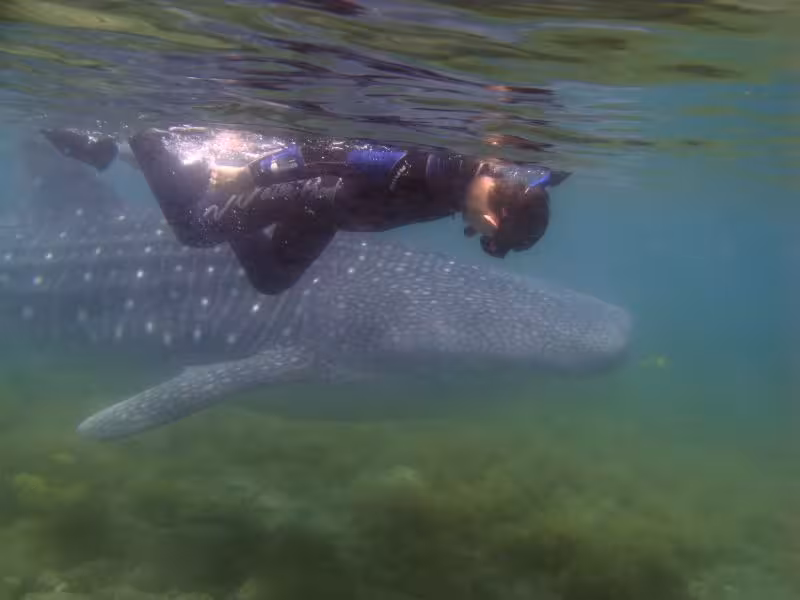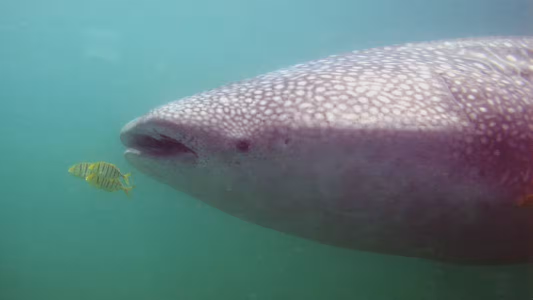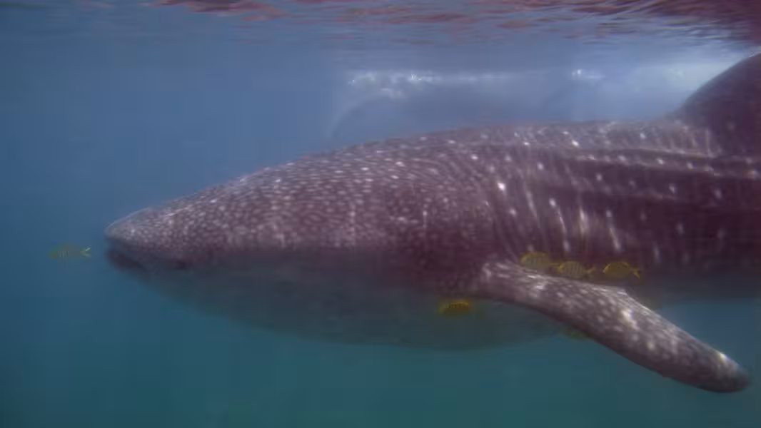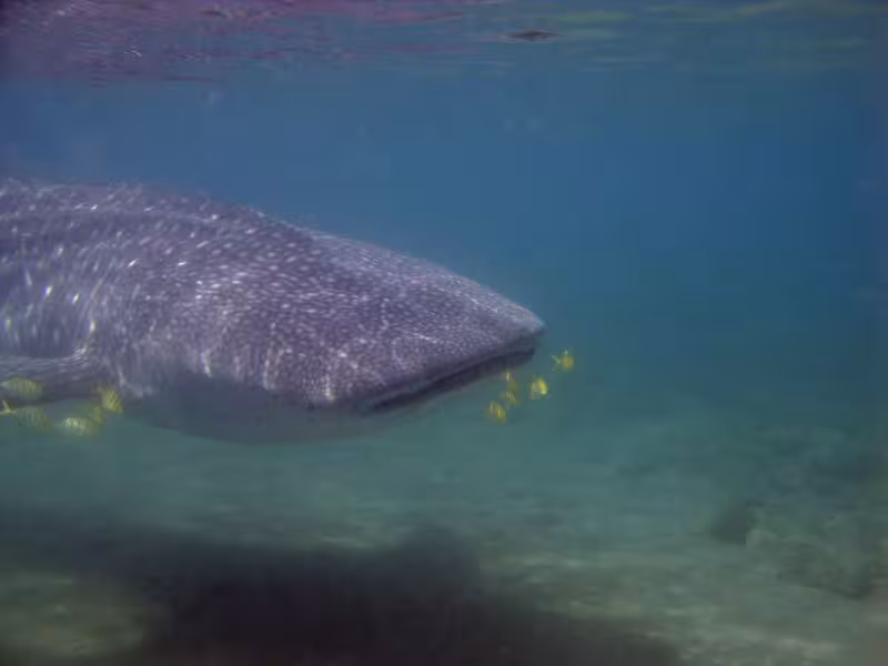 Irgendwann in der Nacht erreichen wir unseren Ankerplatz irgendwo vor La Paz, der Hauptstadt des mexikanischen Bundesstaates Baja California Sur und etwa 250.000 Einwohner stark. Mit Tauchen ist es hier nicht so weit her. Dafür kann man ganz hervorragend schnorcheln und das auch gleich noch mit dem größten Fisch des Planeten. Zu diesem Zweck holen wir uns Unterstützung von einem lokalen Unternehmen, welches mit Leichtflugzeugen auf Walhaisuche geht. Parallel wird unten mit Hartschalenbooten Ausschau gehalten und fix an den Ort des Geschehens gerast, sobald der Flieger etwas entdeckt hat. Damit das Objekt der Schnorchlerbegierde bei aller Begeisterung nicht allzu sehr unter Stress gesetzt wird, gibt es in Mexiko gesetzliche Regeln zum Schnorcheln mit Walhaien. Die wichtigsten sind: Maximal 6 Schnorchler dürfen gleichzeitig im Wasser sein und Anfassen ist natürlich streng verboten. So gebrieft düsen wir mit 2 x 6 Walhai-Liebhabern los. Nach einer halben Stunde Fahrt meldet der Späher auch Erfolg. Ein Jungtier planscht im Flachwasser am Strand, ein Boot mit Bewohnern des nahegelegenen Dorfes schon an der Heckflosse. Abwechselnd springen wir ins Wasser und folgen dem Hai auf seiner Tour durch das trübe, grünliche Wasser der Bucht. Sind ihm 6 Schnorchler auf den Fersen, legt er ein zügiges Tempo vor, bei dem man schwer mithalten kann, sodass die Gruppe schnell gesprengt wird. Ist das passiert und die Meute abgeschüttelt, lässt er es wieder ruhig angehen und planscht nur vor sich hin. So ein Walhai ist halt auch nicht doof.