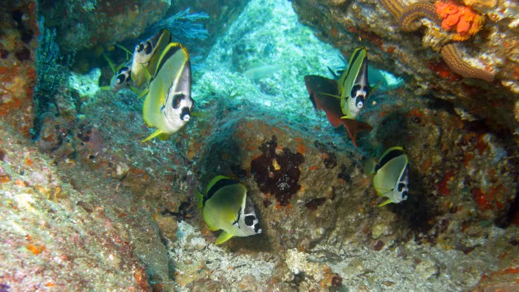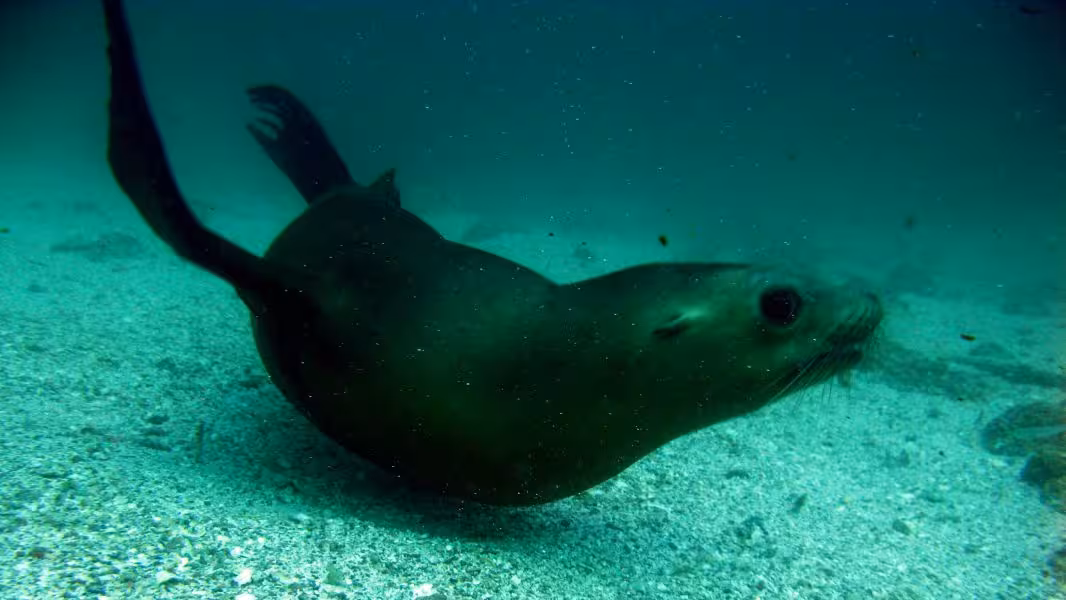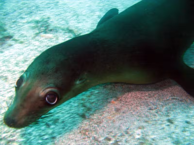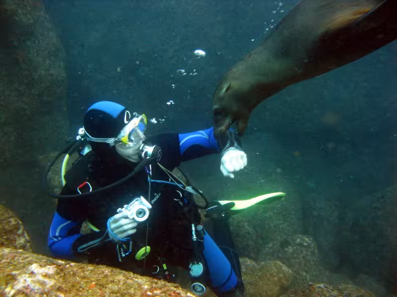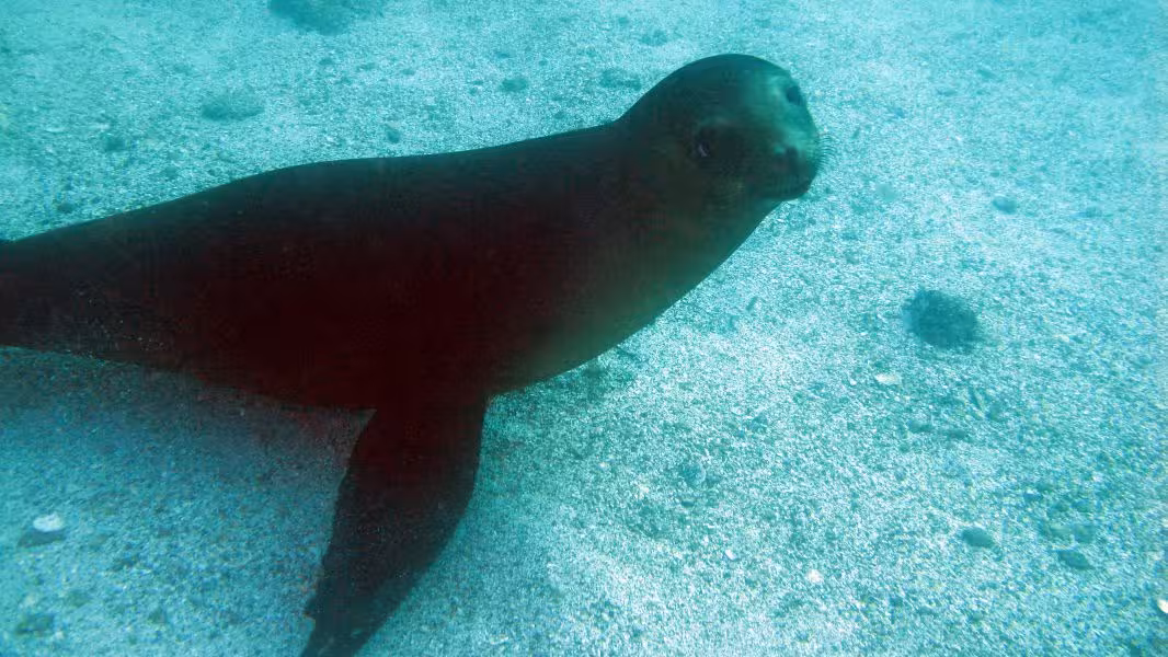 Der Blick vom Tauchdeck ist vielversprechend: Überall an der Wasseroberfläche tollen schon die Seelöwen herum, nur ein paar Meter vom Schiff entfernt. Also rein in die Wurstpelle, ab ins Wasser und abgetaucht. Die Löwen lassen sich nicht lange bitten, wie verspielte junge Hunde erkunden sie ihre Umgebung durch freundliches Beißen in Flossen, Arme und Hände, die man daher besser zu Fäusten ballt. Mit Vorliebe zerren sie auch an Kopfhauben, sodass das Material einer ziemlichen Zerreißprobe ausgesetzt wird. Nicht immer wird die bestanden, wie man nach dem Tauchgang bei dem ein oder anderen feststellen kann, da ist Flicken oder Investieren in neues Material vonnöten. Gehen die jungen Hunde dann aber an die Schläuche des Atemreglers, sollte man vielleicht doch besser eingreifen, ein freundlicher Klaps auf die Nase reicht da schon, um die Kollegen dazu zu bewegen, sich mit etwas anderem zu beschäftigen. Nach einer halben Stunde haben sich unsere neuen Freunde ausgetobt und wir ziehen weiter, um noch das restliche Leben in Augenschein zu nehmen. An Fischen gibt es die üblichen Verdächtigen, dazu hat es auch ein paar Nacktschnecken. Ein etwa 30 m langer Tunnel führt auf der Ostseite durch den Felsen hindurch. Die Gegenströmung und die Dünung machen das Durchtauchen etwas anstrengend. Noch anstrengender sind aber auch hier einige Seelöwen, die sich nicht um unseren Kampf gegen die Elemente scheren und ständig an unseren Kopfhauben zerren. Mit der Strömung von vorn und den Löwen im Nacken schaffen wir es schließlich aber doch durch den Tunnel und werden auf der anderen Seite mit Tonnen von Fisch belohnt. Insbesondere Zackis scheinen sich auf der Nordseite von Los Islotes besonders wohl zu fühlen.