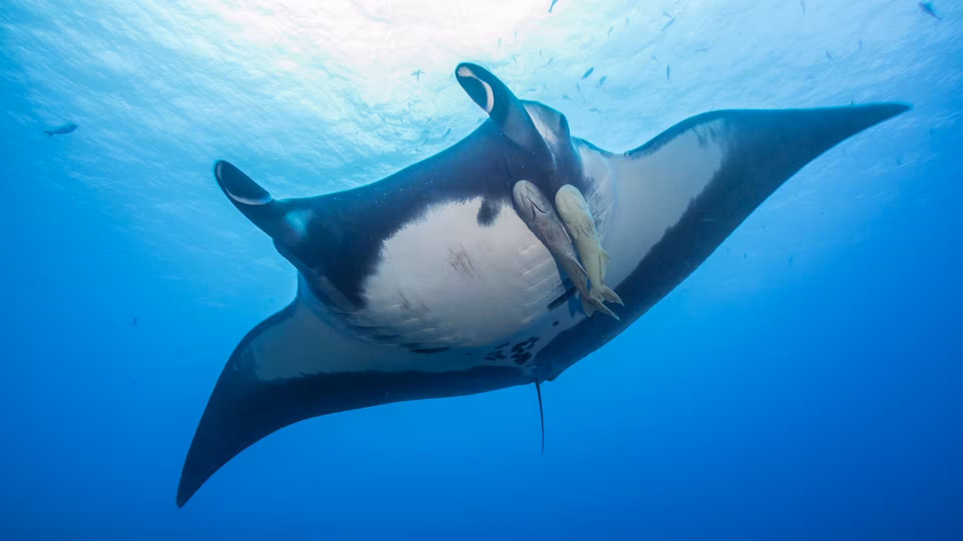 Die kommen an Tauchgang 2 in Form von zwei Seidenhaien vorbei, die einem herannahenden Manta Geleitschutz geben. Zumindest sieht es erst so aus. Beim genaueren Hinschauen bemerken wir allerdings, dass die Haie den Manta als Bimsstein benutzen. Sie schwimmen nahe an ihn ran, drehen sich auf die Seite und schubbern sich dann an seinem Flügel die Parasiten von der Haut. Großartiges Schauspiel und auch noch nie zuvor gesehen dieses Verhalten!