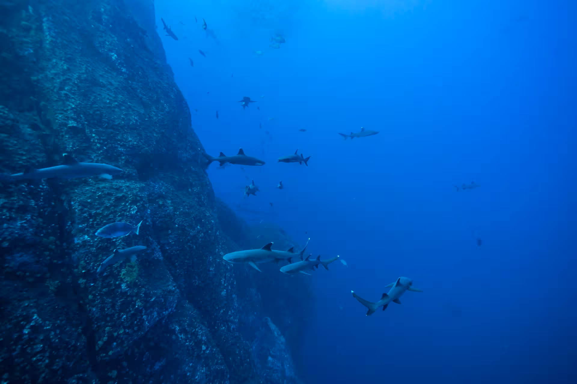 Unter Wasser ist das Konzept dagegen hervorragend. Wir haben den Kopf noch nicht ganz im Wasser, da sind schon ein paar Delfine da und tollen ein paar Minuten mit uns herum. An der Westspitze des Felsens treffen wir auf eine Armee aus Silberspitzen, die es sich in der Strömung gut gehen lässt. In jedem kleinen Felsvorsprung stapeln sich aufgrund des beschränkten Platzes die Weißspitzen übereinander; auch ein bekanntes Roca Partida-Fotomotiv, welches ich so von keinem anderen Platz auf der Welt kenne. Ansonsten kommt das Hai-Aufkommen aber erstaunlich dünn daher. Wir sehen ganz vereinzelt mal einen Hammer- oder Galapagoshai. Auch die großen Fischschwärme machen sich rar; lediglich eine Schule Weißmaulmakrelen zieht ihre Runden um den Felsen.