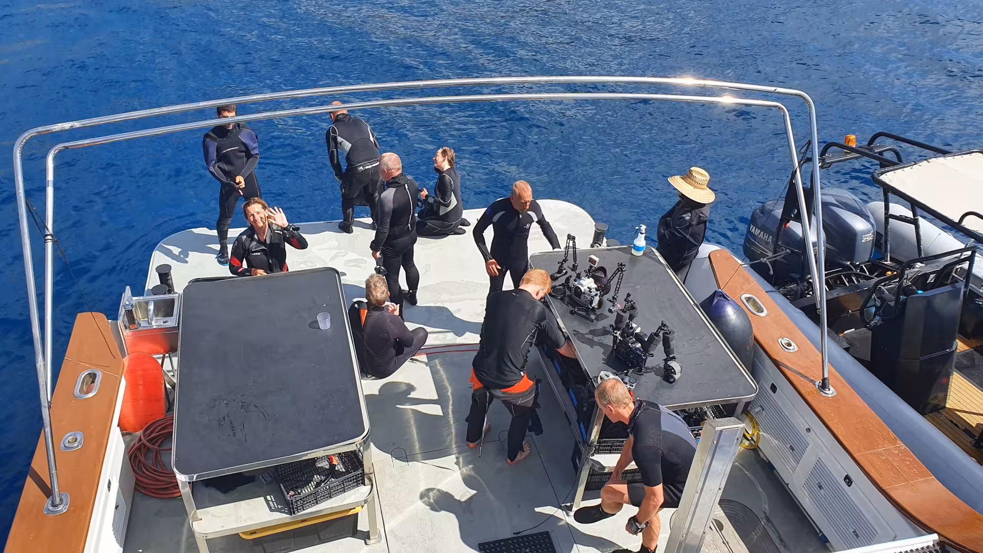 Zu guter Letzt haben wir noch das Tauchdeck mit einer großen Plattform, von dem aus man bequem in das mitgeführte RHIB ("Rigid-Hulled Inflatable Boat" oder auch "Festrumpfschlauchboot") umsteigt, mit dem man zu den Tauchplätzen fährt. Zu meinem Erstaunen führt die Gallant Lady nur eine einzelnes großes RHIB mit sich, d.h. unsere beiden Sechser-Tauchgruppen werden zusammen abfahren und müssen auch zusammen wieder eingesammelt werden. Ob das so gut funktioniert, muss sich dann noch zeigen. Das Tauchgerödel bleibt während des Trips auf dem RHIB und wird nur für die Überfahrten zwischen den Inseln auf die Gallant Lady umgeladen. Ob diese Vorgehensweise beim Design des restlichen Teils des Tauchdecks, den man über 2 Stufen von der Plattform aus erreicht, eine Rolle gespielt hat, vermag ich nicht zu sagen. Er wird zu einem großen Teil von 2 Tischen eingenommen, auf und unter denen man seinen Krimskram in Körben verstauen kann. Was komplett fehlt, sind Sitzmöglichkeiten zum Anziehen des Neos. Für das Spülen der Ausrüstung werden Plastiktonnen bereitgestellt. Gut am Tauchdeck sind die großen Kameratische, die reichlich Platz für allerlei elektronisches Equipment bieten, sowie die zahlreich vorhandenen Steckdosen (amerikanische Bauart). Unbeaufsichtigtes Laden ist aus Feuerschutzgründen nur hier erlaubt, nicht in den Zimmern. Was leider fehlt, ist eine Luftdusche für Kameras.