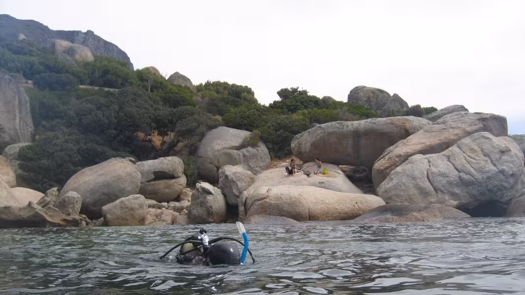 Der Einstieg zu diesem Platz erfolgt über einen der belebten Badestrände Kapstadts. Beim ersten Mal kommt man sich schon etwas merkwürdig vor, wenn man in voller Montur mit Kopfhaube und Handschuhen bei über 30 Grad da so zwischen den Badegästen entlang marschiert, aber beim zweiten Mal macht es einem schon nichts mehr aus. Auch am Clifton Beach gibt es einen kleinen Kelpwald, der es aber nicht ganz mit dem an den Twelve Apostels aufnehmen kann. Auch gibt es hier keine Seehunde, weswegen die 12 Apostels meiner Ansicht nach die bessere Alternative sind. Nett ist, dass beim Ausstieg schon die Polizei auf einen wartet. Nicht, um den geneigten Tauchern vor den in Kapstadt doch auch zahlreich vorhandenen Kriminellen zu beschützen, sondern um zu kontrollieren, dass man nichts unerlaubt aus dem Meer mitgehen lässt, insbesondere keine Langusten. Das erledigt dann schon die Langustenmafia des Nachts, wenn die Polizei nicht am Start ist.
