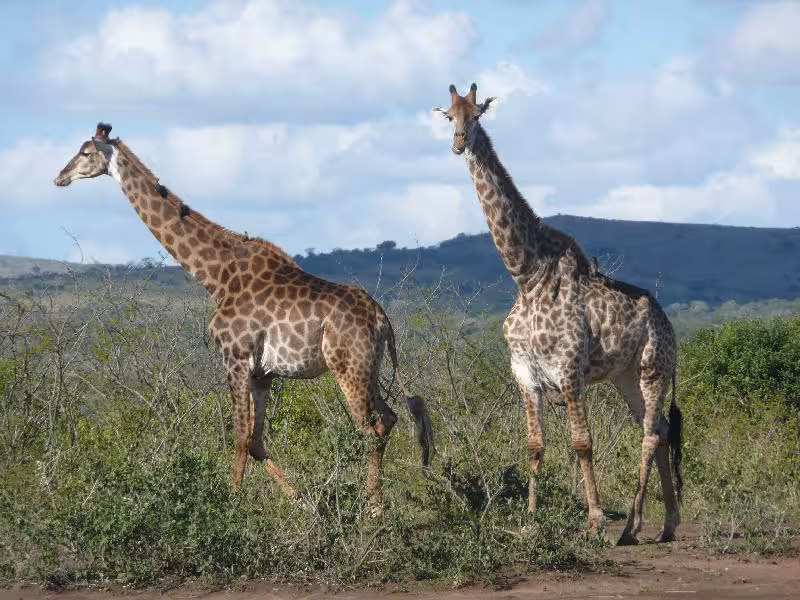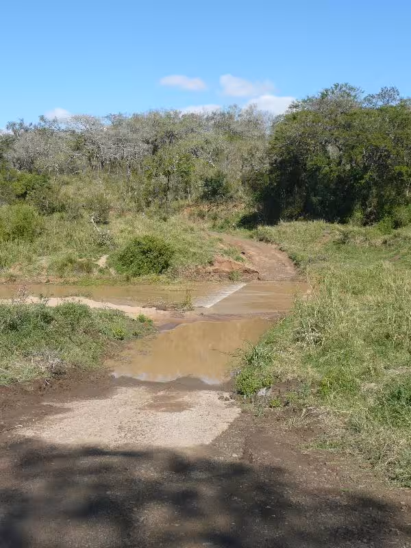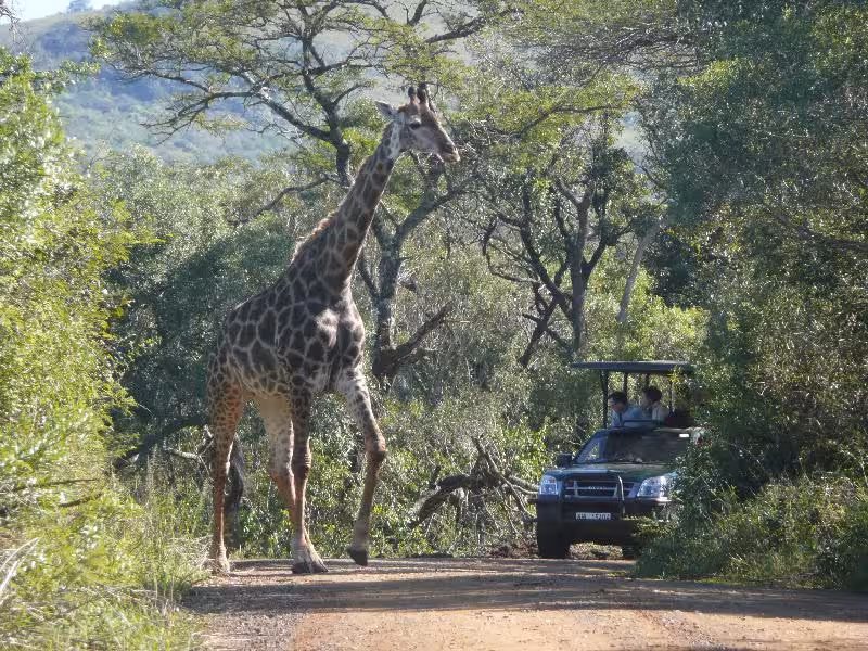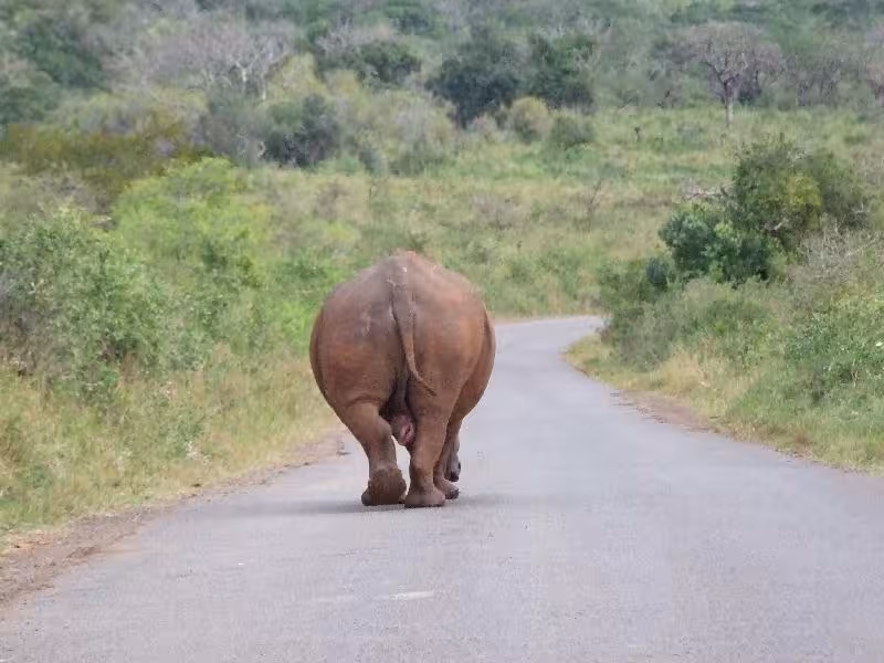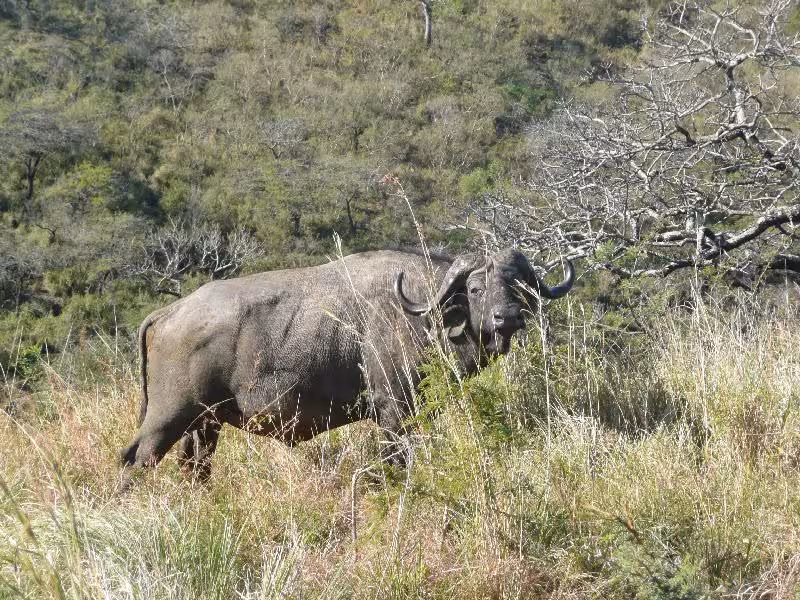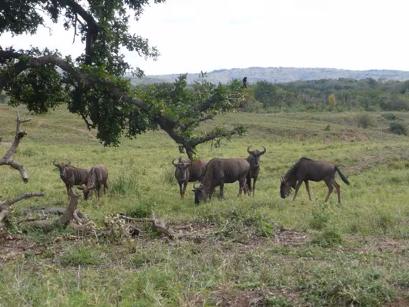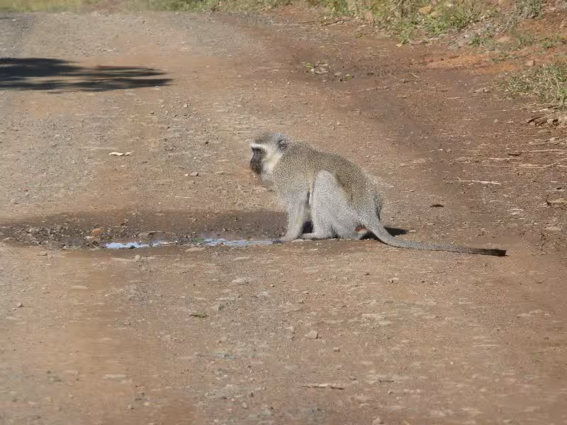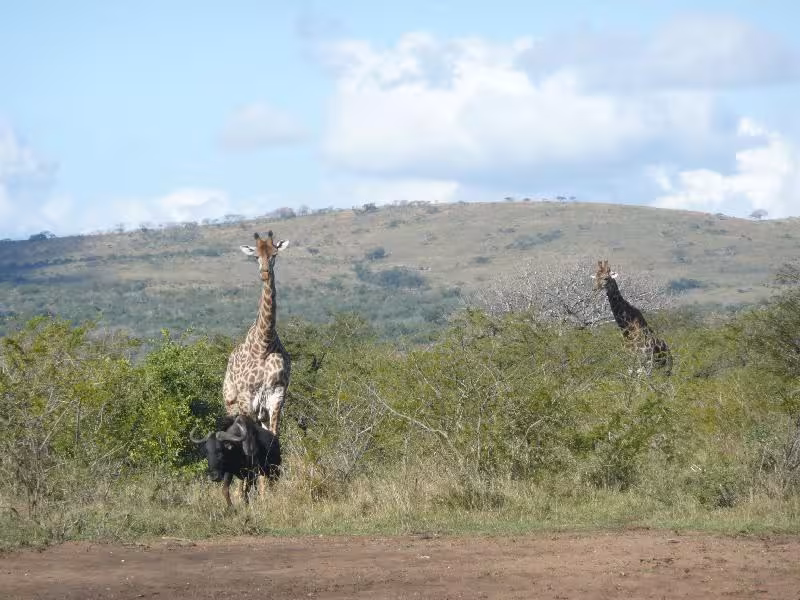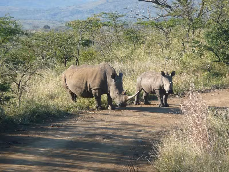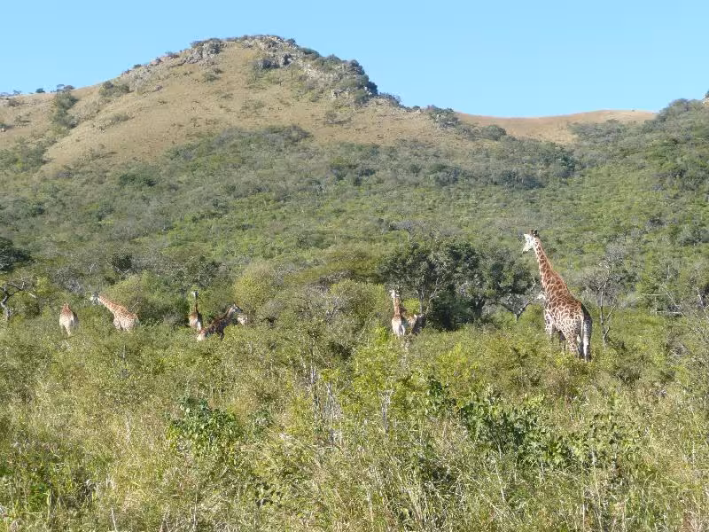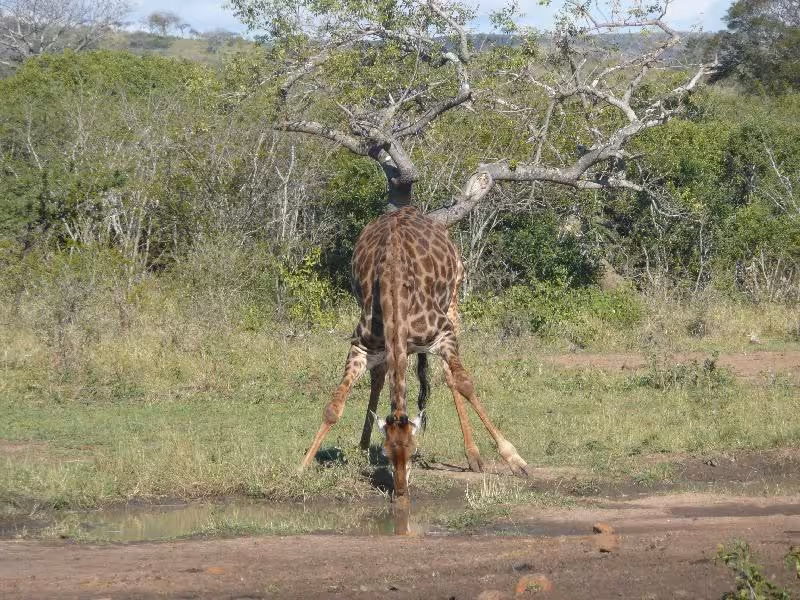Nachdem wir gestern den Umfolozi-Park abgeklappert haben, nehmen wir uns heute den Hluhluwe-Teil vor. Schon bald macht eine Giraffenherde ihre Aufwartung, unter die sich ein paar Zebras gemischt haben. Meerkatzen sitzen in den Bäumen oder stillen ihren Durst aus vereinzelten Pfützen, die der Regen in den Schlaglöchern der Schotterpisten hinterlassen hat. Wieder treffen wir auf Gnus, Impala-Herden, Warzenschweine und Kaffernbüffel. Elefanten kriegen wir heute nur aus großer Entfernung zu sehen. Dafür hat es sich an einem Wasserlauf ein junges Nilkrokodil gemütlich gemacht. An einem Wasserloch beobachten wir eine junge Giraffe beim Trinken. Stunden dauert es, bis sie sich nach ausgiebiger Erkundung der Umgebung endlich entschließt, den Kopf zu senken und ihren Durst zu stillen, da sie in dieser Position keine Chance hat, evtl. auflauernden Feinden zu entkommen. Wenig später ist es nach dem Elefanten von gestern heute eine Nashornmutter mit ihrem Jungen, die uns an der Weiterfahrt hindert. 20 Minuten lang stehen sie auf der Straße und scheinen unschlüssig zu sein, wie es weitergehen soll. Schließlich verziehen sie sich ins Gebüsch und wir beenden unsere 8-stündige Tour und kehren in die Hluhluwe Lodge zurück, wo wir für morgen noch zwei schnelle Tauchgänge in Sodwana Bay organisieren.