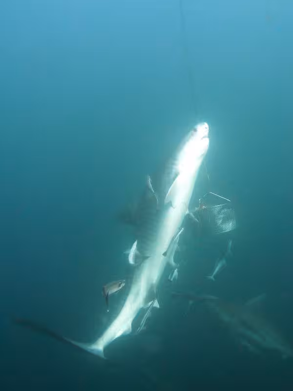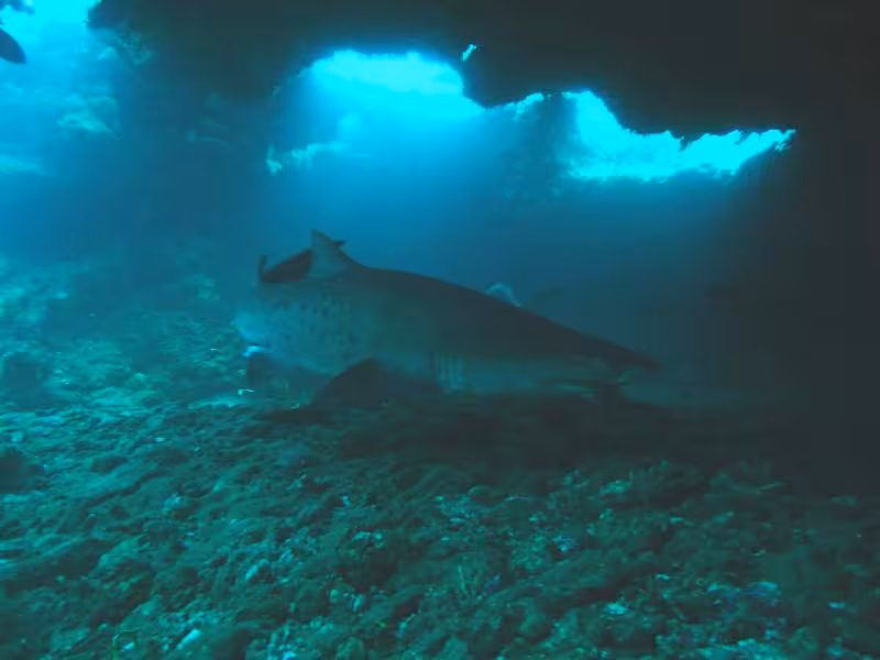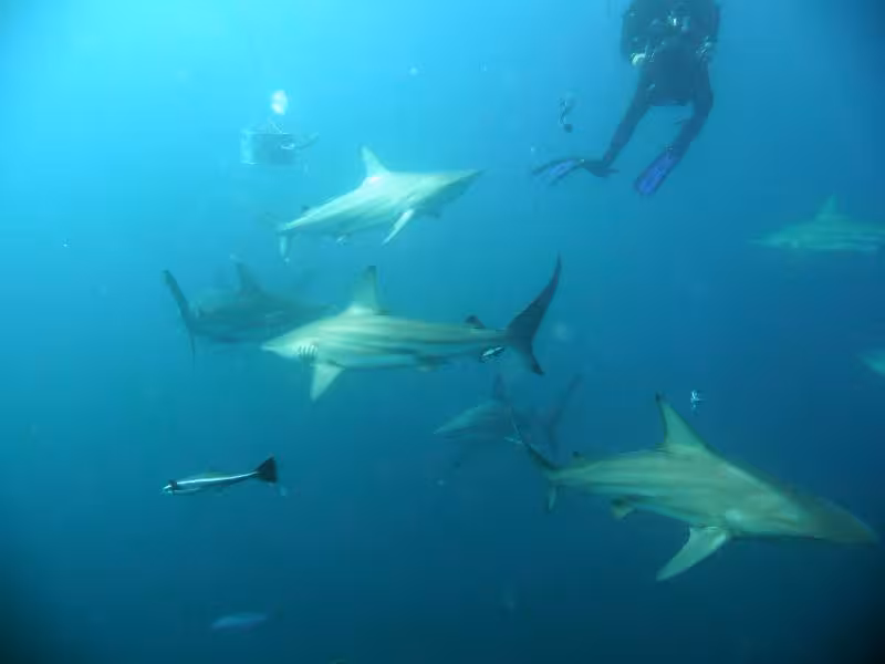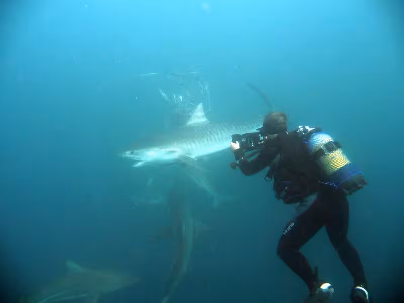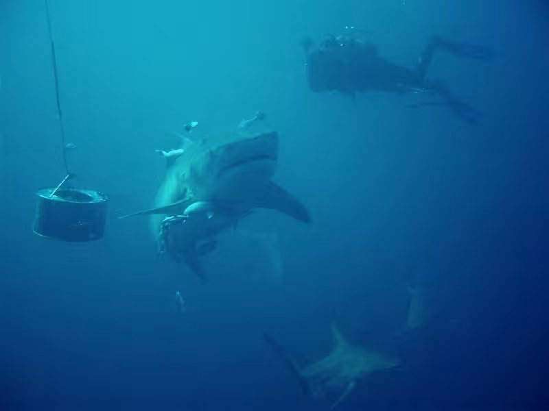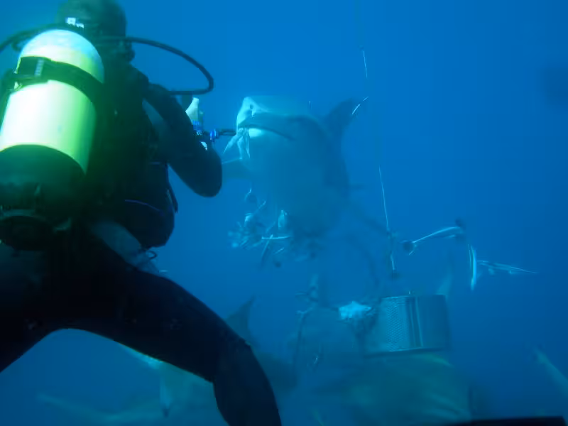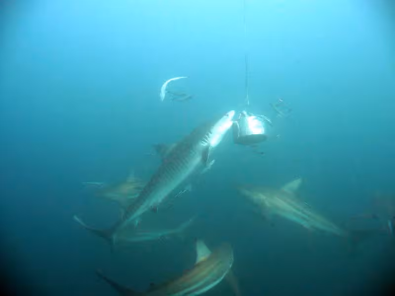 Nachdem Lloyd sein Briefing beendet hat, warten wir noch ca. 45 Minuten, bis sich an der Tonne etwas tut. Dann geht alles ganz schnell und schwupps sind wir im Wasser. Was sich dann vor meinen Augen abspielt, ist mit Worten nicht zu beschreiben. Zwei Dutzend Schwarzspitzenhaie wuseln hektisch um die Tonne herum, machen sich daran zu schaffen, drehen ab, ziehen ein Runde und bahnen sich durch unsere Gruppe hindurch den Weg zurück zur Tonne. Völlig anders dagegen die 3 Tigerhaie, ruhig und gemächlich ziehen sie ihre Bahnen, beäugen uns, drehen einen Bogen und schwimmen dann langsam an uns vorbei, um ihren Teil des Festmahls abzubekommen. Fast sieht es so aus, als wären sie sich ihrer Überlegenheit bewusst, sie sind hier die Chefs im Ring. Zwei der Tiger sind noch sehr jung, gut sind die schwarzen Streifen auf dem Körper dieses wunderschönen Tieres zu sehen. Das dritte Exemplar ist etwas älter und größer (ca. 3 m) und die Streifen dementsprechend schon etwas verblasst. Eine volle Stunde lang bleiben sie uns und der Tonne treu. Völlig euphorisch und begeistert steigen wir danach aus dem Wasser und zurück aufs Boot.