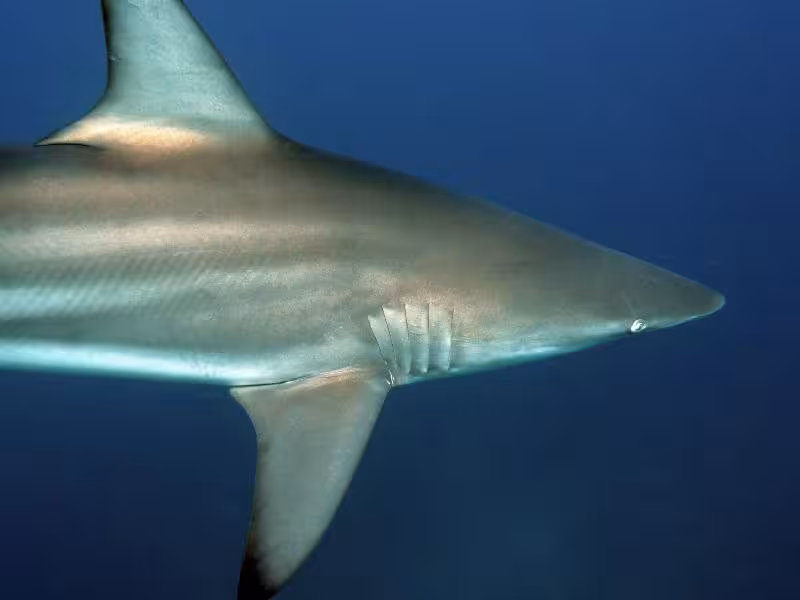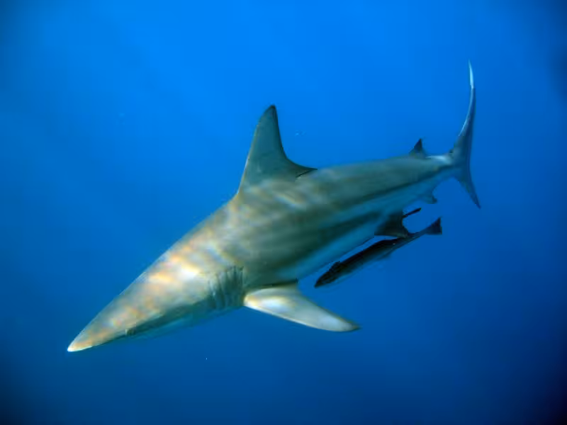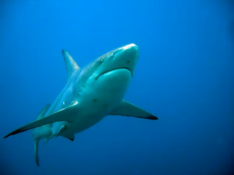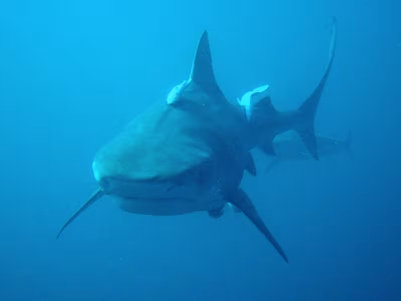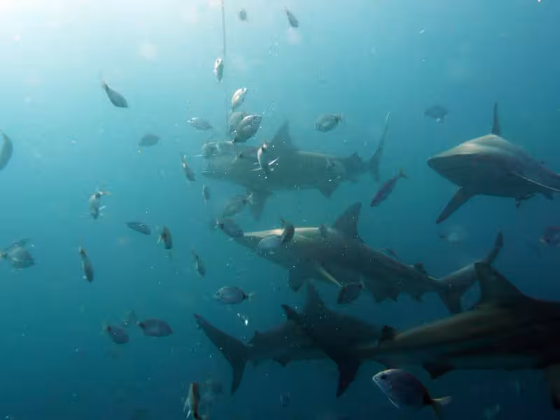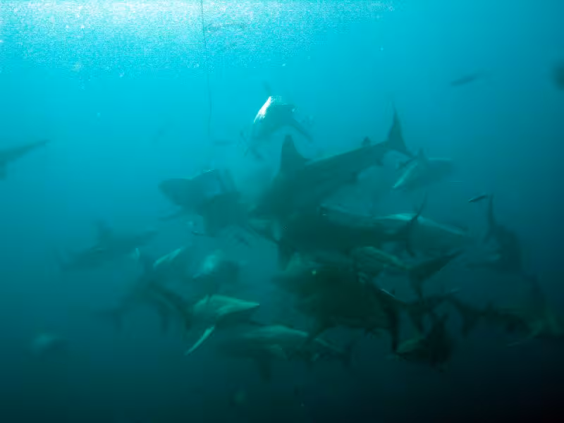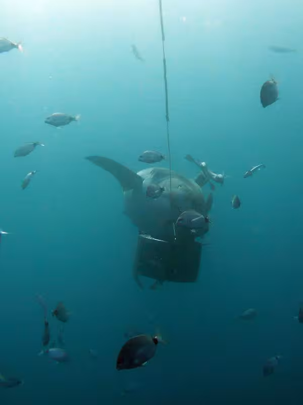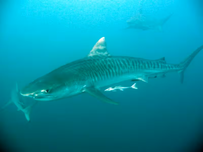 Nachdem Lloyd sein Briefing beendet hat, warten wir noch ca. 45 Minuten, bis sich an der Tonne etwas tut. Dann geht alles ganz schnell und schwupps sind wir im Wasser. Was sich dann vor meinen Augen abspielt, ist mit Worten nicht zu beschreiben. Zwei Dutzend Schwarzspitzenhaie wuseln hektisch um die Tonne herum, machen sich daran zu schaffen, drehen ab, ziehen ein Runde und bahnen sich durch unsere Gruppe hindurch den Weg zurück zur Tonne. Völlig anders dagegen die 3 Tigerhaie, ruhig und gemächlich ziehen sie ihre Bahnen, beäugen uns, drehen einen Bogen und schwimmen dann langsam an uns vorbei, um ihren Teil des Festmahls abzubekommen. Fast sieht es so aus, als wären sie sich ihrer Überlegenheit bewusst, sie sind hier die Chefs im Ring. Zwei der Tiger sind noch sehr jung, gut sind die schwarzen Streifen auf dem Körper dieses wunderschönen Tieres zu sehen. Das dritte Exemplar ist etwas älter und größer (ca. 3 m) und die Streifen dementsprechend schon etwas verblasst. Eine volle Stunde lang bleiben sie uns und der Tonne treu. Völlig euphorisch und begeistert steigen wir danach aus dem Wasser und zurück aufs Boot.