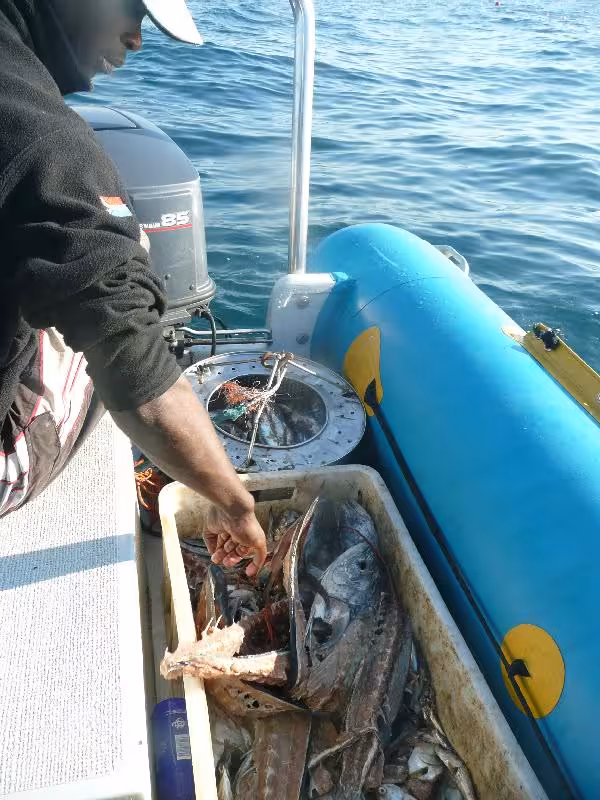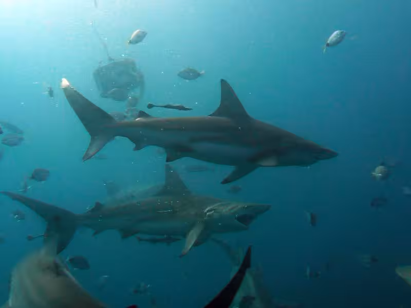 So gebrieft fühle ich mich eigentlich ganz gut, kann ja praktisch nichts passieren. In den 6 Jahren, in denen African Watersports das hier macht, hat es auch erst zwei Zwischenfälle gegeben. Einer Taucherin hat ein Tiger von hinten in die Flasche gebissen, einer anderen in den Kopf. Er muss aber wohl glücklicherweise abgerutscht sein, die Wunde musste "nur" mit 6 Stichen genäht werden. In beiden Fällen wurden anscheinend die Sicherheitsregeln verletzt (Augenkontakt nicht gehalten bzw. zum Boden gesunken). Menschliches Versagen also, nicht das des Hais. Ein letzter Rest Mulmigkeit ist allerdings schon noch vorhanden, immerhin gilt der Tigerhai als gefährlichster Hai in tropischen Gewässern. Allerdings ist die absolute Anzahl an Unfällen äußerst gering. Das ist hier zwar kein Zoo, aber eben auch keine deutsche Autobahn, wo es deutlich gefährlicher zugeht ...