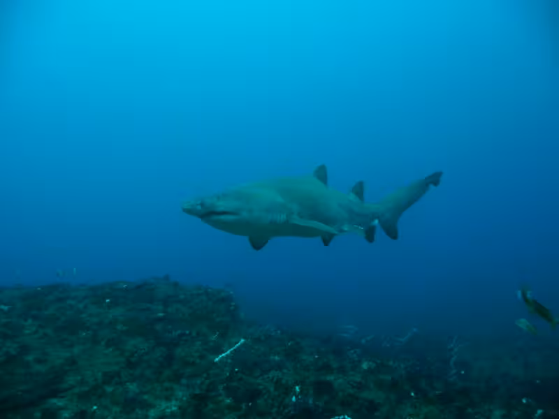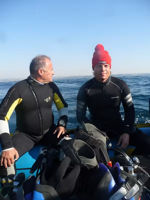 Heute versuchen wir unser Glück nochmal an den Protea Banks, die letzte Chance, vielleicht doch noch ein paar "Raggies" zu sehen, wie die Sandtiger hierzulande genannt werden. Der erste Tauchgang an den Southern Pinnacles verläuft ziemlich ergebnislos, vor lauter Verzweiflung fotografiere ich sogar meine Mittaucher. Erfolgsmeldung dafür beim 2. Tauchgang, in den Höhlen liegen heute immerhin so an die 20 Raggies. Na also. Nachdem ich sie 5 Minuten lang beobachtet habe, frage ich mich allerdings, warum ich sie unbedingt sehen wollte. Sandtiger sind nämlich extreeeem träge. Eigentlich hovern sie nur bewegungslos einen halben Meter über dem Meeresgrund und bewegen sich ansonsten möglichst überhaupt nicht. Genau wie ich halt. Unfassbar finde ich, dass dieser Hai zusammen mit dem Bullenhai an Platz 3 der Haiunfallstatistik stehen soll (hinter Weißem Hai und Tigerhai). Wie kann es mit so einem Tier, dass ich fast schon als lahmarschig bezeichnen würde, zu Unfällen kommen? Da muss der ein oder andere U/W-Idiot versucht haben, dem Hai einen Knoten in die Rückenflosse zu machen oder eine neue Frisur zu verpassen, anders kann ich mir solche Zahlen nicht erklären. Wie auch immer, da die Raggies nun schon mal hier sind und ich zufällig auch, nutze ich die Chance und springe mit Michael und Roland noch zu einem 3. Tauchgang ins Wasser, während der Rest der Truppe die andere Option wahrnimmt, und sich schon mal unter die heiße Dusche begibt. Auch eine Alternative ... Unsere finde ich aber spätestens in dem Moment besser, in dem vor dem Sprung ins Wasser 10 m hinter unserem kleinen Schlauchboot ein südlicher Glattwal vorbeizieht. Ratzfatz ist Michael samt Kamera im Wasser, aber beim Sprung ins Wasser verliert er wohl etwas die Orientierung. Der Wal ist jedenfalls verschwunden, bevor Michael auf den Auslöser drücken kann. Schade ...