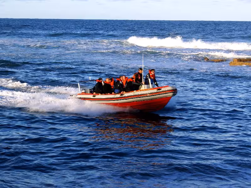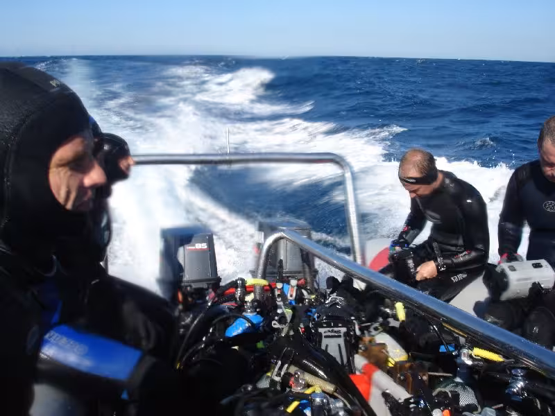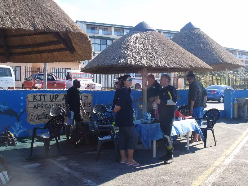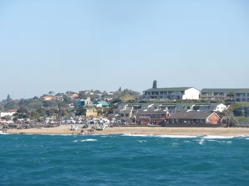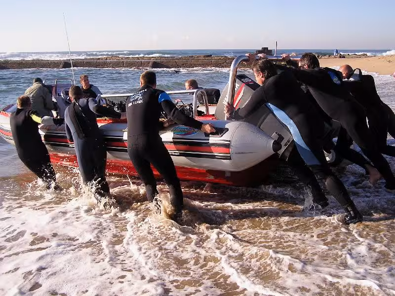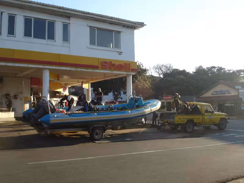 Früh am nächsten Morgen wartet schon Roland Mauz von African Dive Adventures am Hafen auf uns. Nach ausführlichem Briefing zerren wir das Gummiboot ins Wasser und los geht's rüber zu den Protea Banks, 7 km vor der Küste. Die Fahrt ist extrem ruppig, hart schlägt das Boot nach jeder Welle auf dem Wasser auf und bereits nach wenigen Metern ist man völlig durchnässt. Aber das wollen wir ja gleich eh sein. Auf Kommando hüpfen wir gemeinsam vom Boot, tauchen ab und lassen uns von der Strömung übers Riff ziehen. Viel ist nicht zu sehen, aber immerhin sichten wir einen Bullenhai, der uns in sicherer Entfernung passiert. Nach einer guten halben Stunde ist der Spaß vorbei und zurück an der Oberfläche beginnt erst die richtige Arbeit. Die Wellen sind inzwischen 3 m hoch und erschweren den Einstieg ins Gummiboot doch sehr. Auch hat es eine Fatzen-Strömung, ist man nur 2 m vom Boot weg, hat man kaum eine Chance, es zu erreichen, weswegen der Käpt'n ziemlich manövrieren muss. 15 Minuten dauert es, bis endlich alle 10 Personen im Boot sind und schon geht's zurück zur Küste. Die Rückfahrt ist noch heftiger als die Hinfahrt und da der Wind im Laufe des Tages noch auffrischen soll, ist es schon klar, dass dies unser einziger Tauchgang heute bleiben wird. Auch für morgen ist stürmisches Wetter angesagt, sodass die Tauchgänge an den Protea Banks werden ausfallen müssen. Unser Wetterglück hat uns wieder eingeholt.