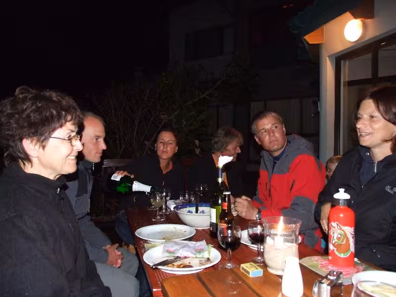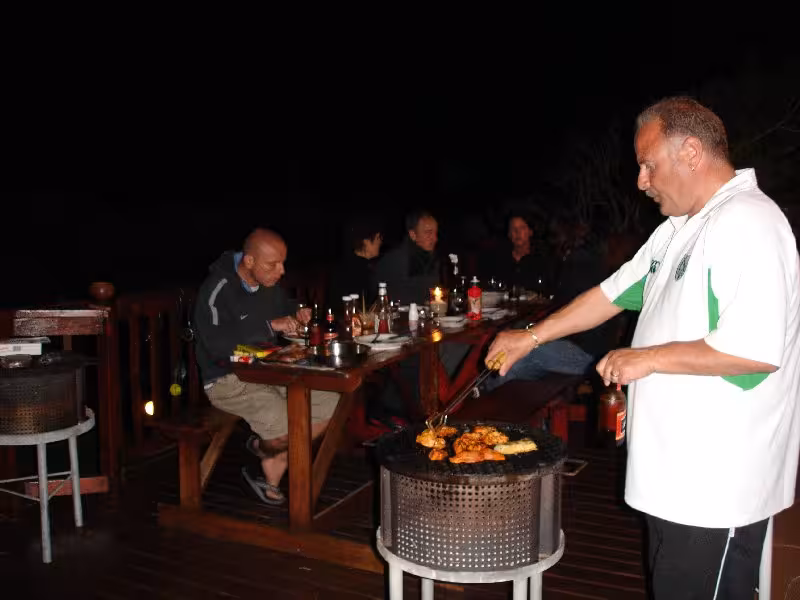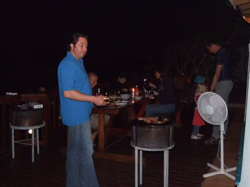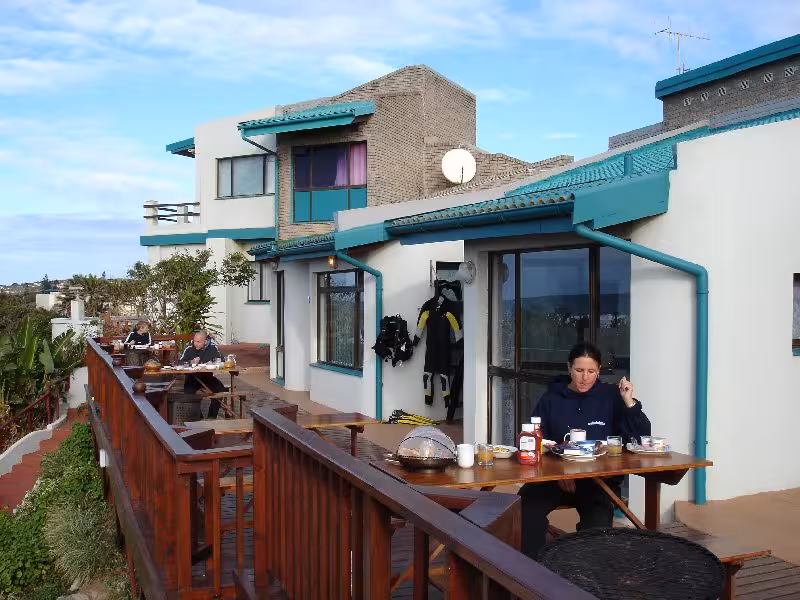 Video: Sandtiger an den Protea Banks [02:28 Min.]Unser Urlaub neigt sich dem Ende und da man den Urlaub mit einem Hailight abschließen soll, begeben wir uns nochmal kollektiv nach Umkomaas zu einem 2. Tigerhai-Tauchgang. Während es vorgestern noch eine gespannte Erwartung vor dem Sprung ins Wasser war, ist es heute reine Vorfreude. Es dauert wieder ca. eine Stunde, bis die Haie da sind. Neben den 20 Schwarzspitzen ist es heute allerdings "nur" ein Tiger, was angesichts der trüben Sicht, die wir heute haben, aber auch ganz gut ist, da es sehr leicht fällt, dieses eine Exemplar im Auge zu behalten. So nehmen unsere Unterwasseraktivitäten einen schönen Abschluss. Abends klingt die Tour mit einer großen Grillparty - Tschuldigung - einem großen Braai auf der Terrasse des Breakerview aus. So wechseln interessante südafrikanische Köstlichkeiten, wie z.B. die allseits beliebte Buurewoos, auf dem Grill ihren Aggregatszustand - eben noch ein 1 Meter langes, spiralenartig zusammengerolltes glibberiges Etwas, kurze Zeit später ein durchgegartes Stück Fleisch, was sich mit einem Kilo Heinz Ketchup und 'nem Dosenbier relativ gut die Speiseröhre hinunterbefördern lässt.