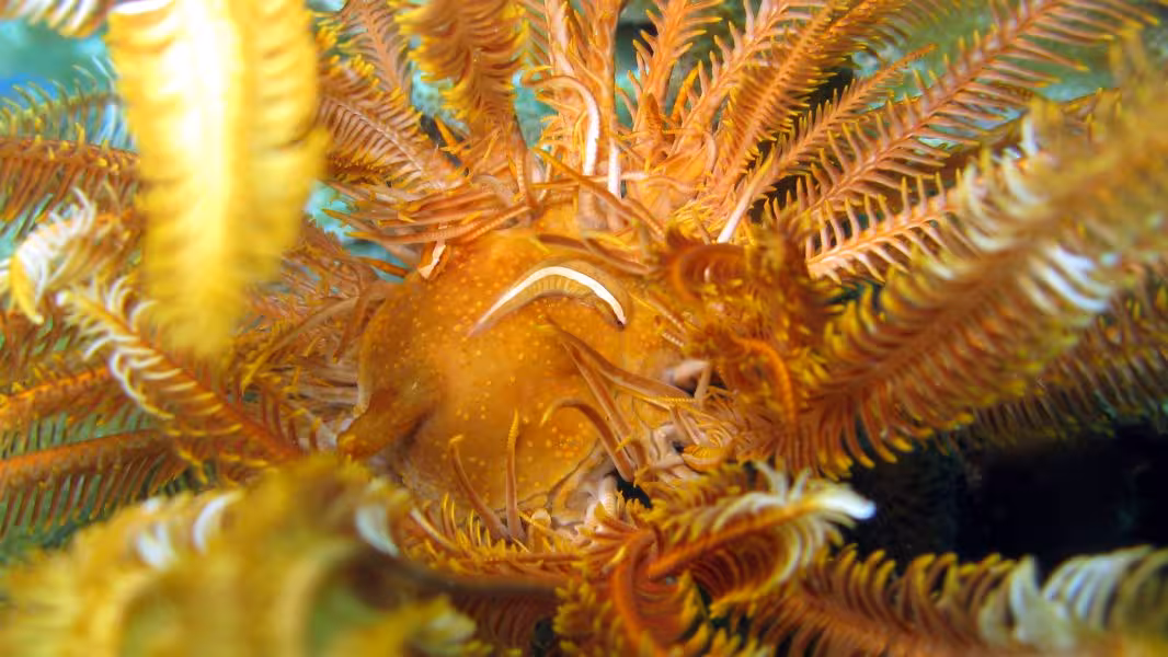 Für den dritten Tauchgang kurven wir schnell um die Ecke in die nächste Bucht und springen dann an Reflections I ins Wasser. Auch hier ein ähnliches Bild wie zuvor an den fröhlich endenden Felsen, klar, warum sollte es auch anders sein. Höhepunkt hier ist der Wobbegong, der es sich unter einem Überhang bequem gemacht hat. Seit über 10 Jahren habe ich keinen mehr gesehen, das letzte Mal kurz nach der Jahrtausendwende im Darwin Harbour. Auch nett ist die schwangere Gebänderte Seenadel und ein herumspringendes, irres Etwas, was Deirdre als "Dancing Dot" bezeichnet – vermutlich eine juvenile Ausgabe irgendeines Fisches, die tatsächlich nur so groß wie ein Punkt und daher viel zu klein für das Ablichten mit meiner Kompaktknipse ist. Der Nachttauchgang am gleichen Platz hält im Wesentlichen viele, viele Federsterne für uns bereit, in denen sich kleine Krebse und Mini-Fische vor ihren Feinden verstecken. Insgesamt betrachten wir den ersten Tag als Appetithappen auf mehr außergewöhnliches Unterwassergetier, welches Raja Ampat hoffentlich noch bereithält. Appetitlich geht es auch beim Abendessen zu, Chefkoch André fährt ordentlich auf – Hunger werden wir in den nächsten 2 Wochen nicht leiden müssen. Es geht im Essbereich allerdings etwas eng zu, der Platz ist für 8 Gäste plus Guide deutlich unterdimensioniert. Das hat auch der Betreiber des Bootes erkannt und nimmt für zukünftige Touren nur noch 6 Gäste an.