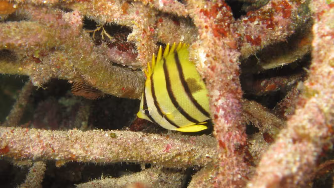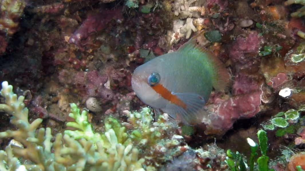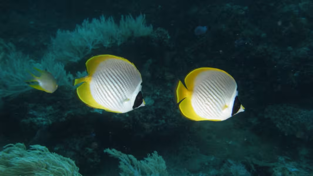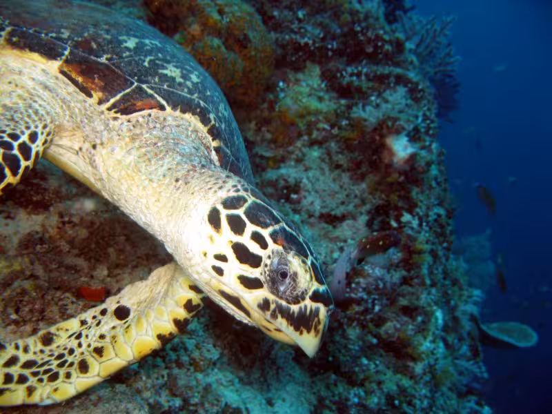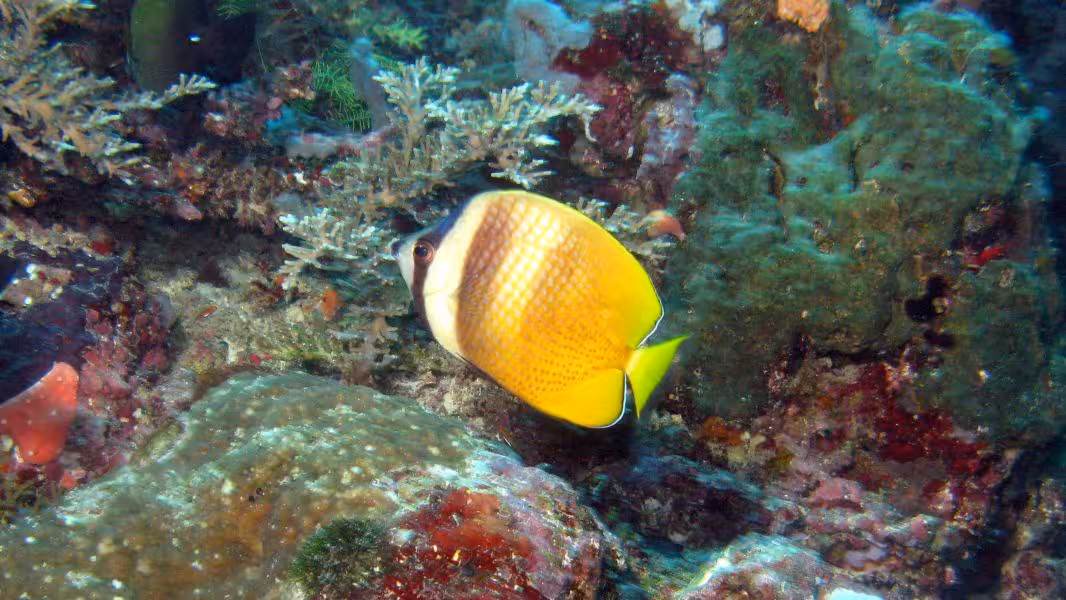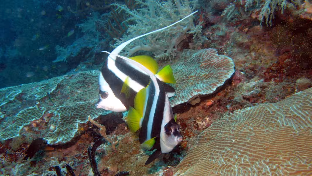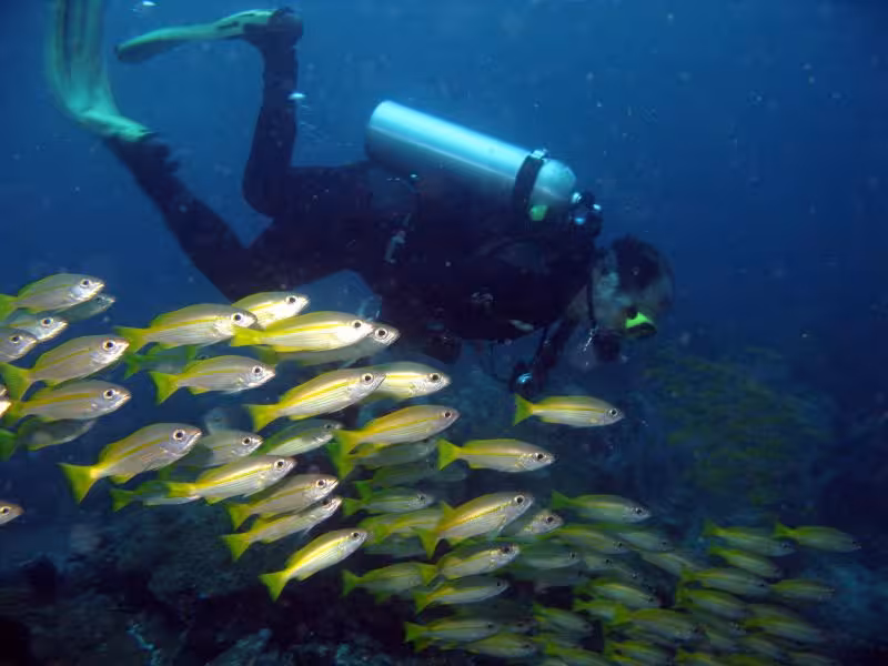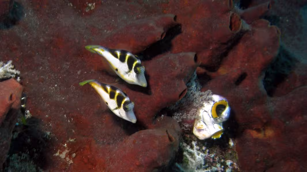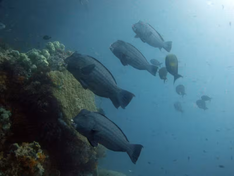 Unser 4. Tauchtag startet mit einer frühen Schlauchbootfahrt zum Boo Window. Der graue Himmel sieht nicht so aus als wolle er heute nochmal die Sonne durchlassen. Heftig prasselt uns der Regen ins Gesicht, sodass wir froh sind, als wir uns endlich eine Etage tiefer begeben können. Wir folgen einem im 45 Grad-Winkel abfallenden Hang, auf dem von Korallenbewuchs nichts zu sehen ist. Ein Occi ahnt wohl, wie es an der Oberfläche aussieht und zieht sich ganz tief in seine Behausung zurück. Nach 20 Minuten Tauchzeit macht der Hang einen Bogen und auf einmal strömt es uns ordentlich entgegen, sodass wir kräftig paddeln müssen, um um die Ecke zu kommen. Der positive Nebeneffekt der Strömung heißt Fisch, Barrakudas, Blauflossen- und Pferdemakrelen, Fledermausfische und Schnapperschwärme hängen im Blauwasser ab. Ein Napoleon streift übers Riff, gefolgt von einer Karettkröte und einer Horde Büffelkopfpapageien. Kurze Zeit später erreichen wir die Namensgeber des Platzes, drei große Löcher im Fels erlauben wie durch ein Fenster den Blick auf die andere Seite des Riffes. Beim Flug durch einen kleinen Kanal passiert uns noch eine Zitronenmakrele und ein zutrauliches Falterfisch-Pärchen, bevor wir kurz darauf diesen prima Tauchgang beenden.