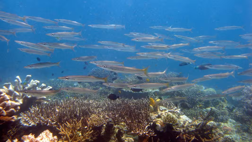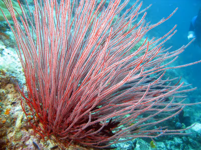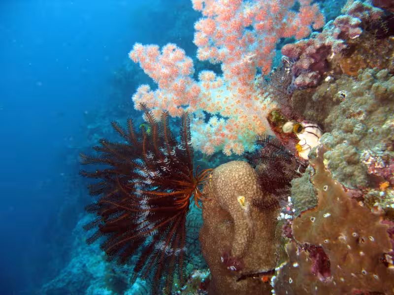 Der Korallenrücken hört auf den Namen Reflections Ridge und fördert viele kleine silbrige Kugeln zutage, die sich anfühlen wie Tischtennisbälle. Während wir noch die Kugeln betrachten, bei denen es sich eigentlich um Algen handelt, kreuzt eine Qualle mit mindestens 5 m langen Tentakeln unseren Weg. Keiner weiß, um was es sich dabei handelt, deswegen halten wir lieber respektvoll Abstand, denn lange Tentakel bedeuten in der Regel nichts Gutes, soll heißen, das Teil könnte giftig sein. Mit jedem Meter wird die Szenerie schöner, am Ende beleuchtet die strahlende Sonne einen wundervollen Korallengarten, über der ein Schwarm junger Barrakudas kitschig seine Kreise zieht. Die Sache mit dem kitschigen Korallengarten gilt auch für unseren finalen Tauchgang vor Batanta an Diversity. Die Killerqualle zeigt sich ein 2. Mal, ansonsten ist es hier einfach nochmal hübsch bunt.