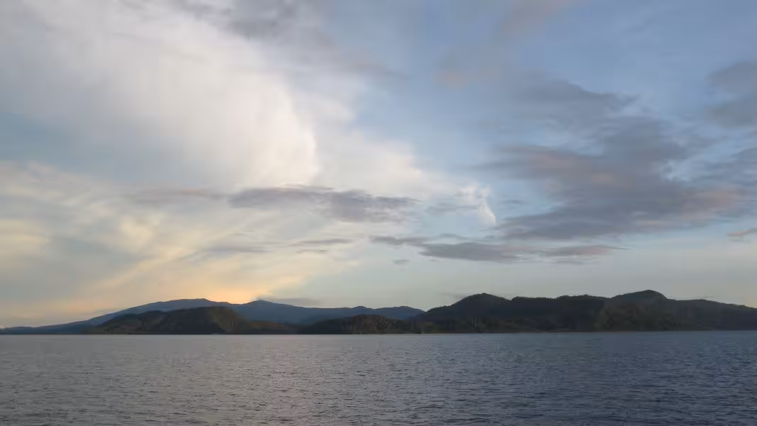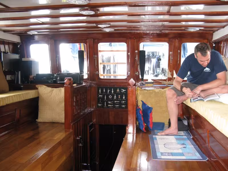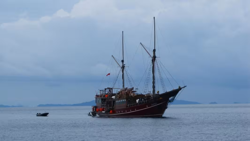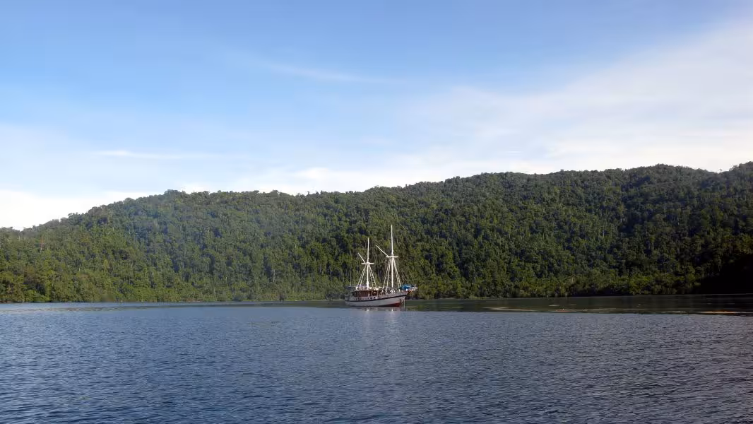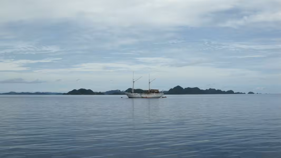 Nach dem Abendessen werden die Segel gehisst, natürlich nur symbolisch, denn die Segel auf der Mandarin Siren sind reine Show und nicht zum Segeln gemacht. Die ganze Nacht durch tuckern wir gen Norden zurück Richtung Batanta. Die Überfahrt ist erstaunlich ruhig, denn eigentlich ist schlechtes Wetter mit rauhem Seegang vorhergesagt. Macht nichts, so haben wir wenigstens trotz des hämmernden Schiffsdiesels eine halbwegs angenehme Nachtruhe.