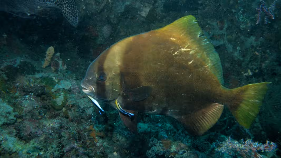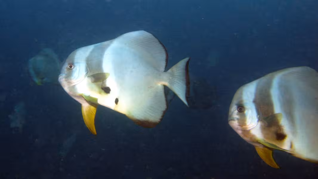 Weihnachten ist rum und auch unser Besuch von Misool neigt sich langsam dem Ende. Heute ist der letzte Tauchtag im tiefen Süden, bevor es noch in der Nacht wieder zurück nach Norden geht. Vorher ist aber noch 4x Tauchen angesagt. Los geht's am Eagle's Nest. Eigentlich wollten wir "Riff rechte Schulter" tauchen, aber die Strömung macht hier, was sie will und zwingt uns in die andere Richtung. Eine Horde von 20 Büffelkopf-Papageien, die uns entgegenkommt, kann über so wenig Schwimmfähigkeit nur müde lächeln und schwimmt in die von uns eigentlich angepeilte Richtung davon. Große Elefantenohrschwämme wachsen auf dem schräg abfallenden Riffhang, der viel Unterschlupfmöglichkeiten für Langusten und andere scheue Meeresbewohner bietet. Dazu gehört auch ein juveniler Fledermausfisch, mein persönliches Highlight bei diesem Tauchgang, da selten gesichtet und mit seinen überdimensionalen Rücken- und Bauchflossen und dem knallorangen Rand um den schwarz-grau-gestreiften Körper fast schon critterverdächtig.